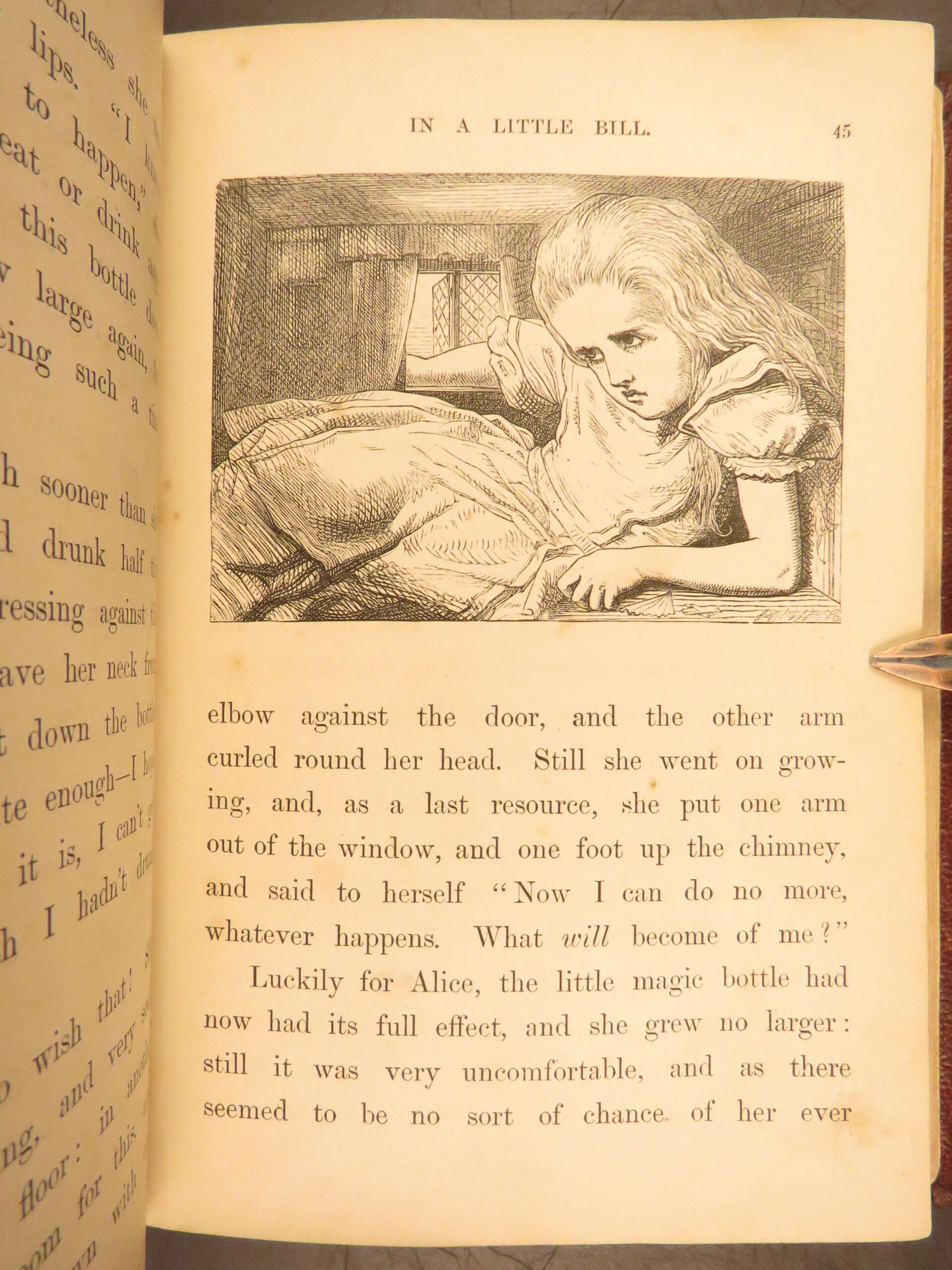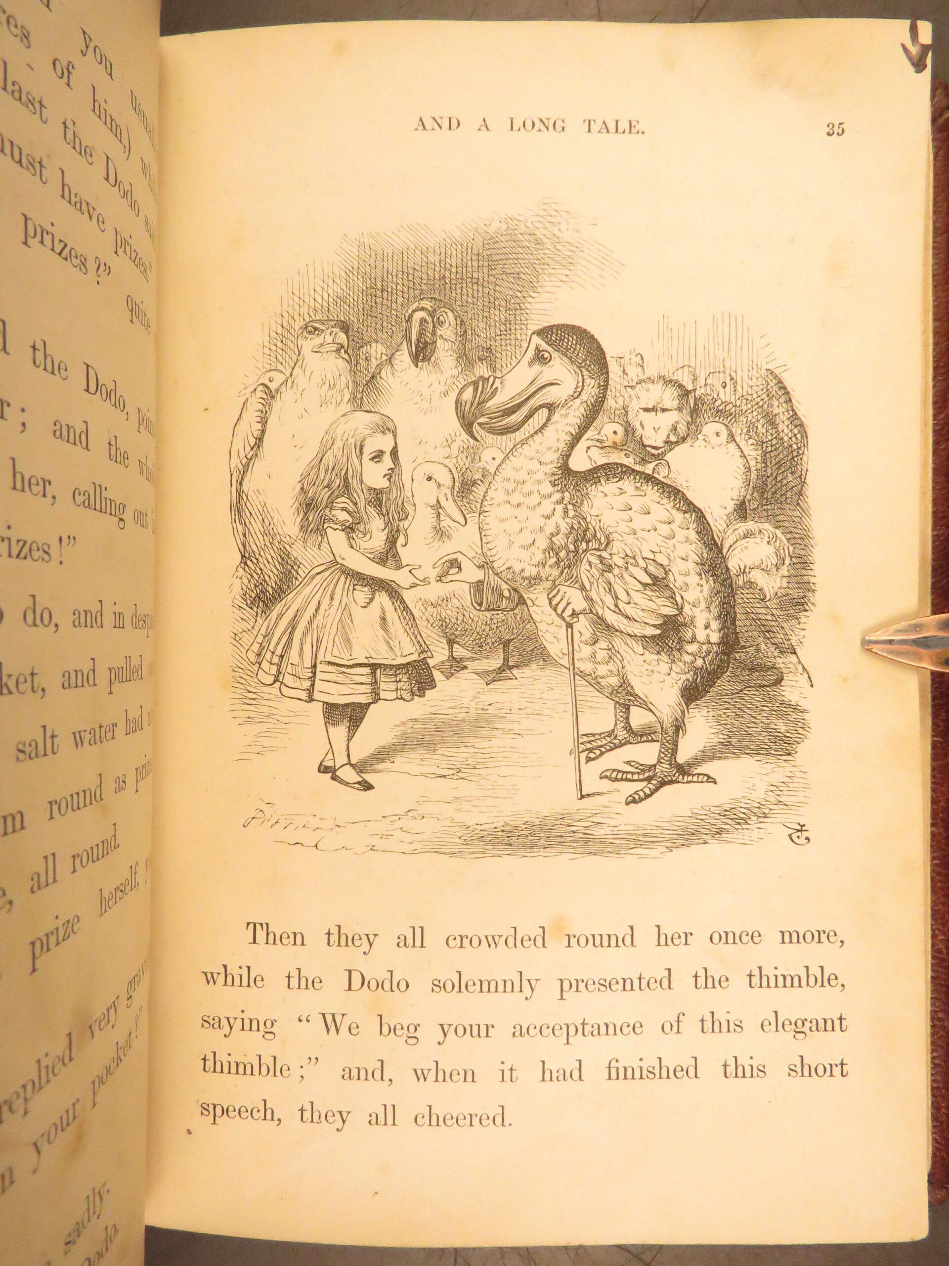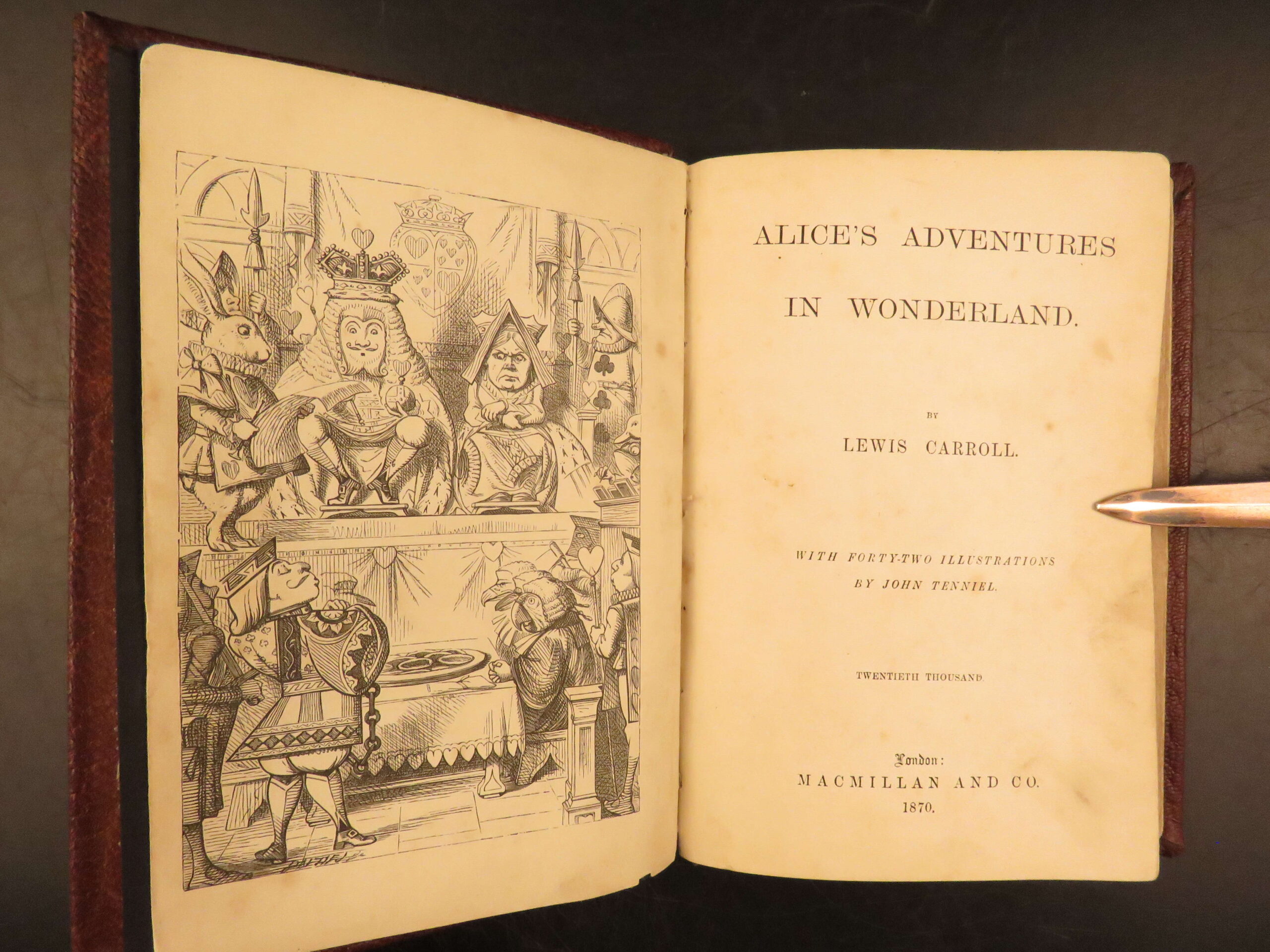 Alice’s Adventures in Wonderland 1870 Macmillan edition with Tenniel’s illustrations, in original red cloth binding. This 20th Thousand printing is a desirable bibliographic issue for Carroll collectors.