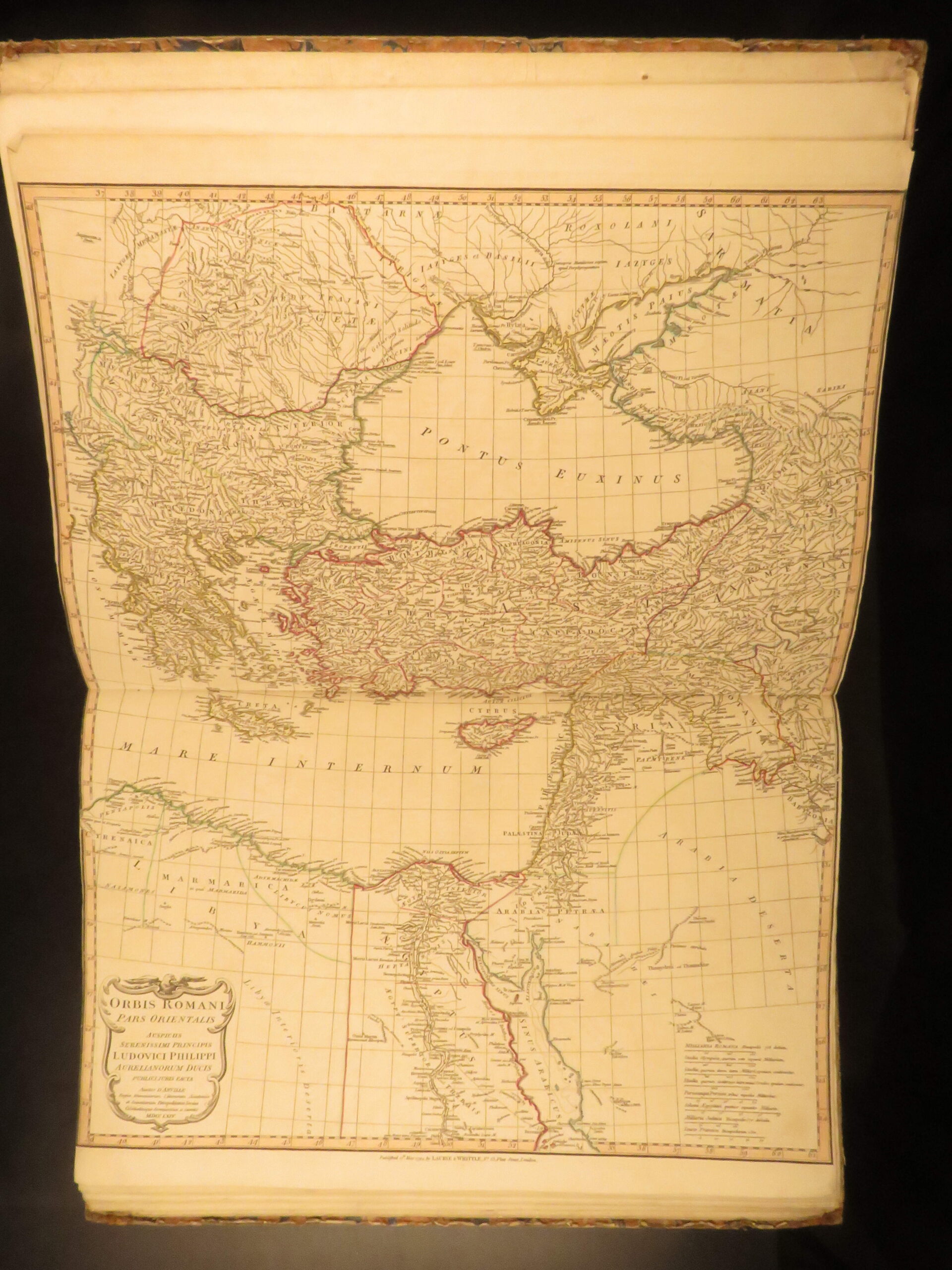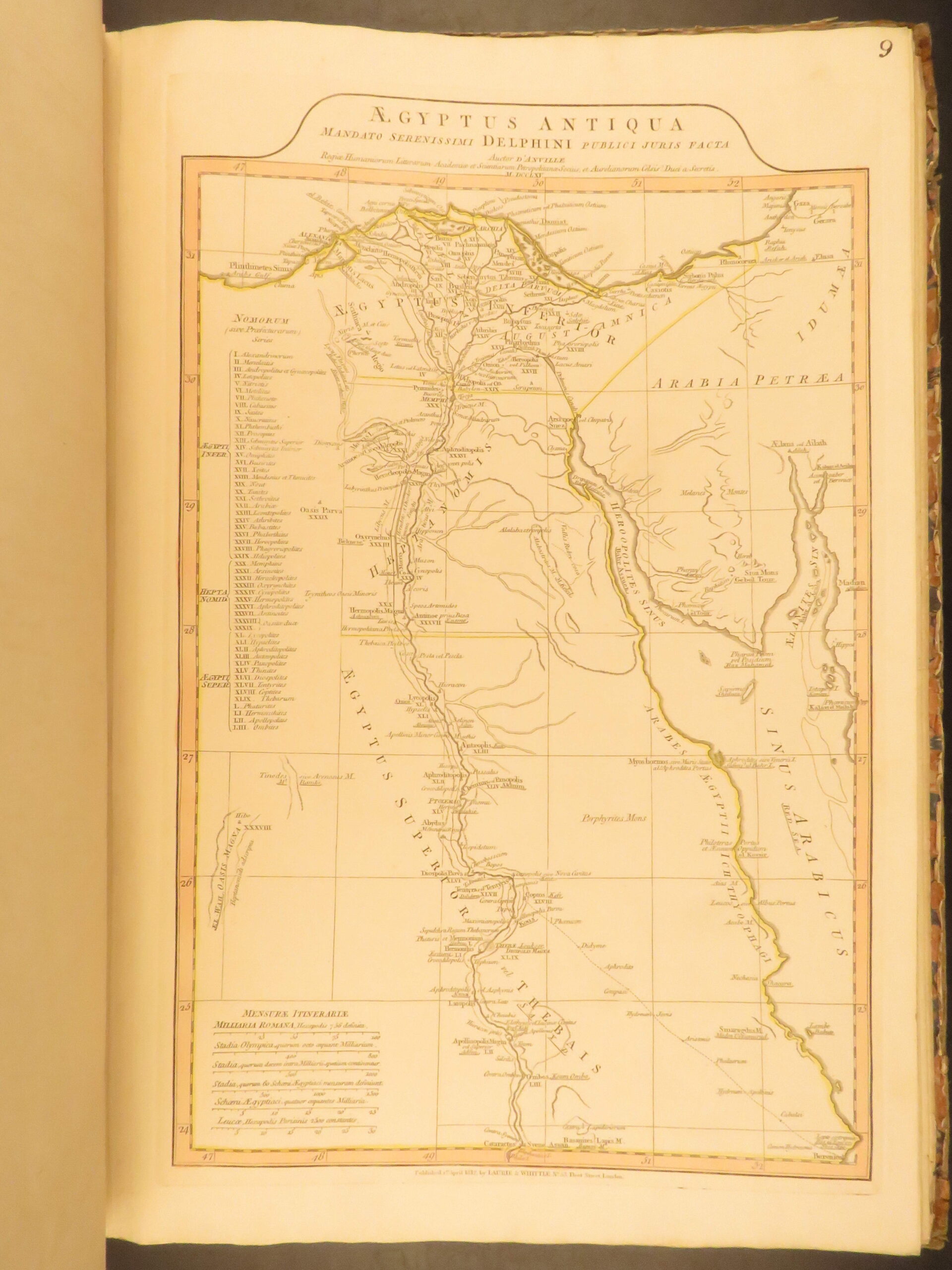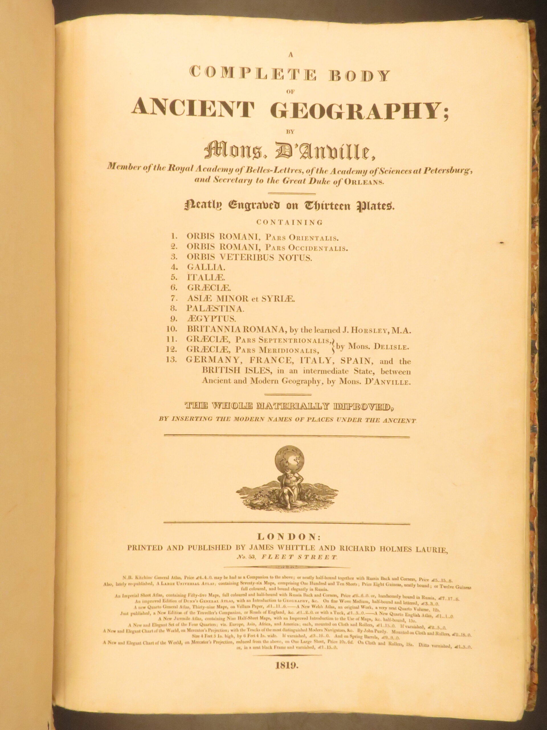 Jean Baptiste Bourguignon d’Anville’s A Complete Body of Ancient Geography (London, 1819) is a large folio atlas with thirteen double-page maps of the classical world.