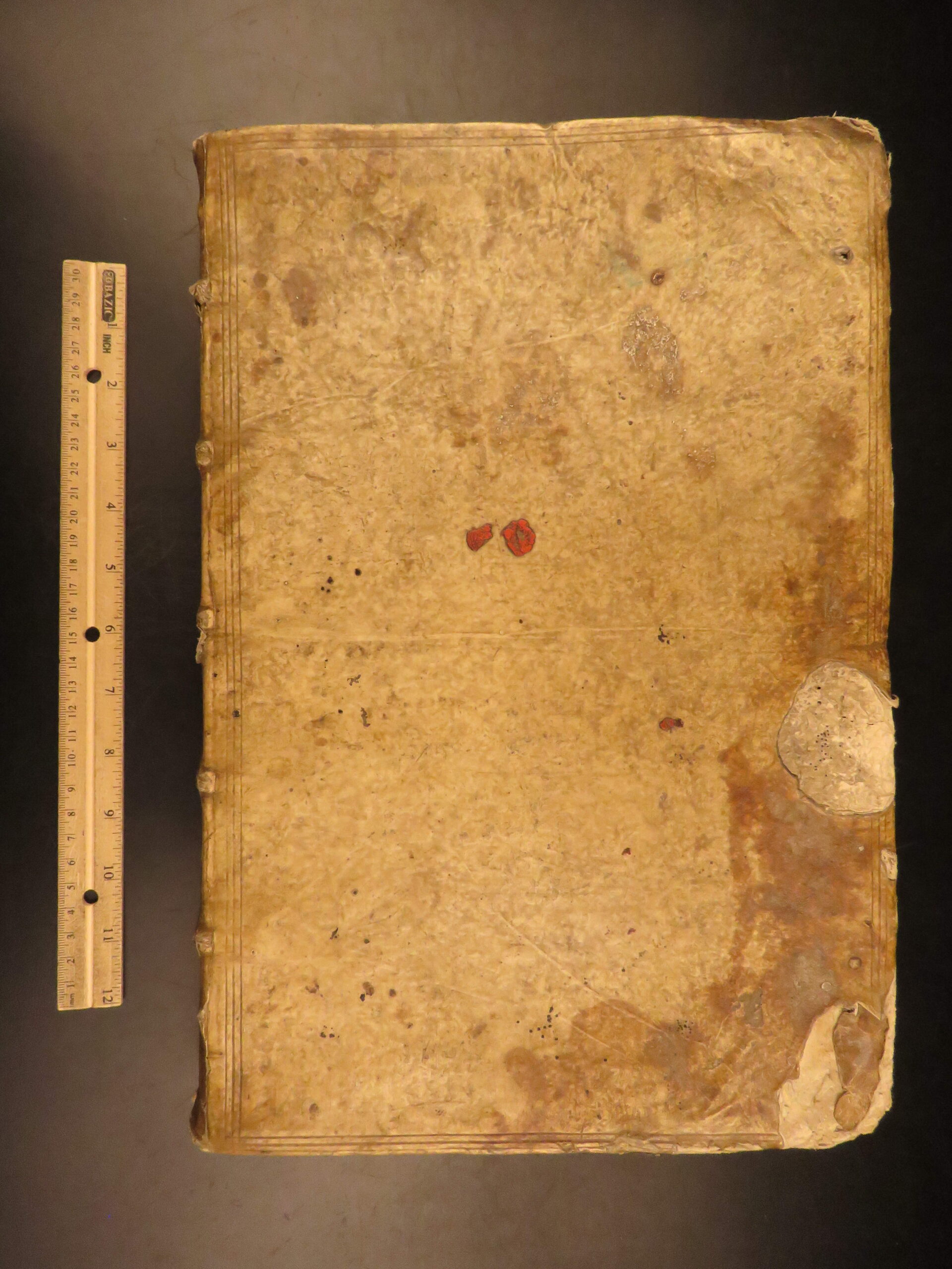 Good. Bound in full vellum with noticeable staining and corner wear; text block is secure. Interior pages show aging typical of the period but remain legible throughout.