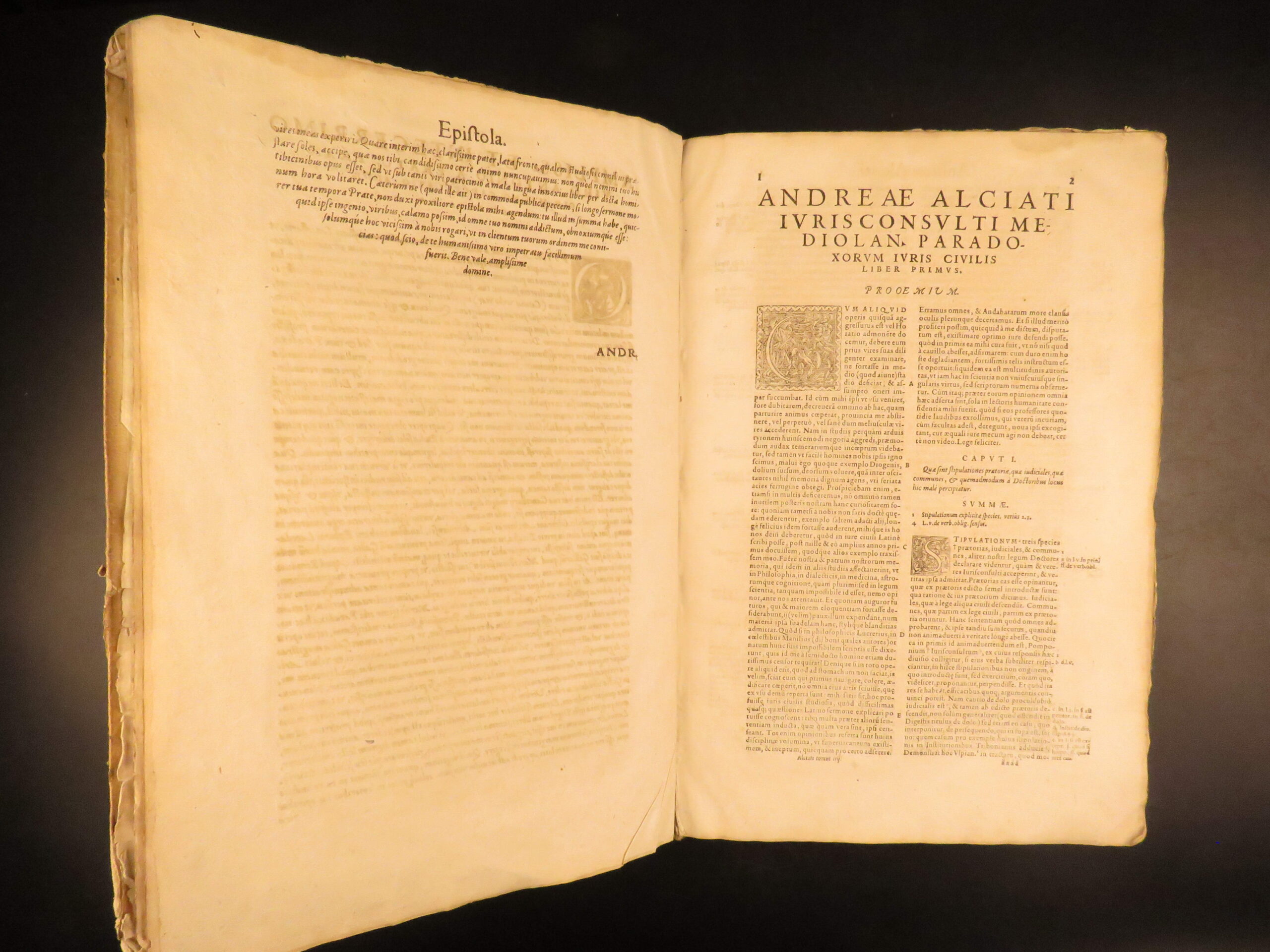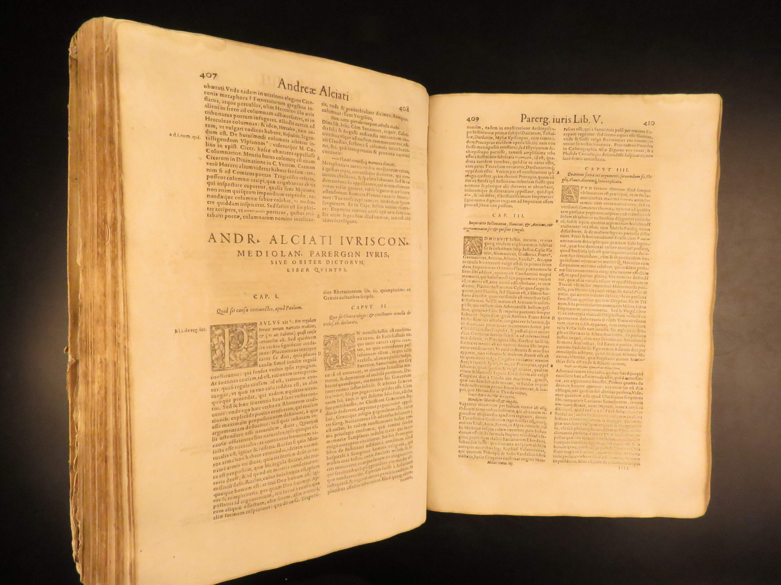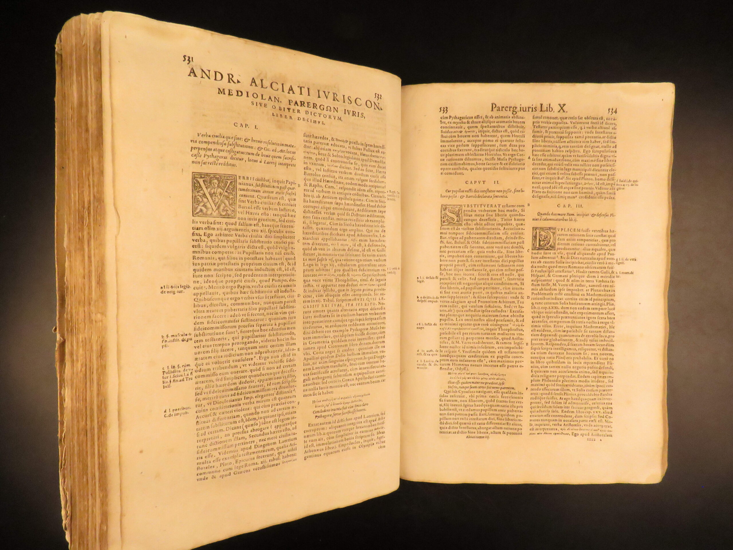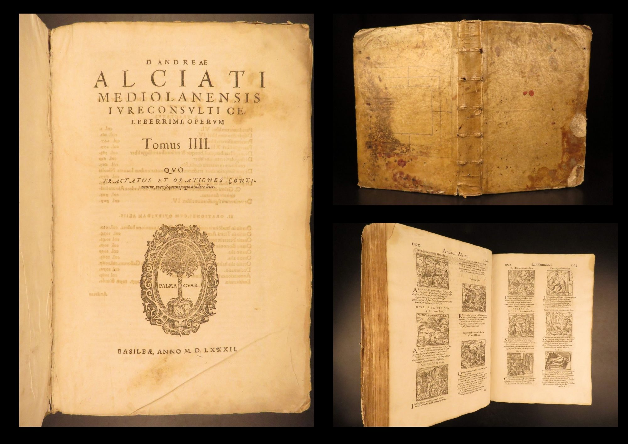 An impressive 16th-century edition of Andrea Alciati’s works. Best known for his famed book of Emblemata which brought him substantial recognition, Alciani also wrote numerous other works of commentary on Roman law.