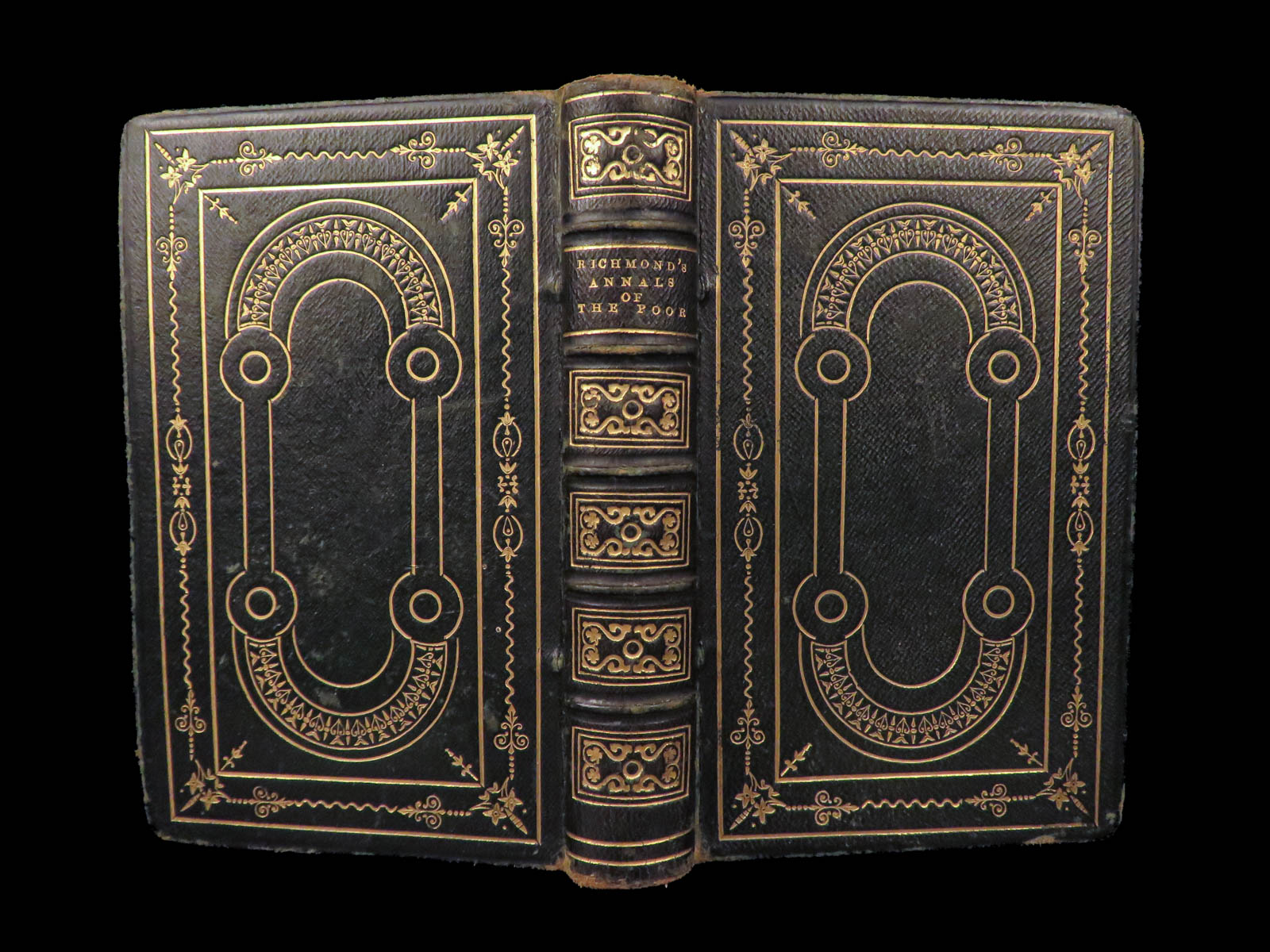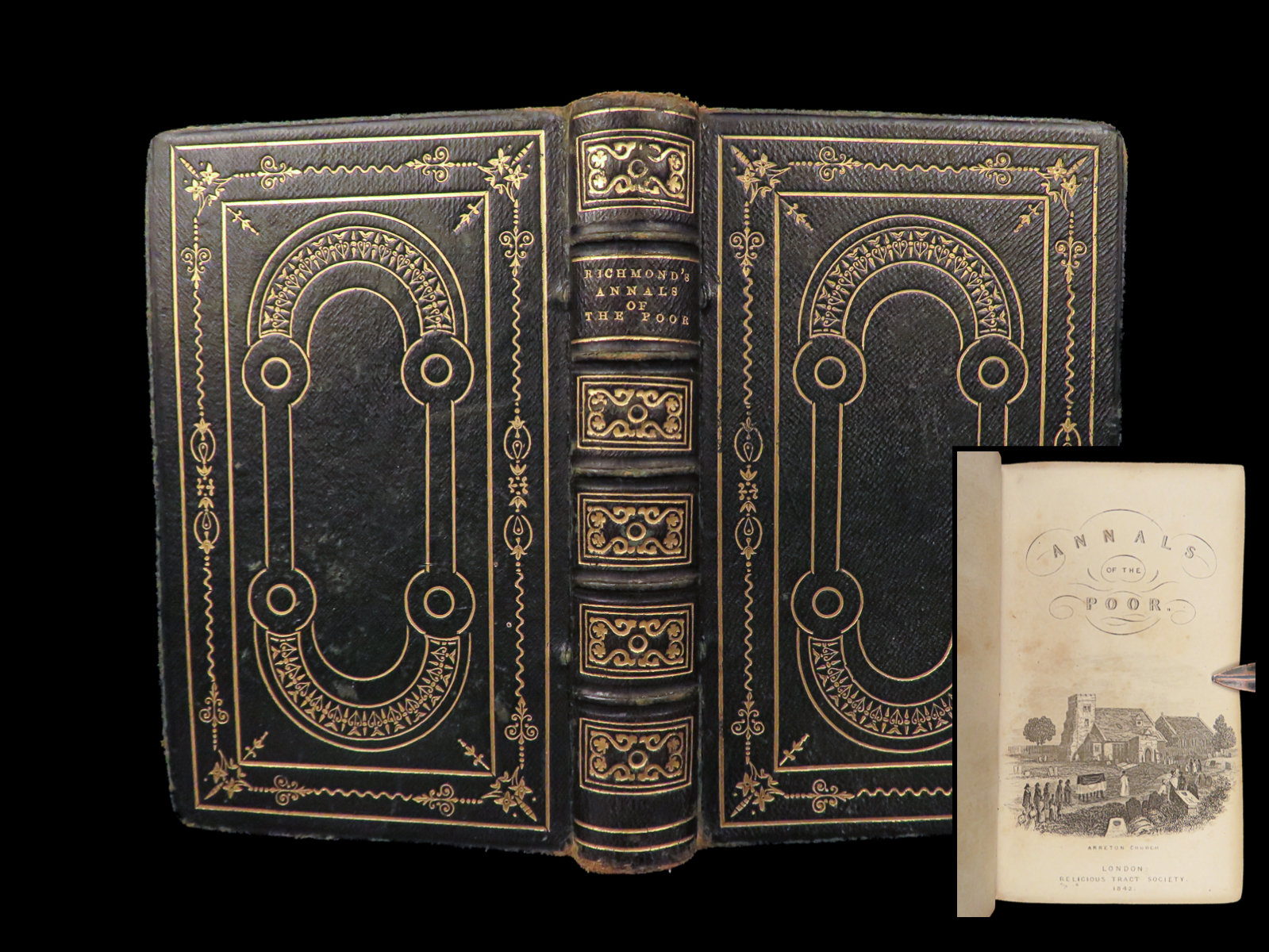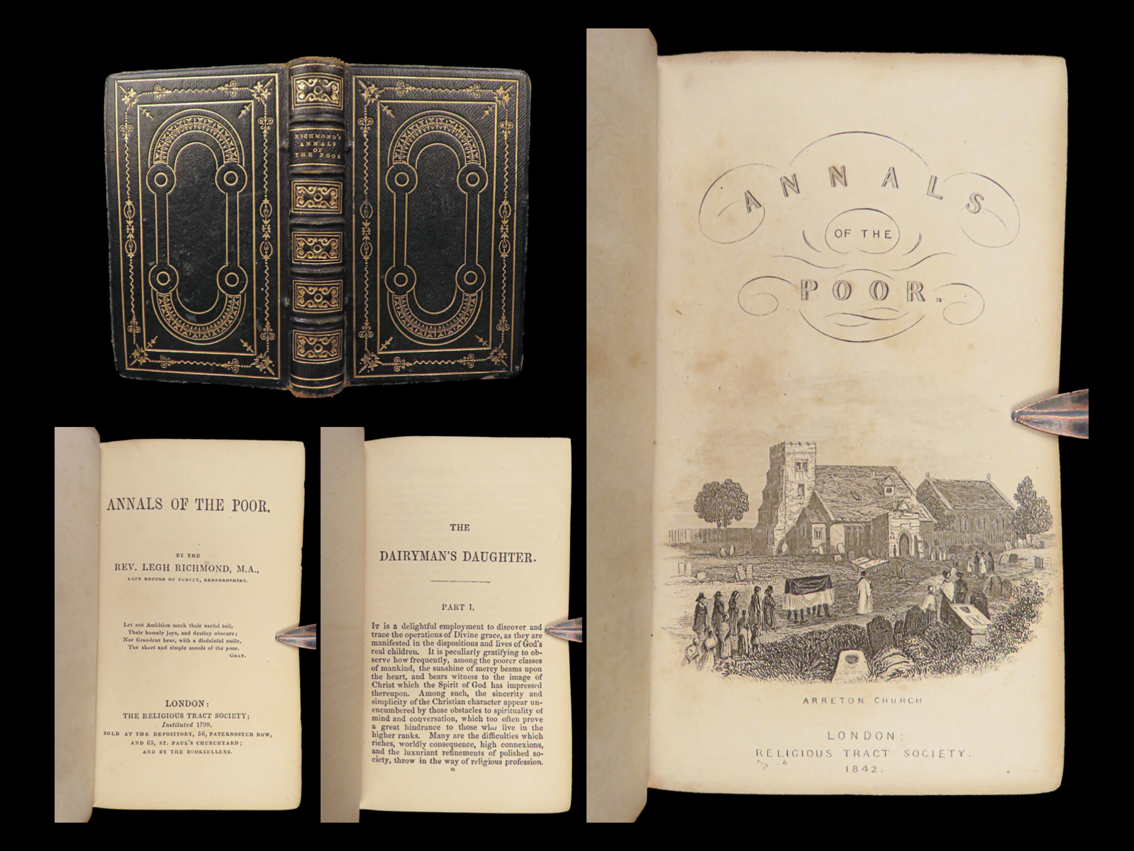Legh Richmond’s Annals of the Poor (1842) published by the Religious Tract Society includes five influential Christian tales, with engraved plates in a gilt leather binding.