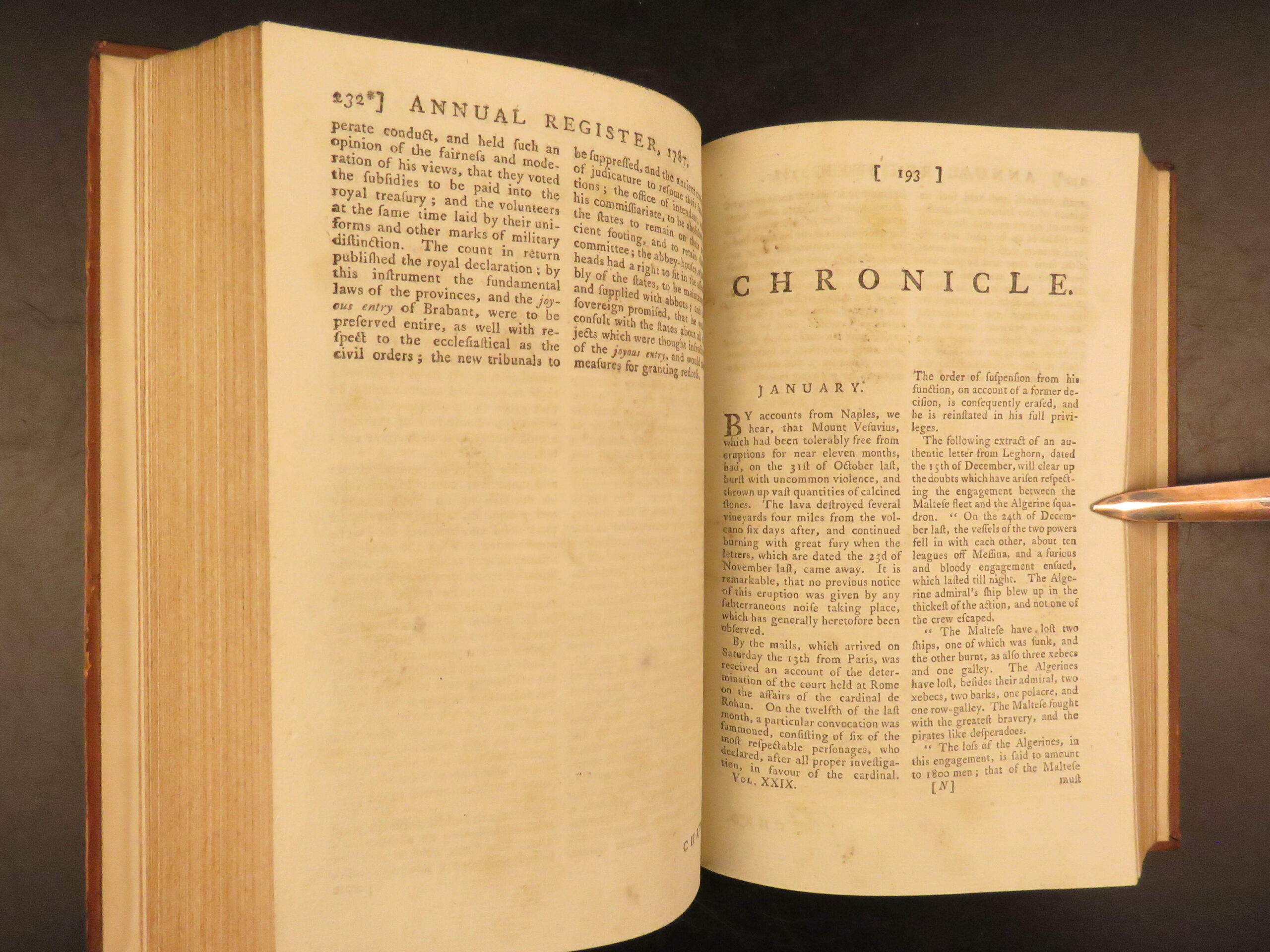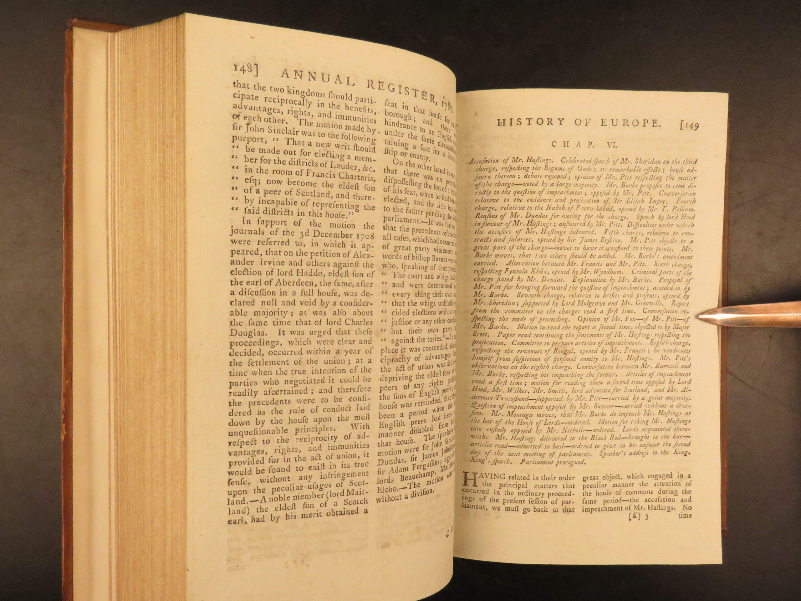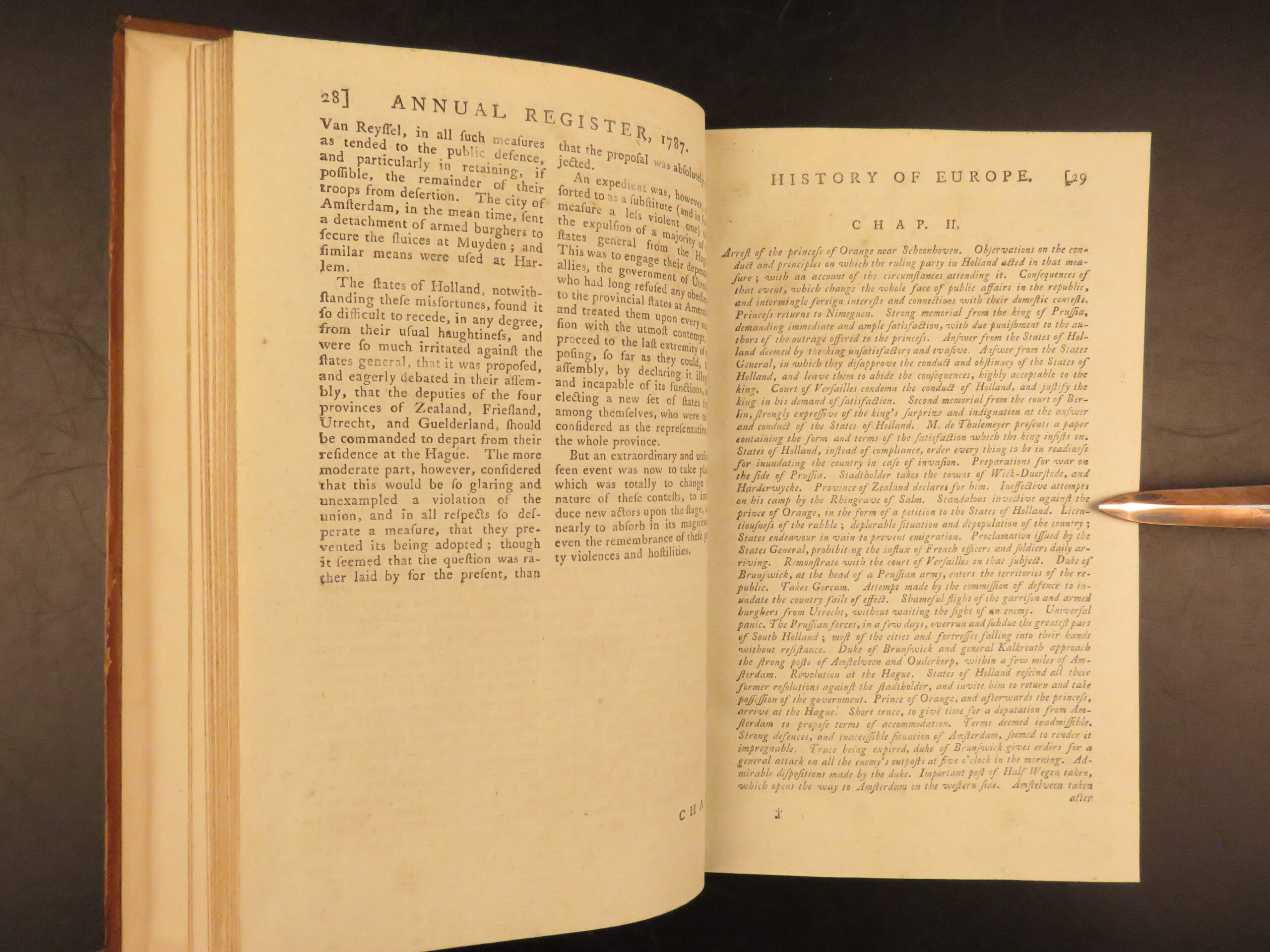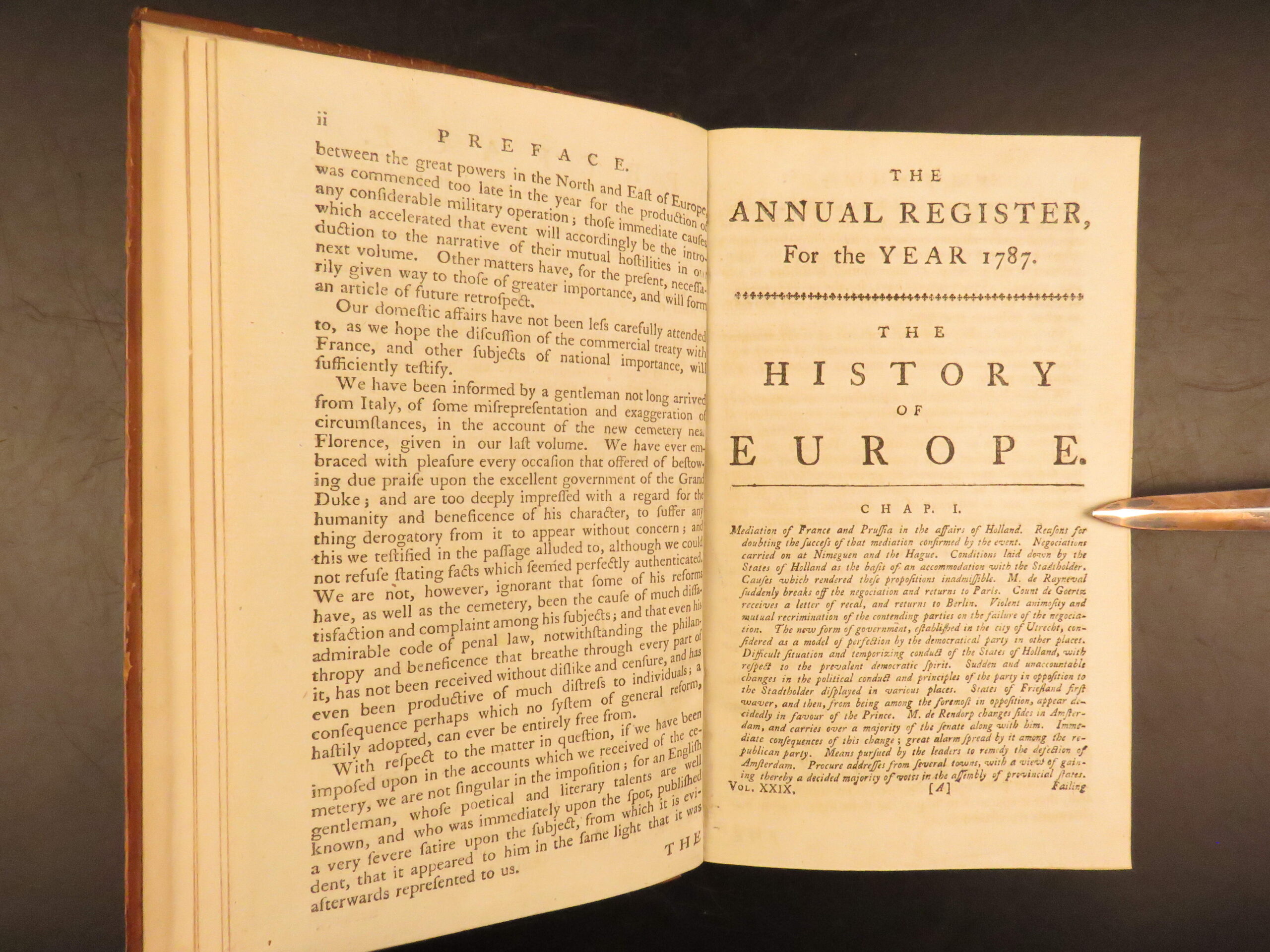 1787 – annual register | early united states constitution & ben franklin letters | dodsley’s 1789 issue of the annual register features an early printing of the u. S. Constitution along with reports on political events in holland, french revolutionary views, ethnographic notes, and poetry by thomas wharton.