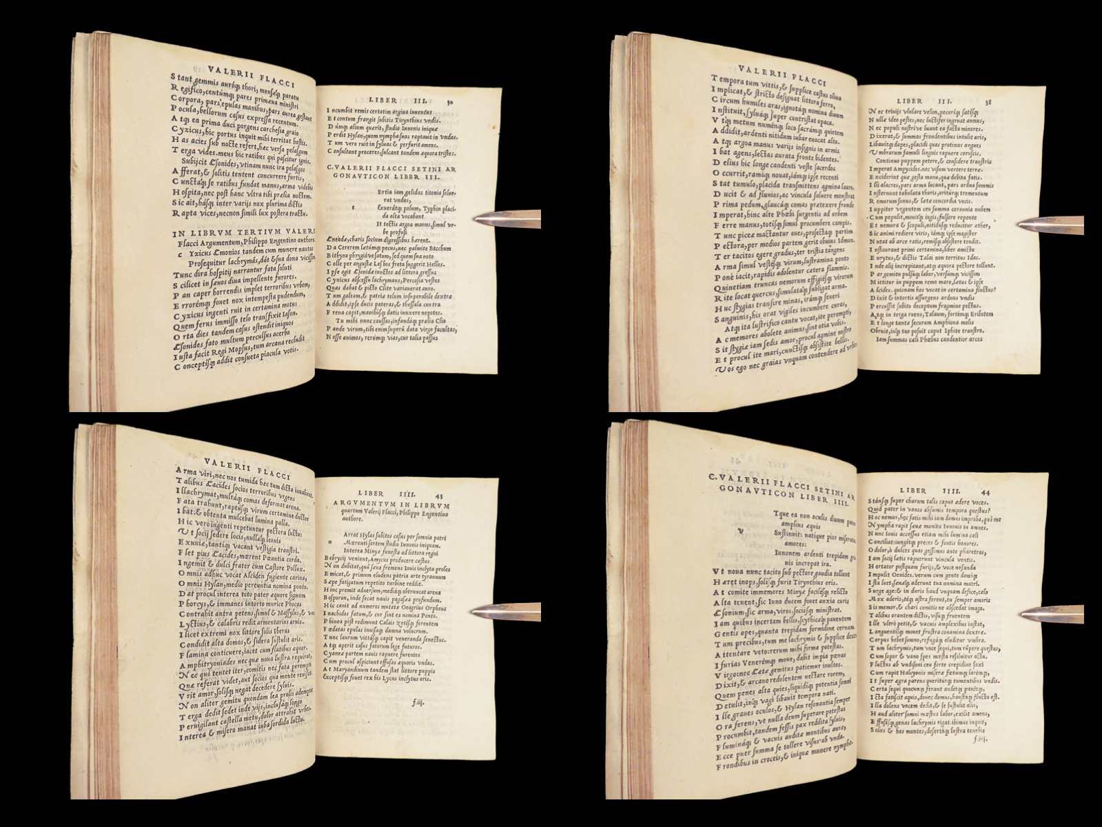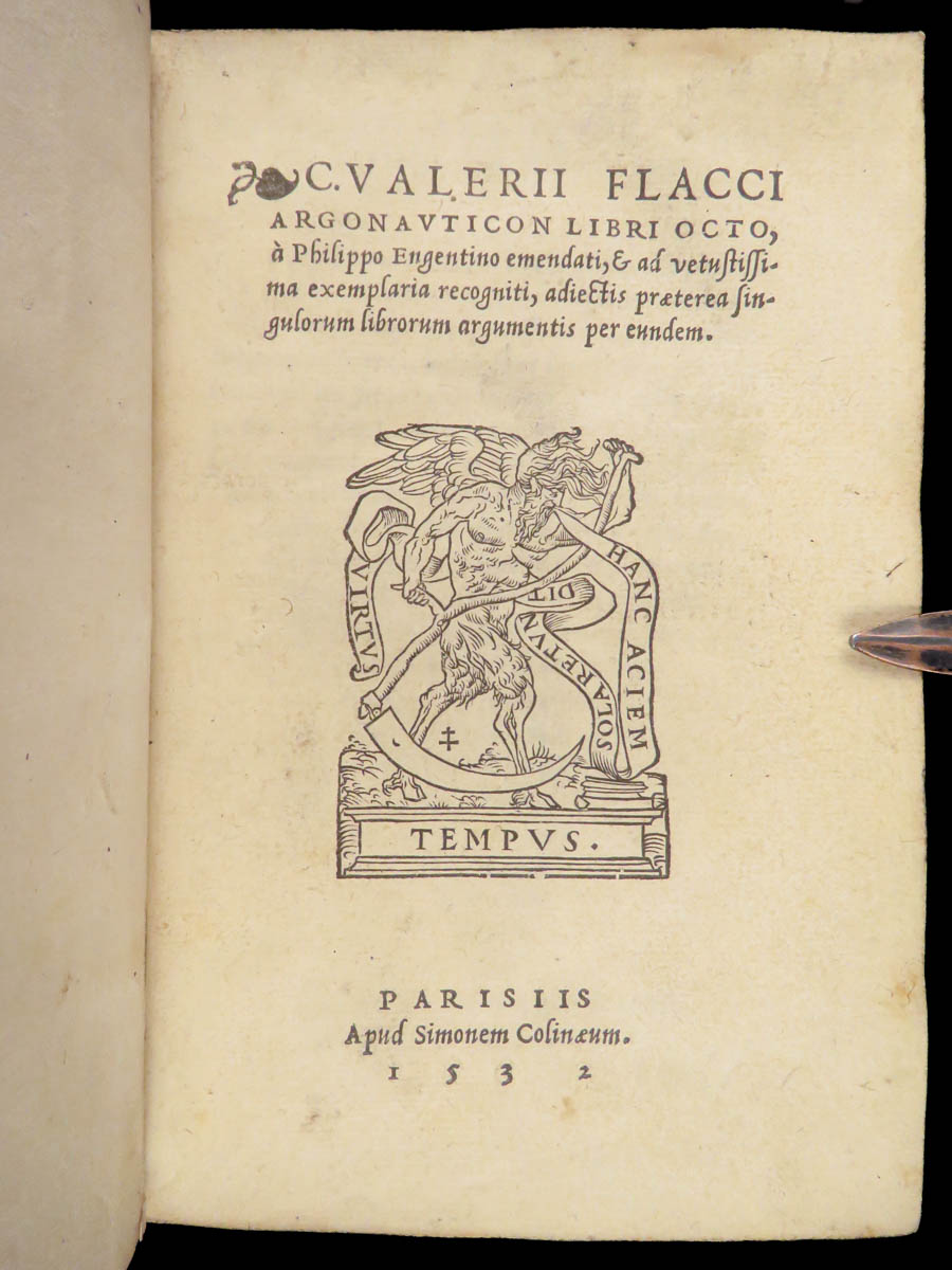 1532 Paris edition of Valerius Flaccus’s Argonauticon libri octo, edited by Philippo Engentino, printed by Simon de Colines, complete in 103 leaves with printer’s device on title page.