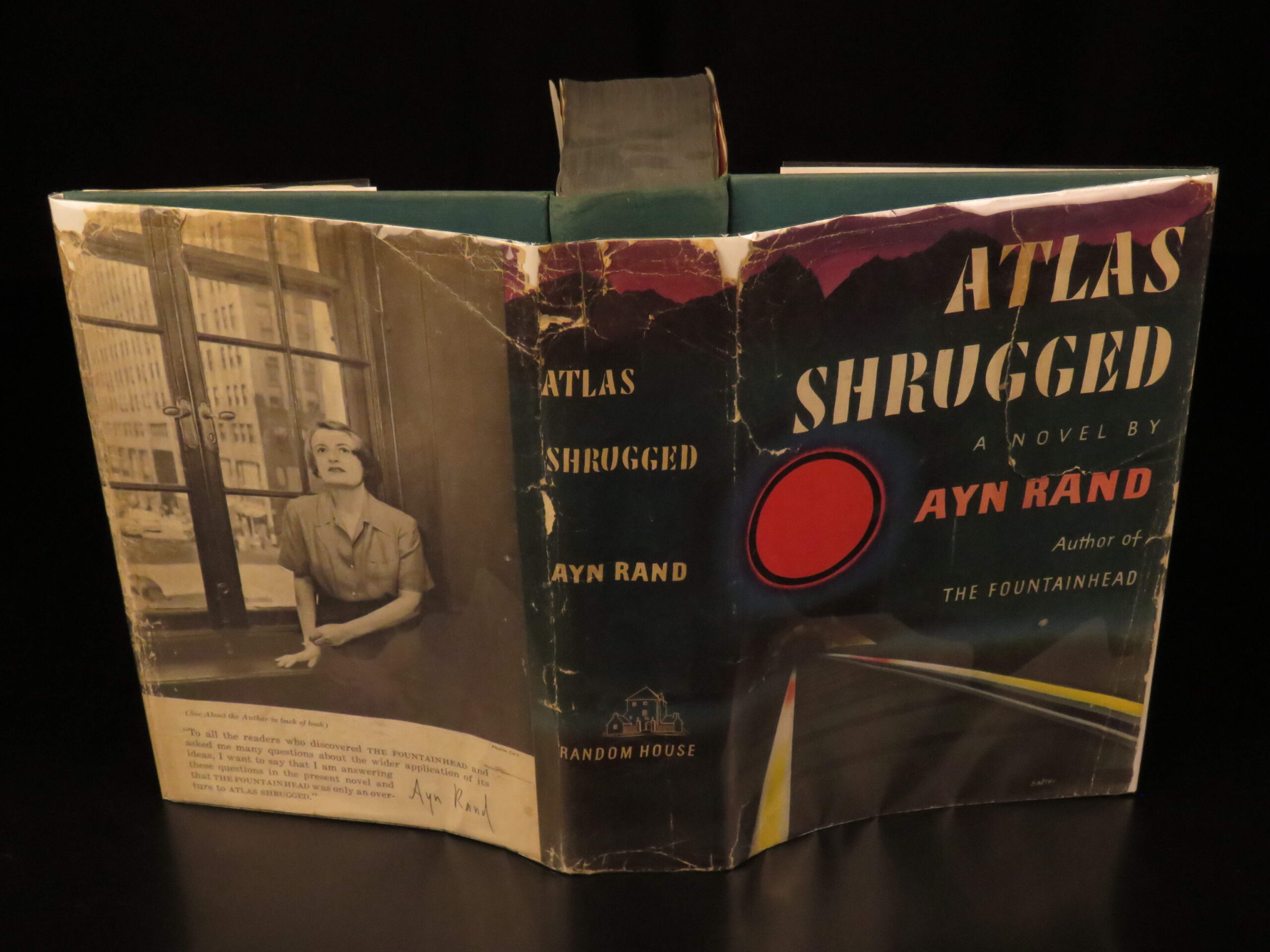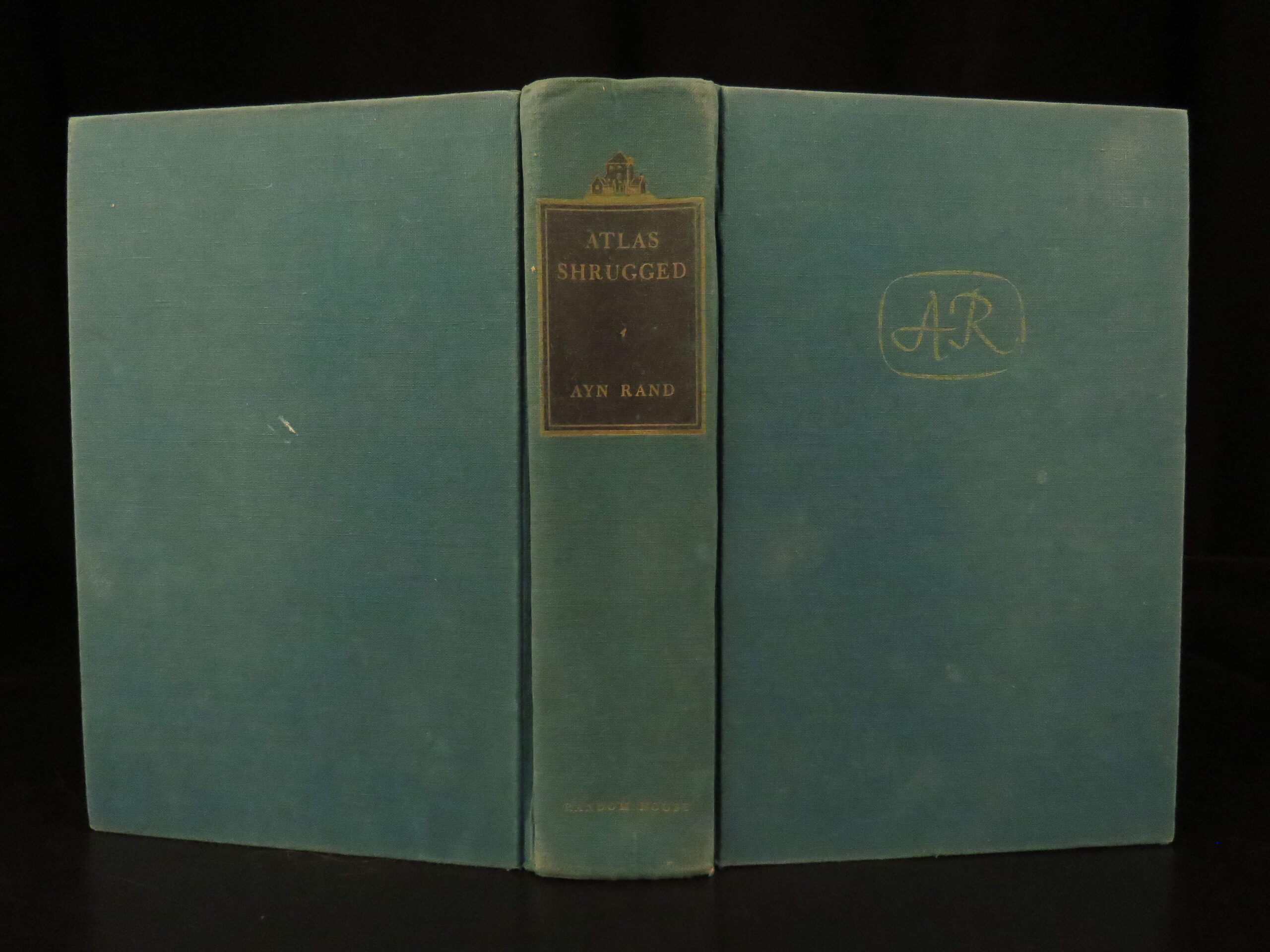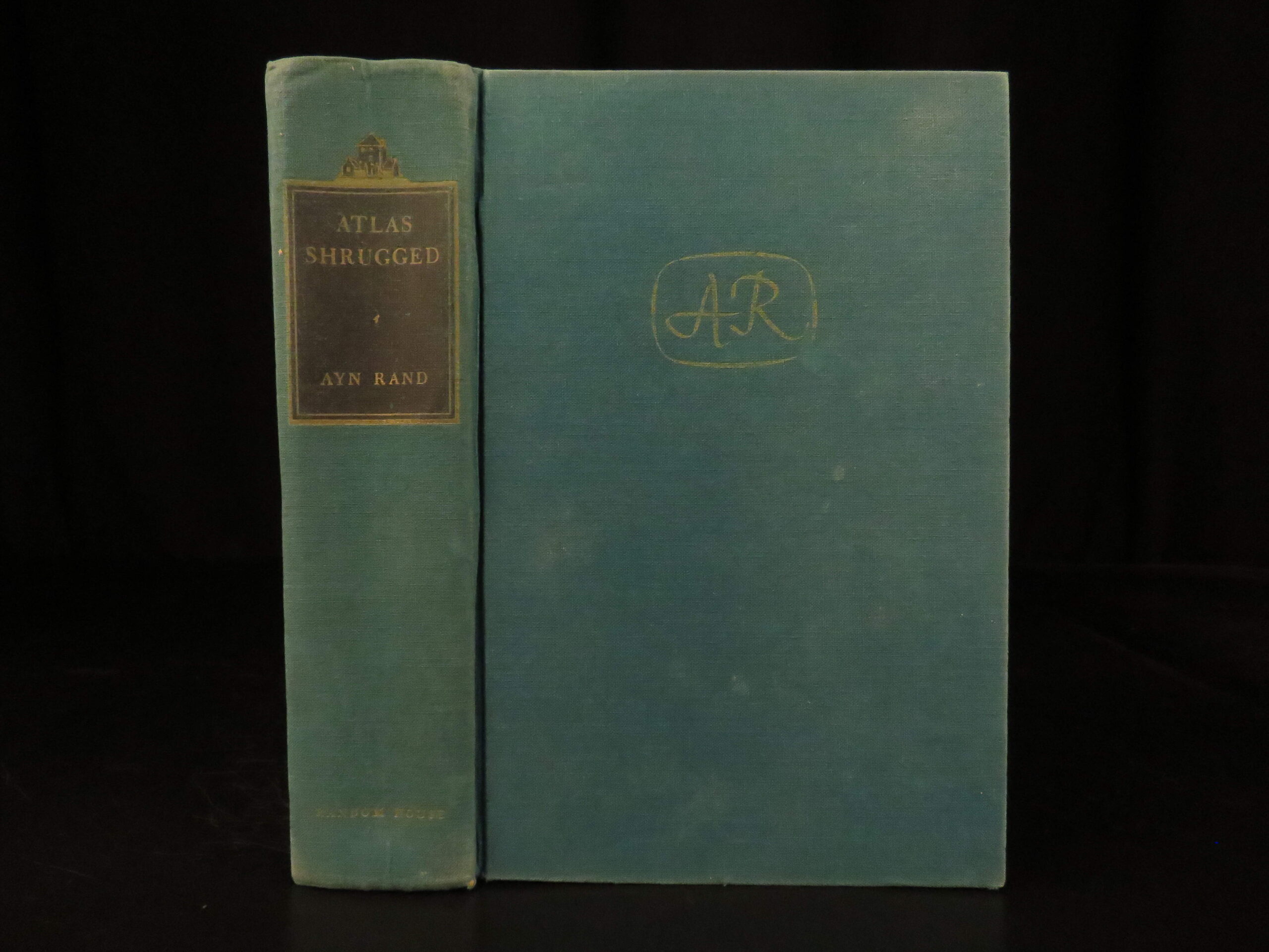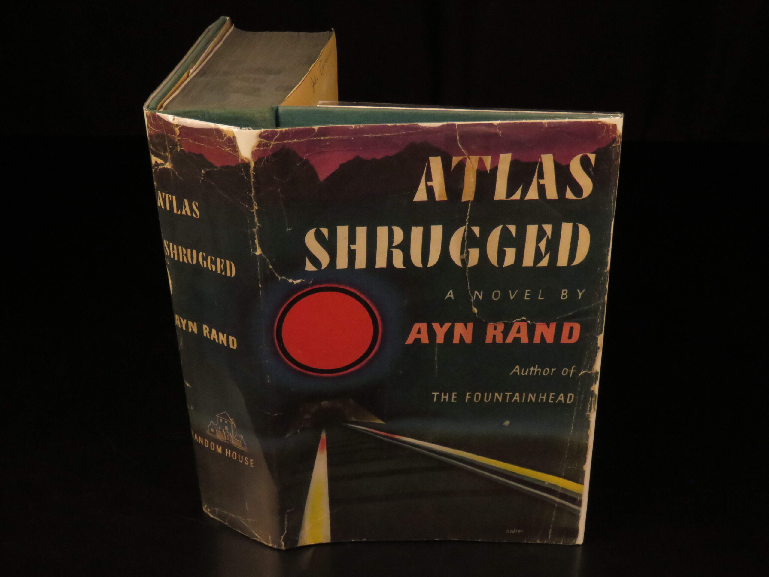 1957 first edition of Atlas Shrugged by Ayn Rand, featuring themes of capitalism and resistance to collectivism. Original green cloth with jacket, “First Printing” stated.