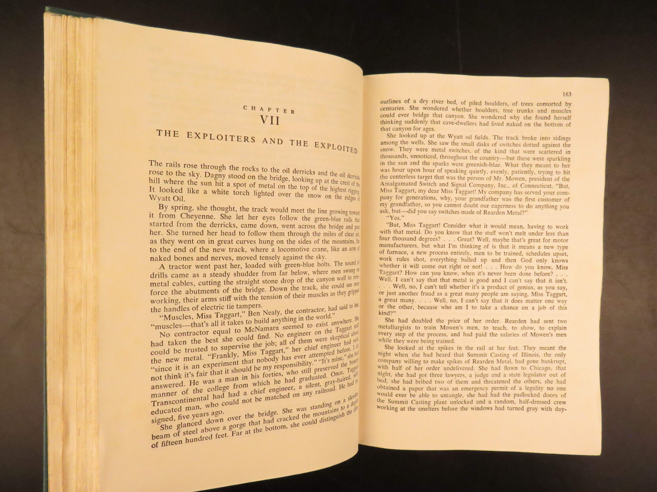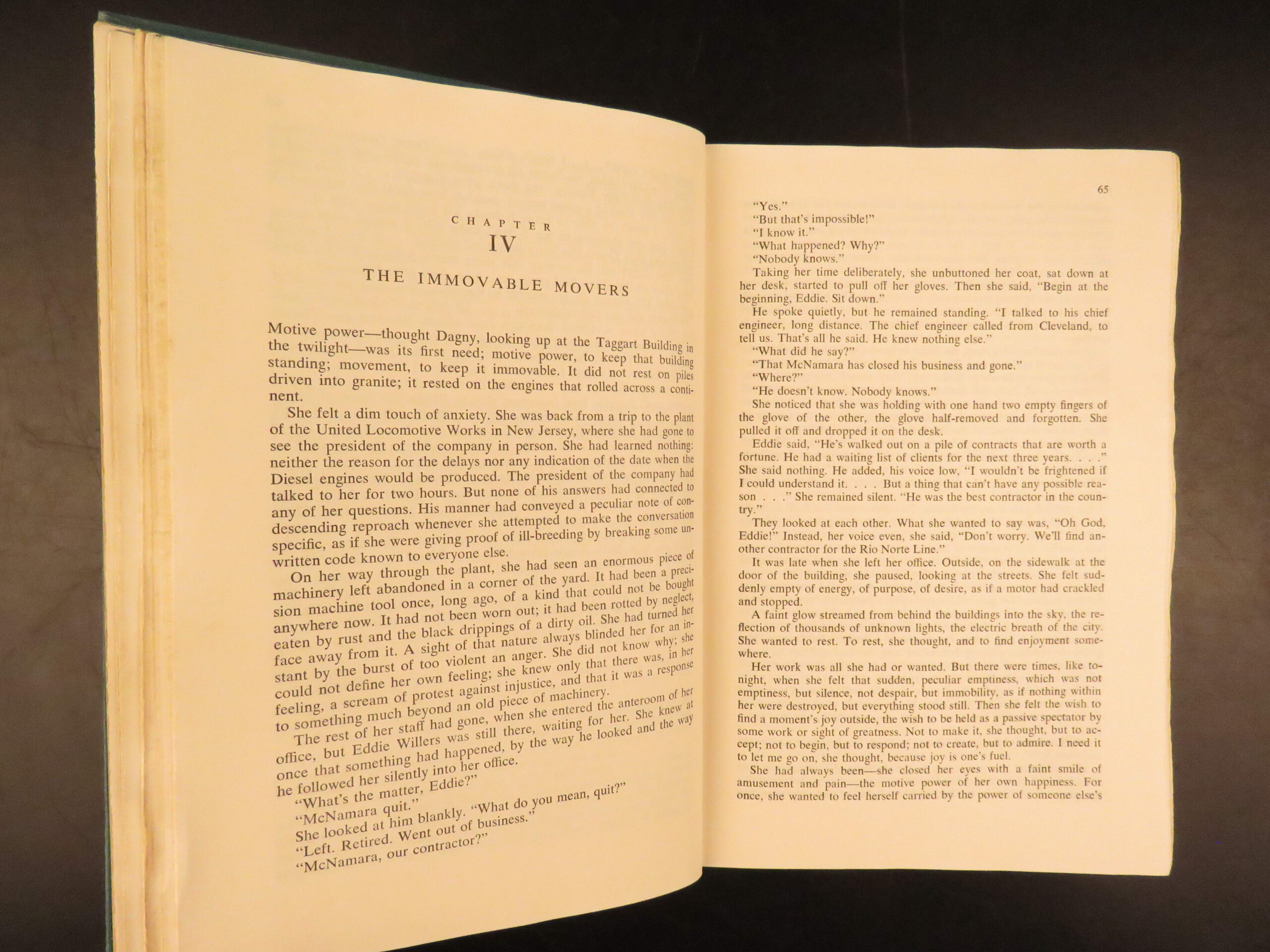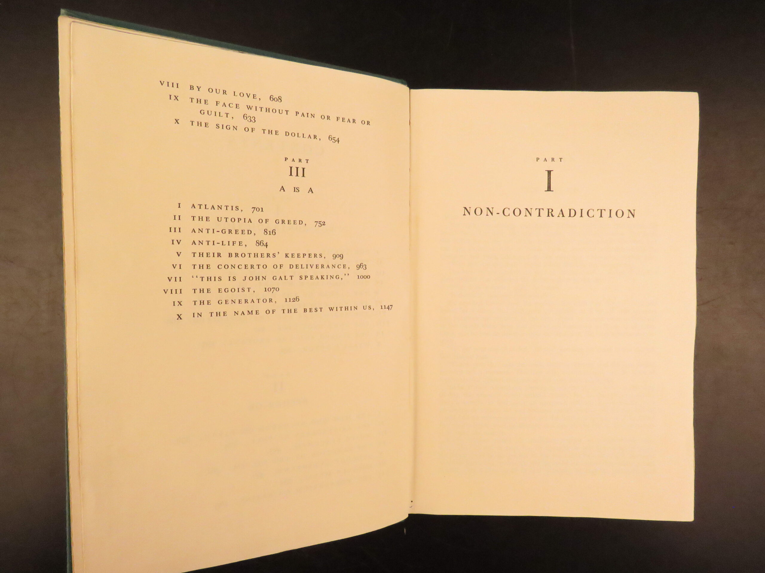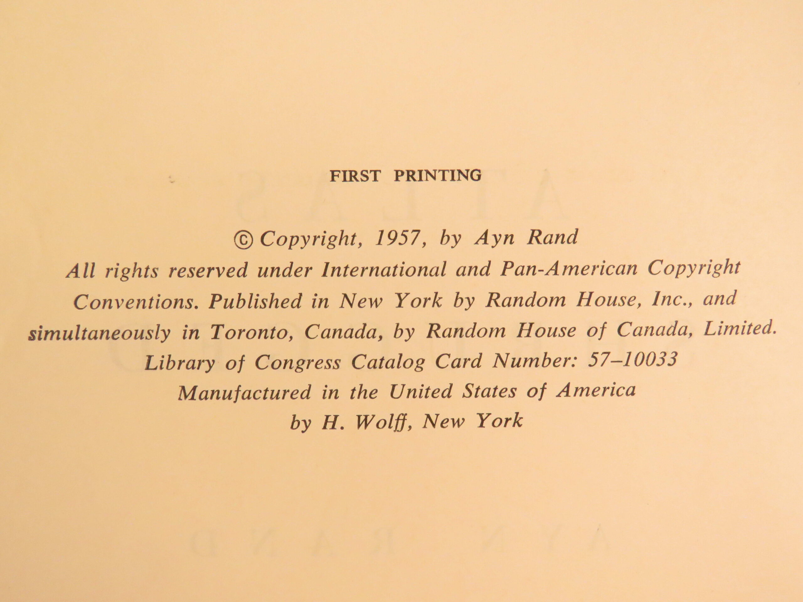 1957 first edition of Atlas Shrugged by Ayn Rand, featuring themes of capitalism and resistance to collectivism. Original green cloth with jacket, “First Printing” stated.