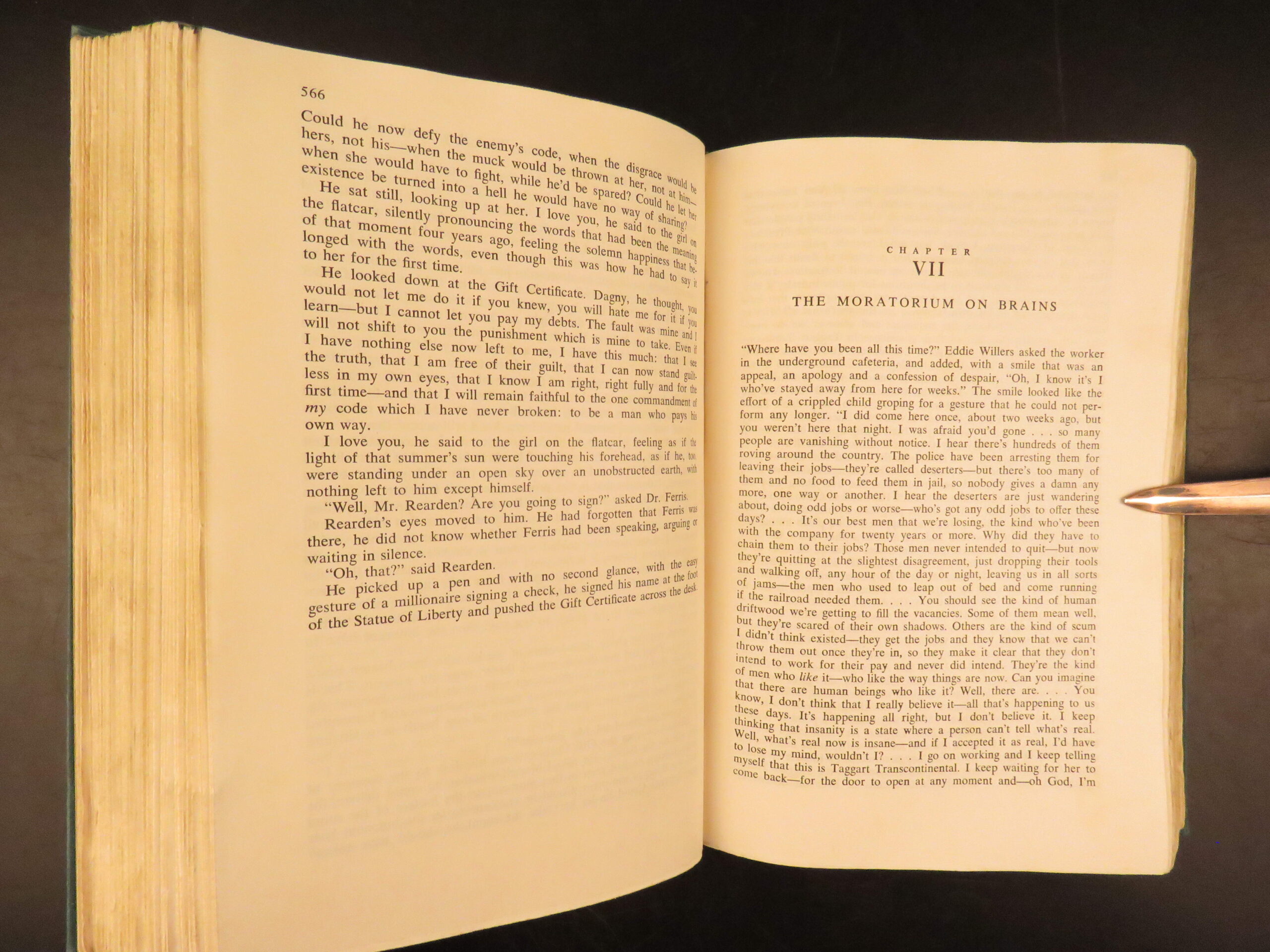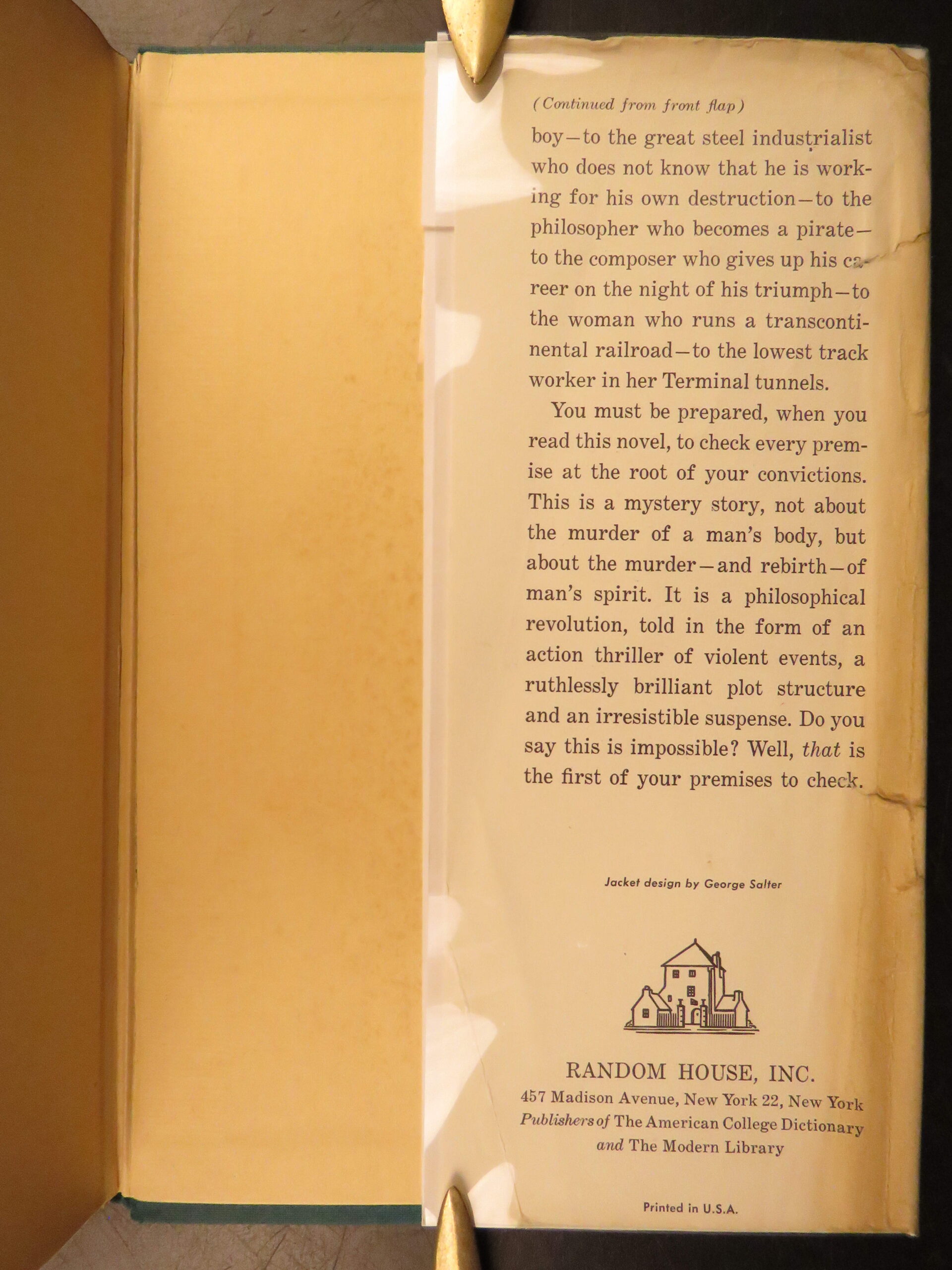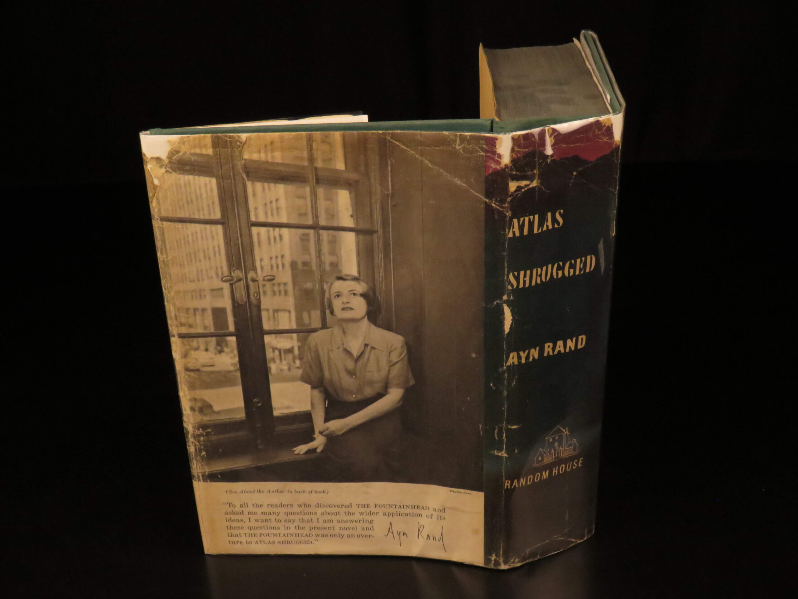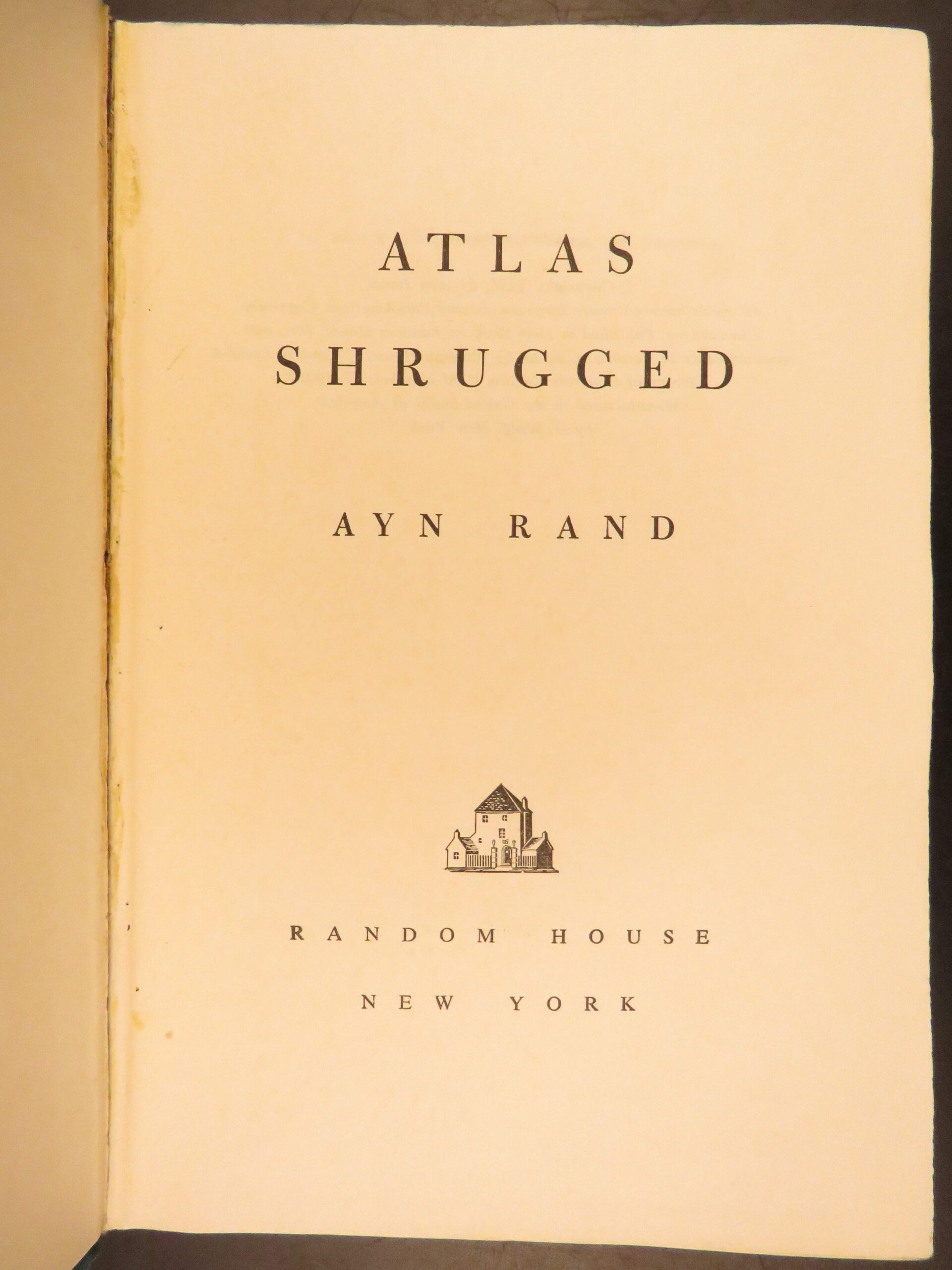 Atlas Shrugged by Ayn Rand was published in 1957 by Random House in New York. This true first edition, first printing includes “First Printing” on the copyright page. This book explores a dystopian future society that is marked by economic and political control through an intellectual decline.