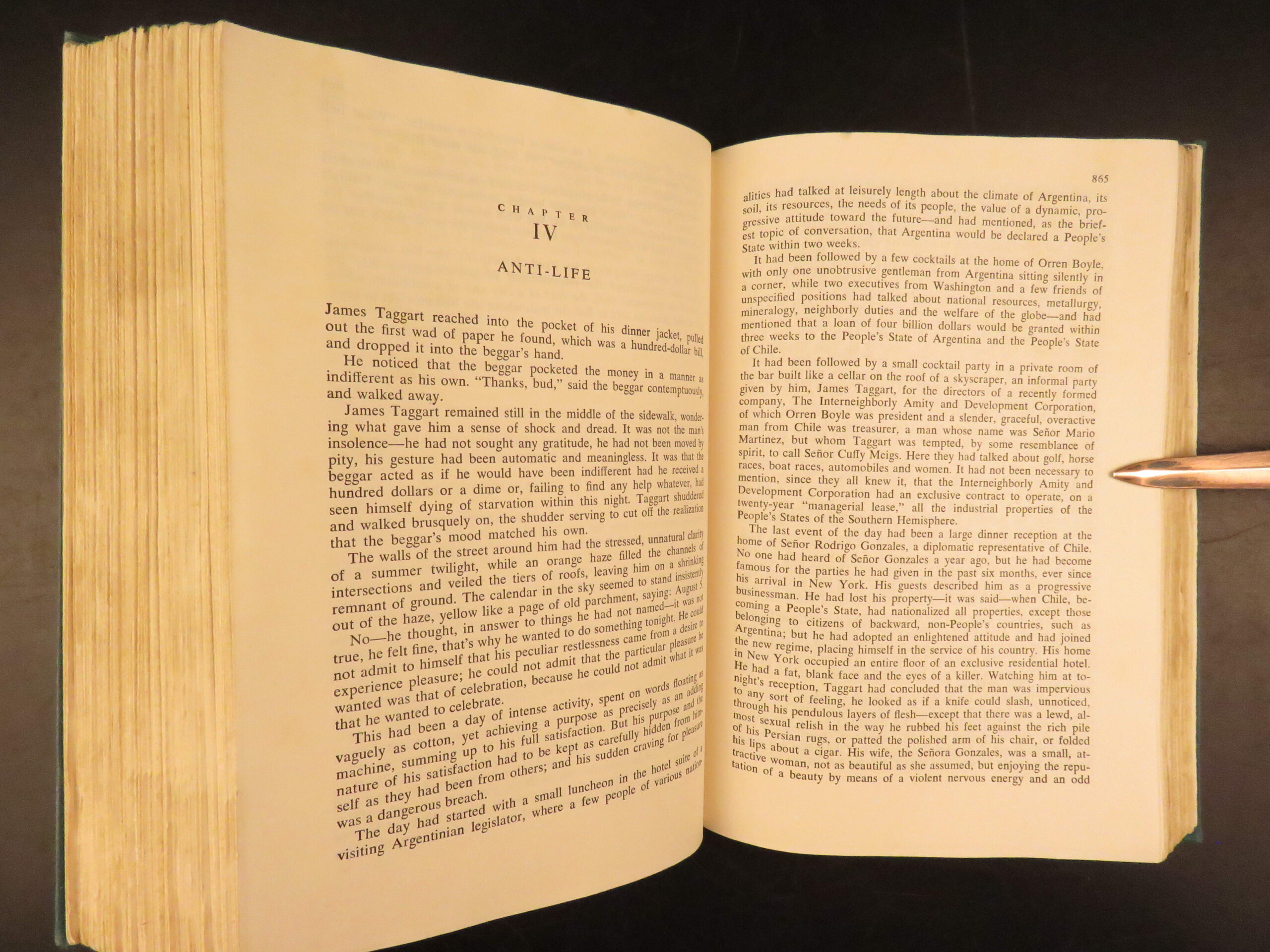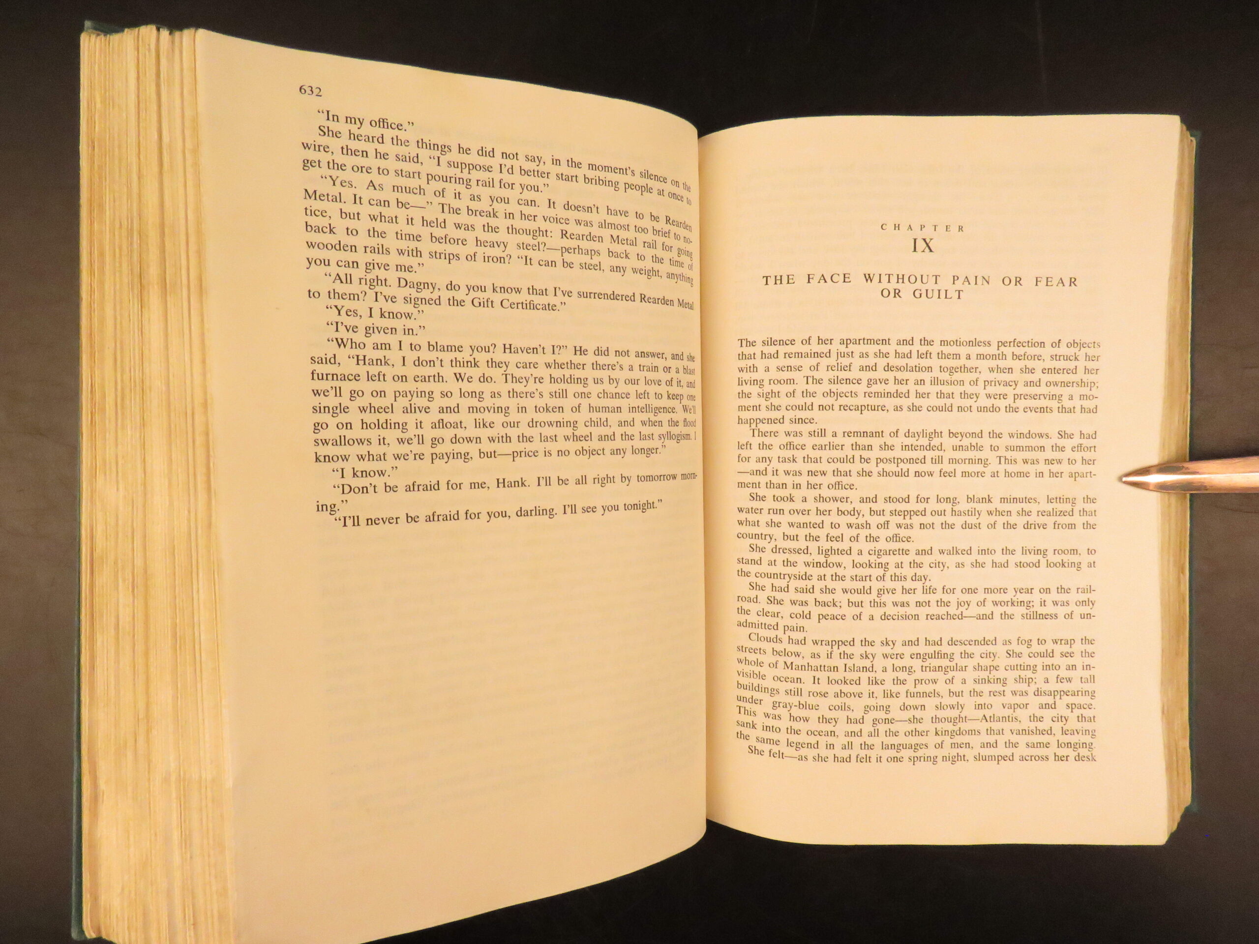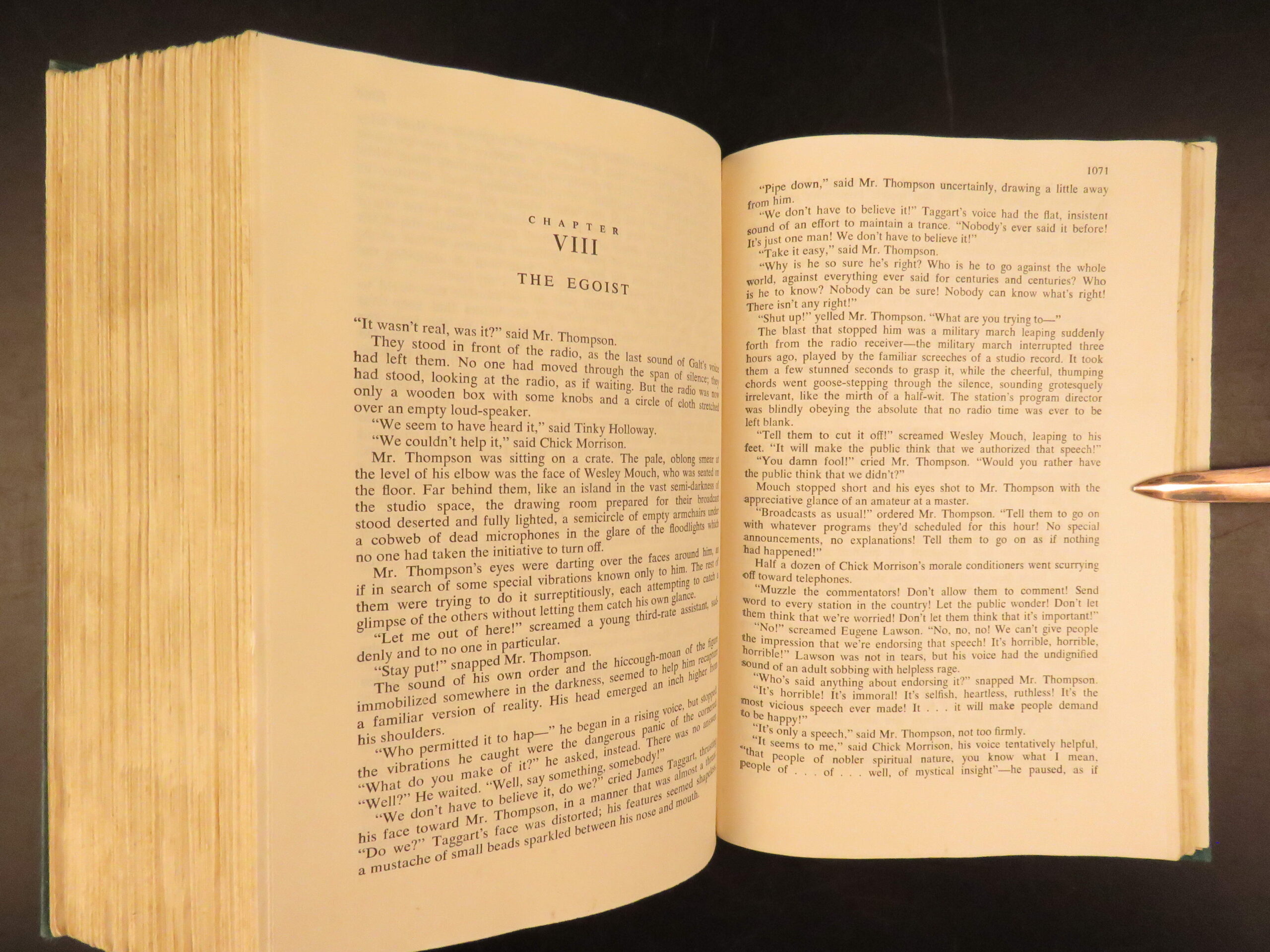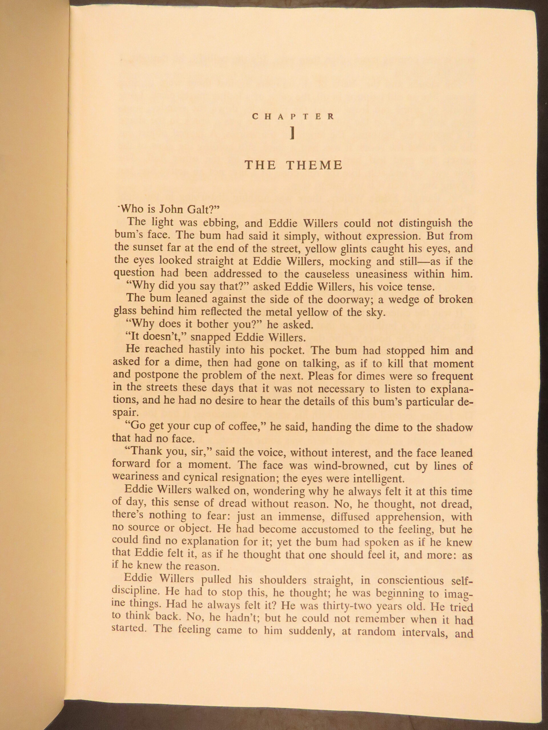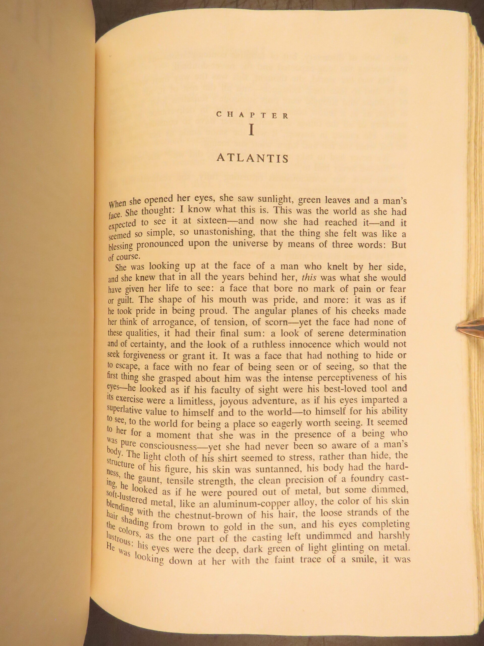Atlas Shrugged by Ayn Rand was published in 1957 by Random House in New York. This true first edition, first printing includes “First Printing” on the copyright page. This book explores a dystopian future society that is marked by economic and political control through an intellectual decline.