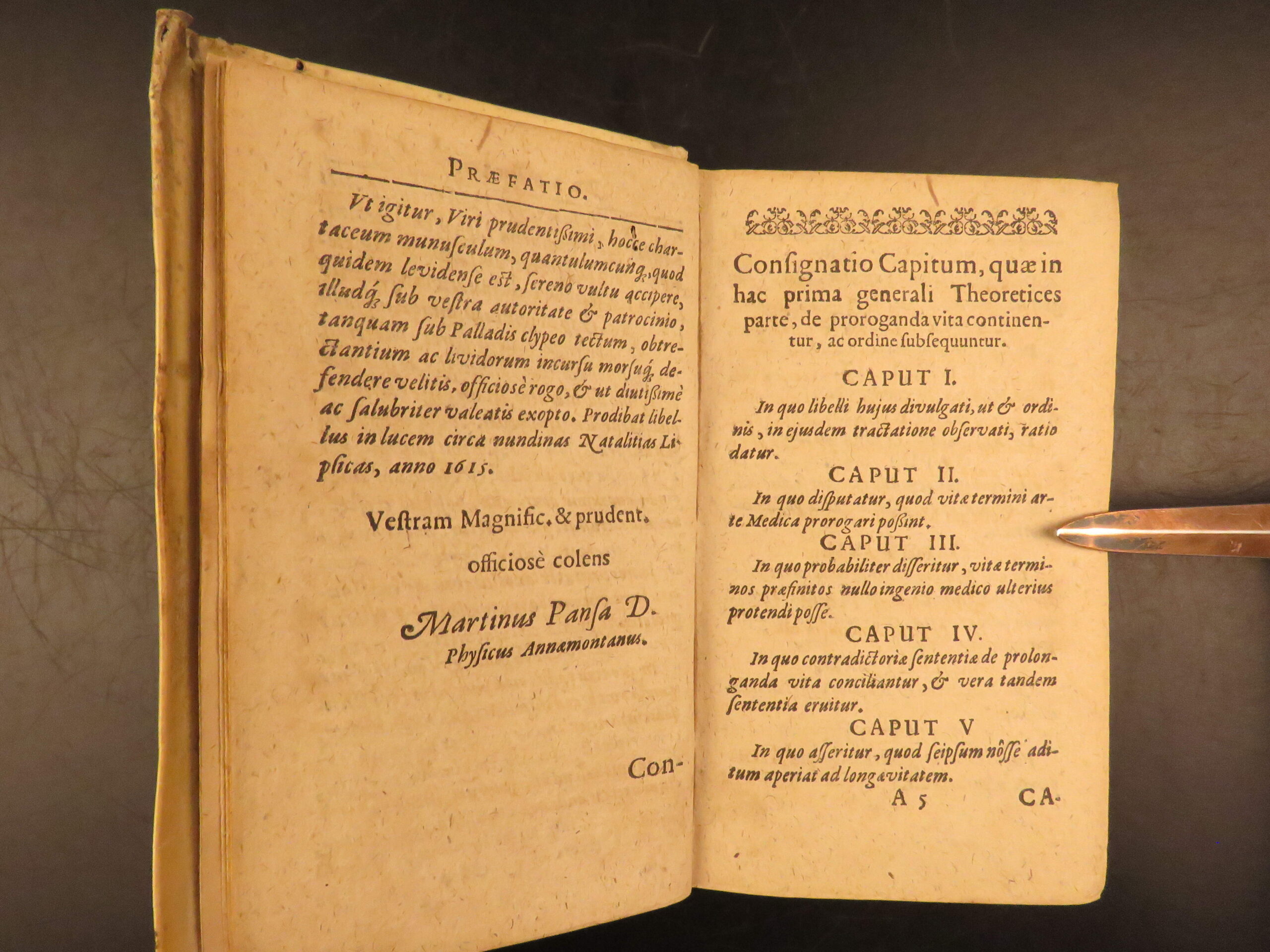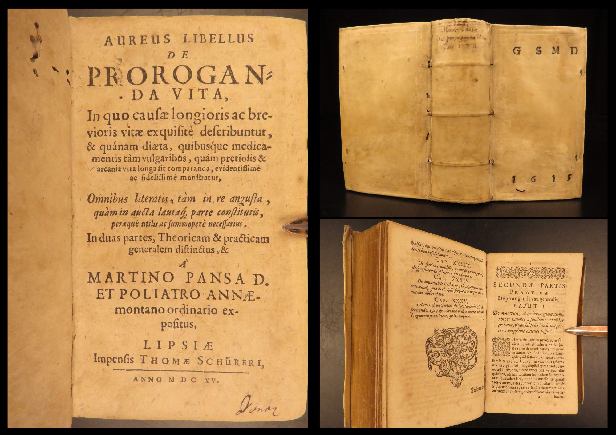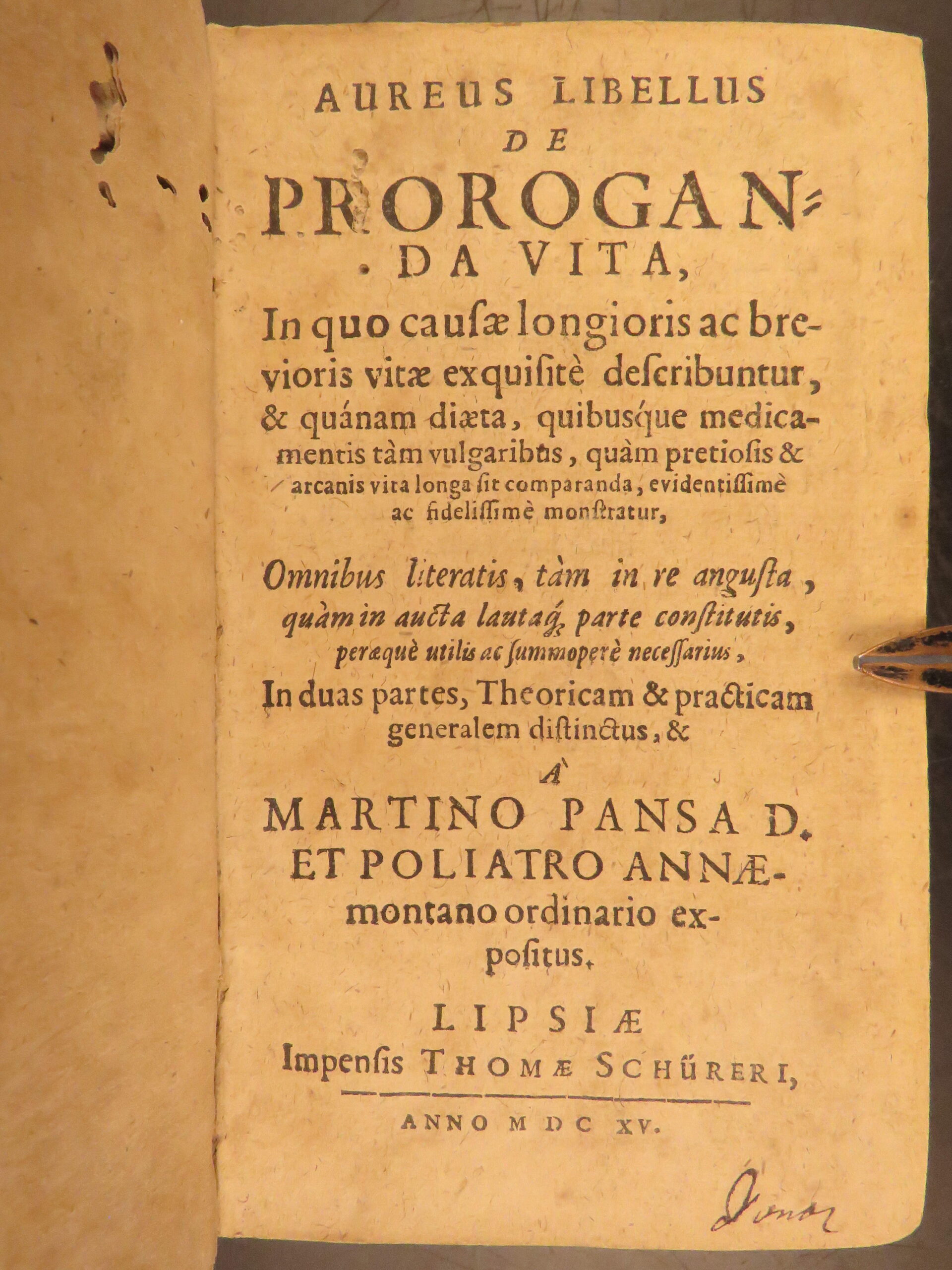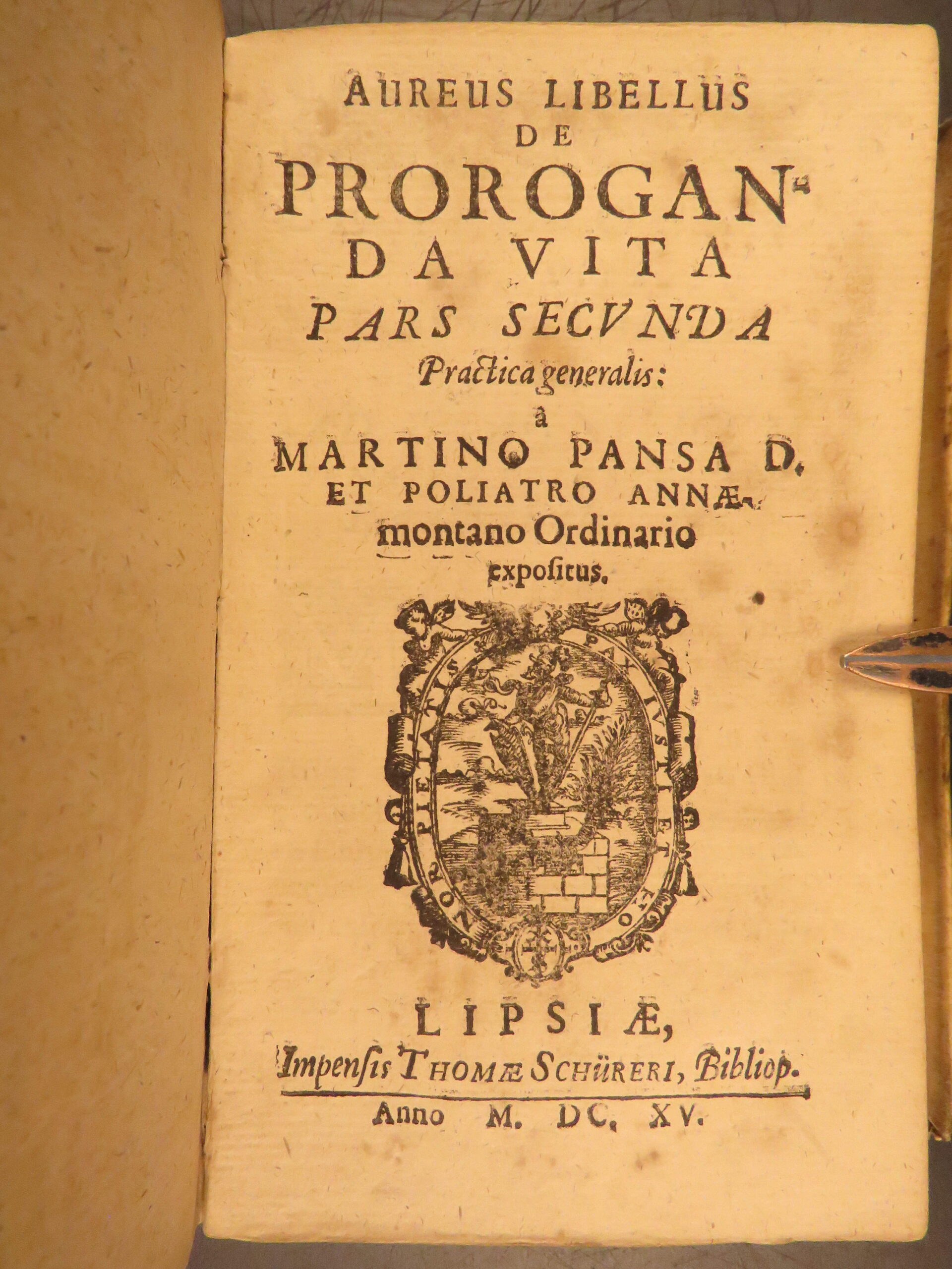 Aureus Libellus de Proroganda Vita by Martin Pansa, 1615, is a Latin medical text on longevity, addressing diet, environment, and the causes of long and short life.