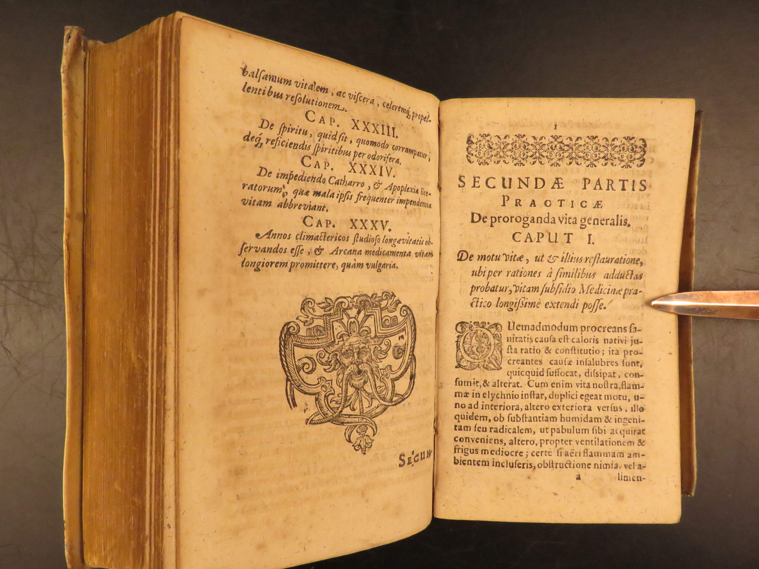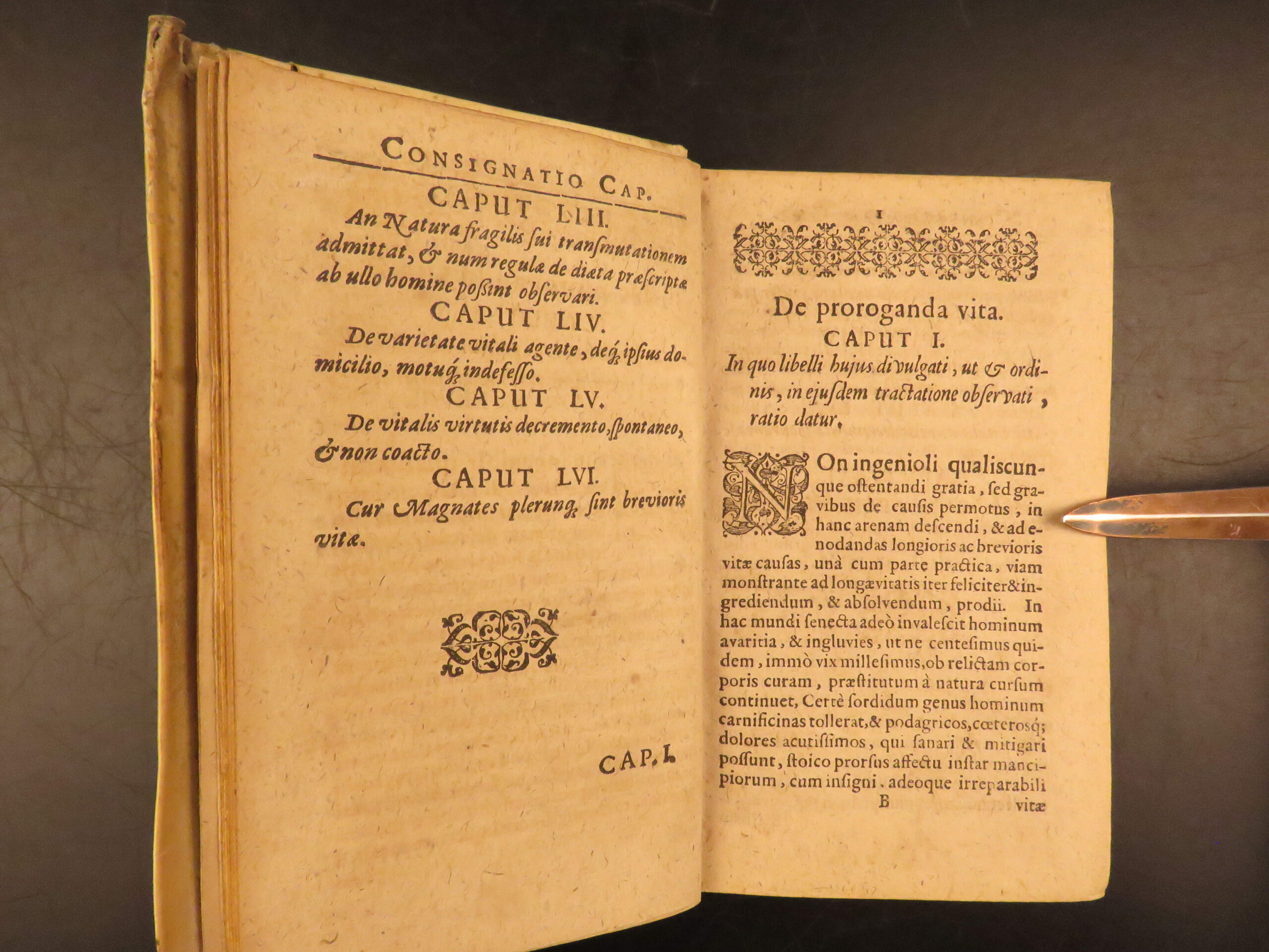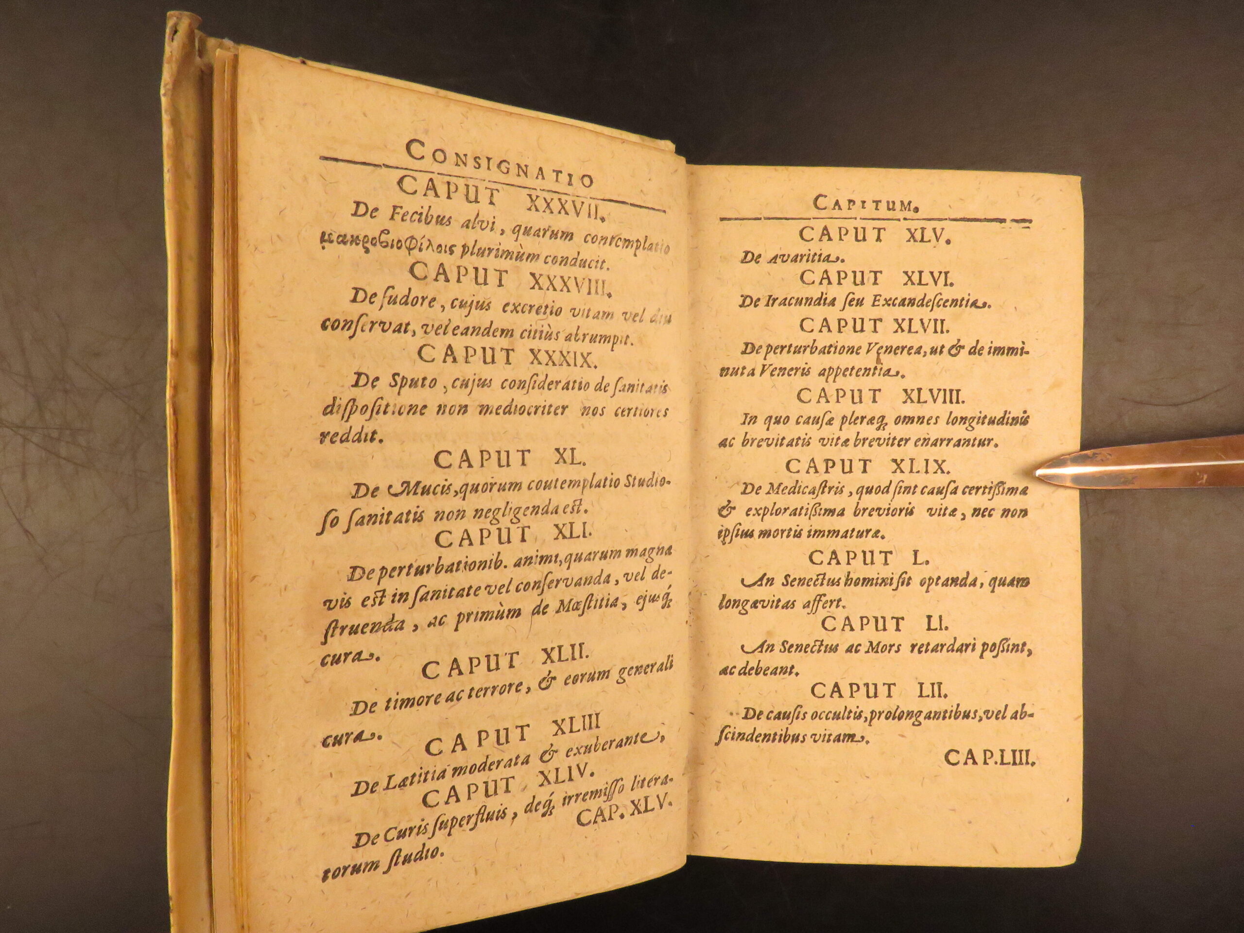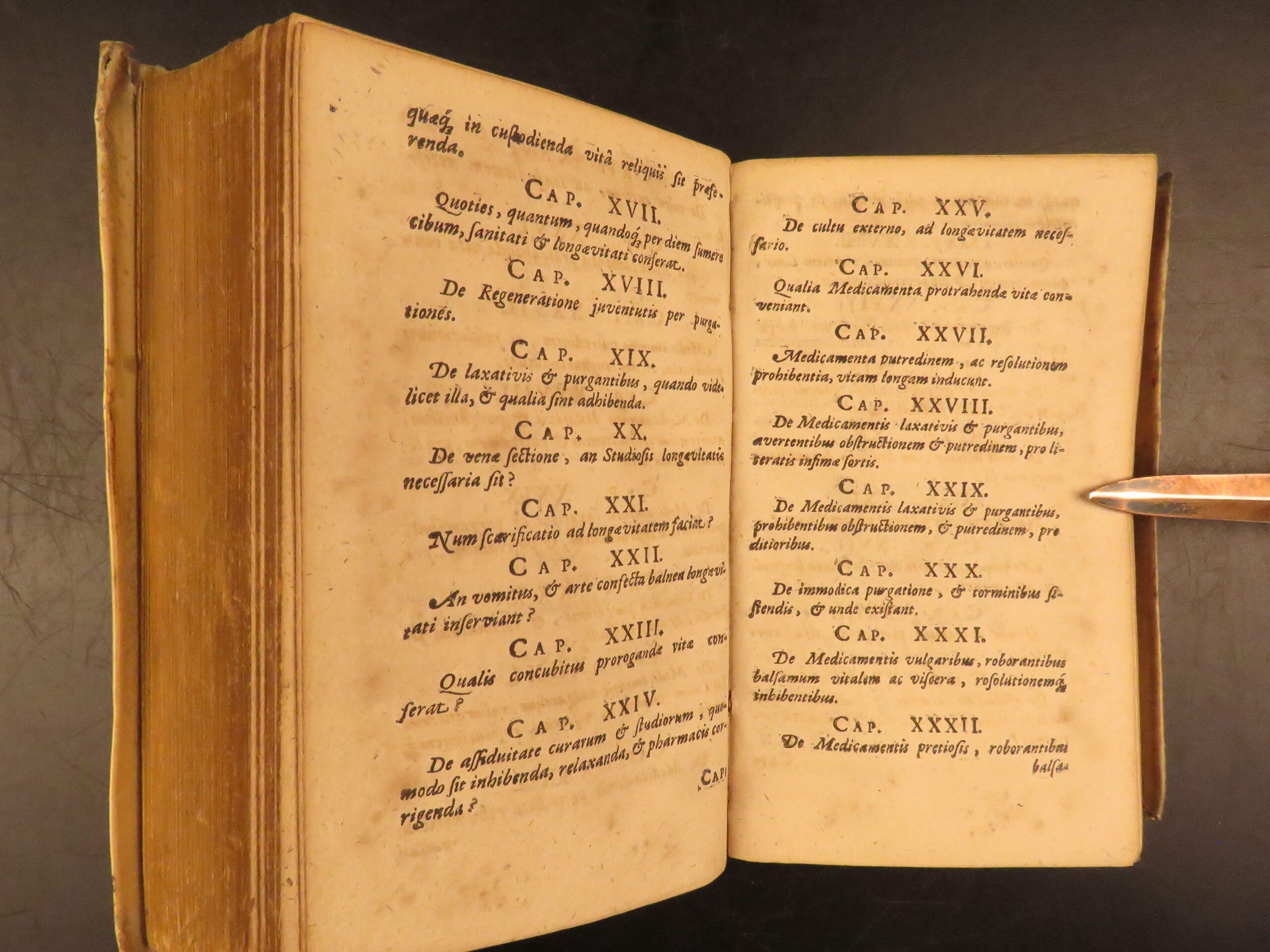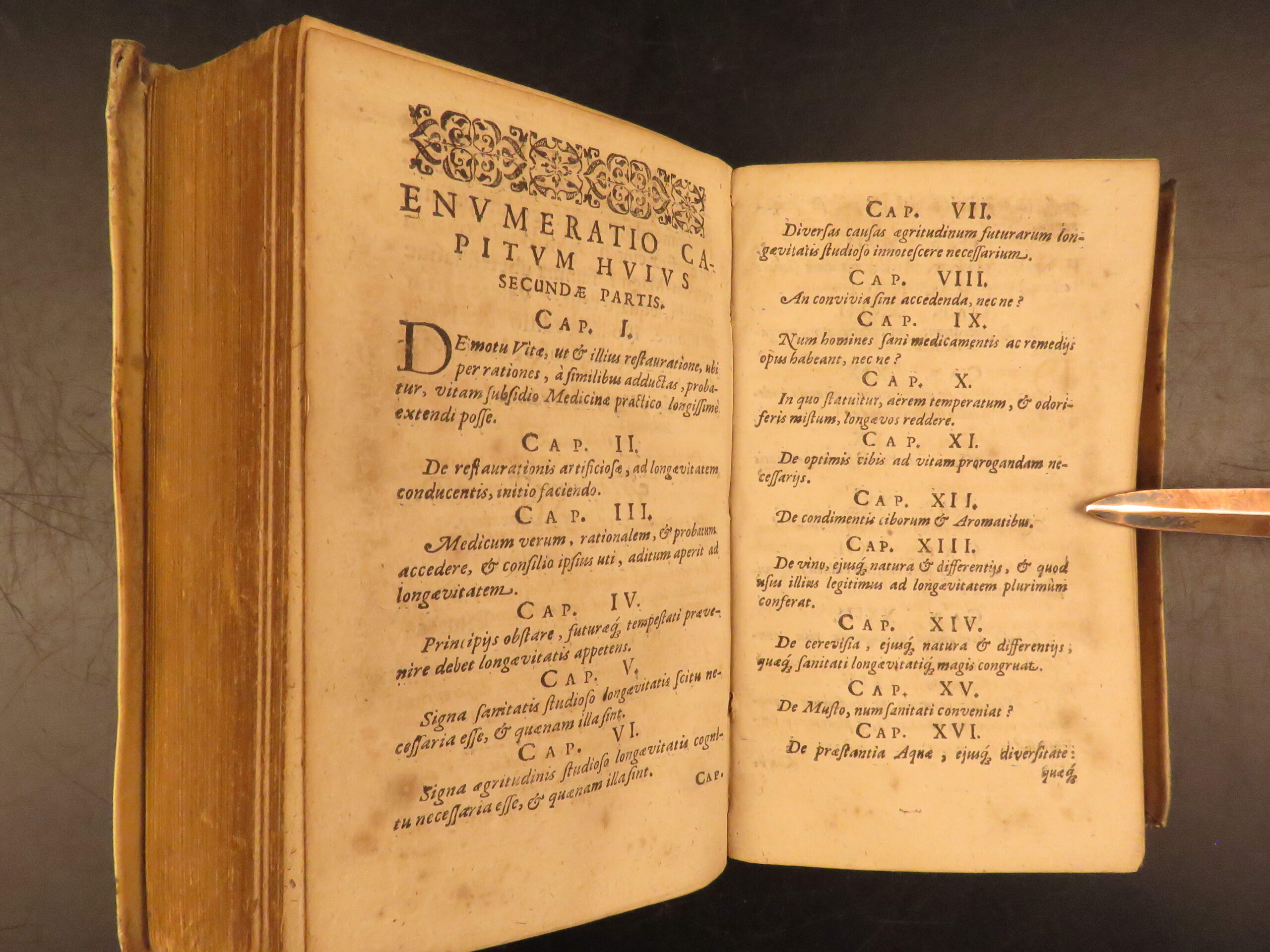 Aureus Libellus de Proroganda Vita by Martin Pansa is an early 17th-century survey on the causes of long and short life. Written from a medical perspective, this work covers questions of health, morality, and the limits of the human lifespan. To this end, Pansa even includes a section on whether humans can achieve immortality through medicine. Other sections include diet, air, environment, exercise, emotional states, and moderation in daily habits with a curious chapter on psychological concerns such as terror, damage of sexual restraint, and the fear of death.