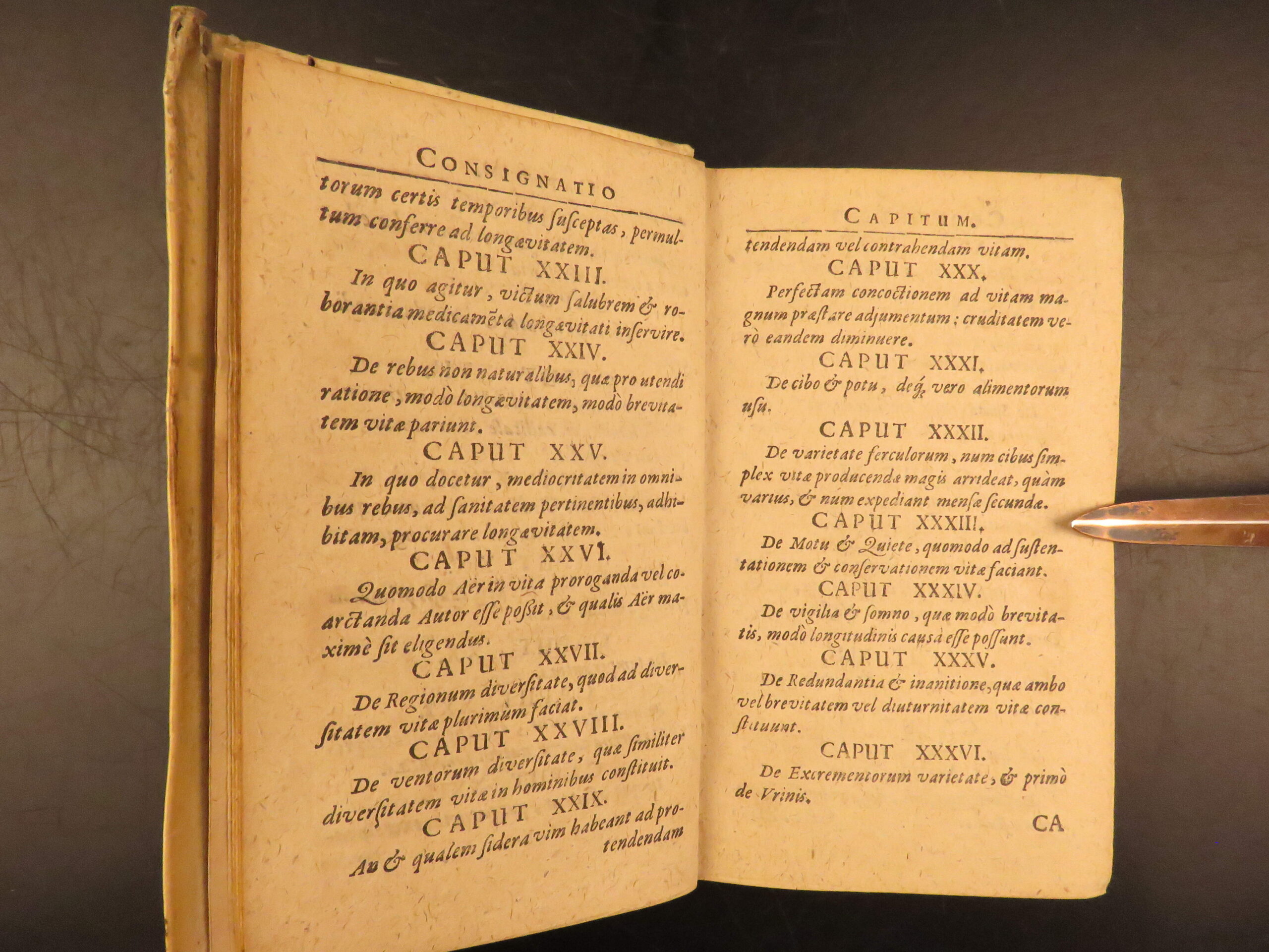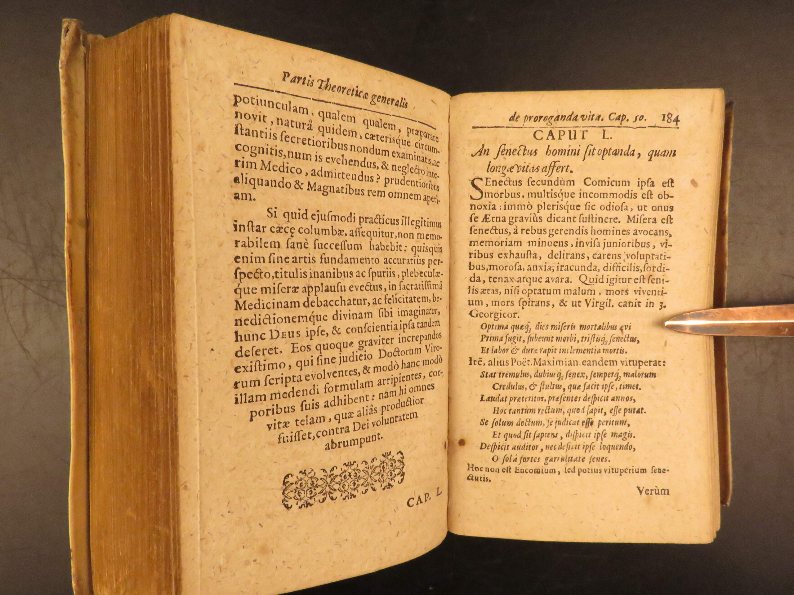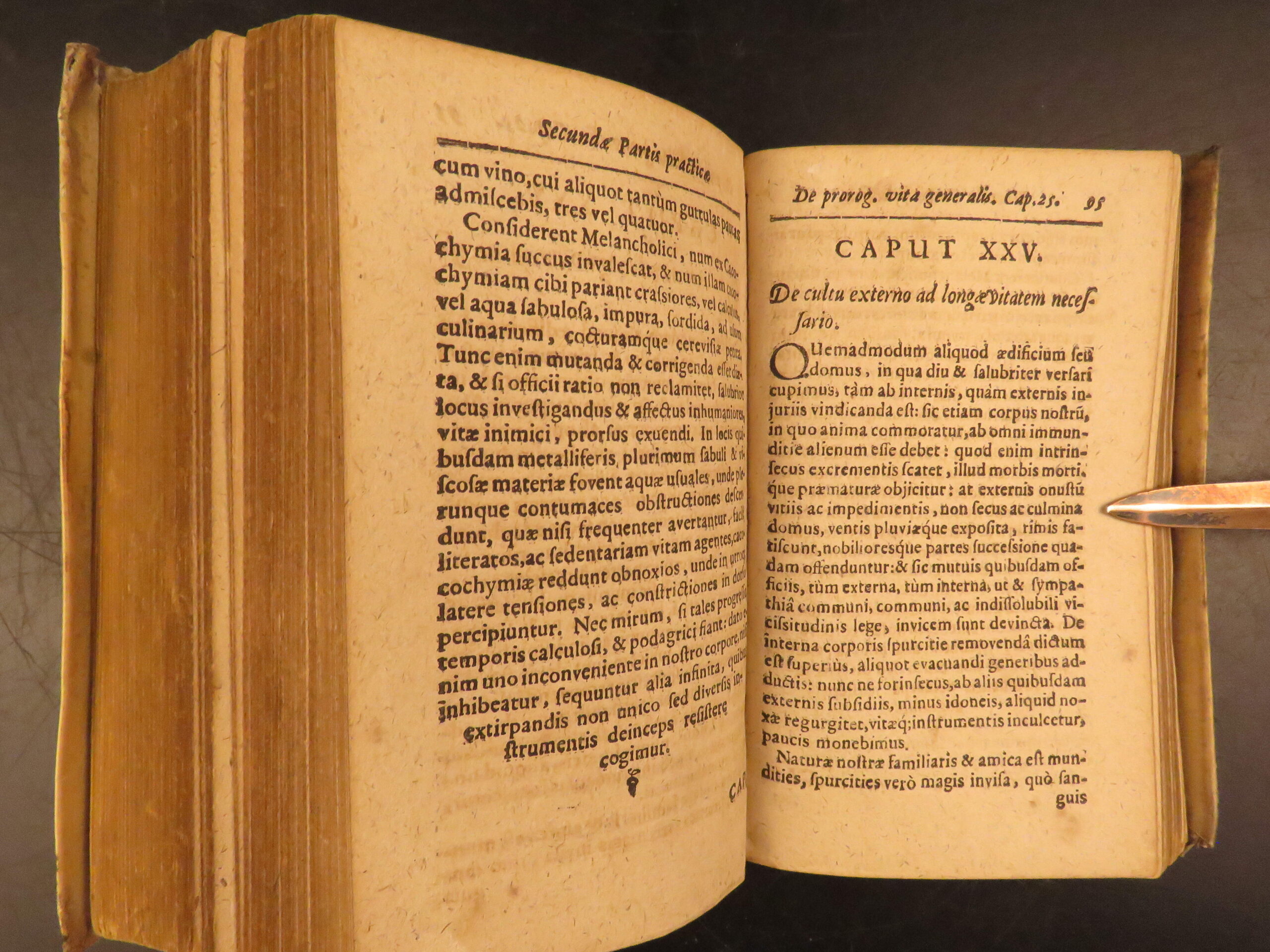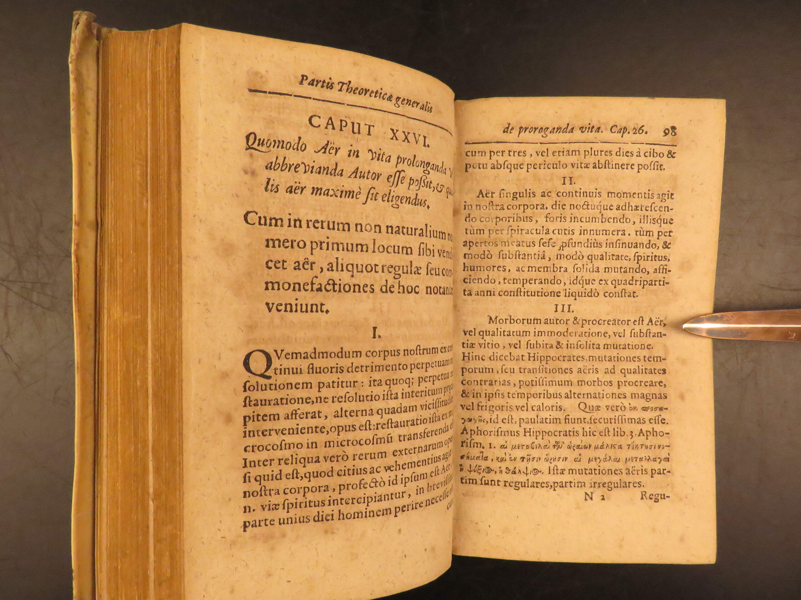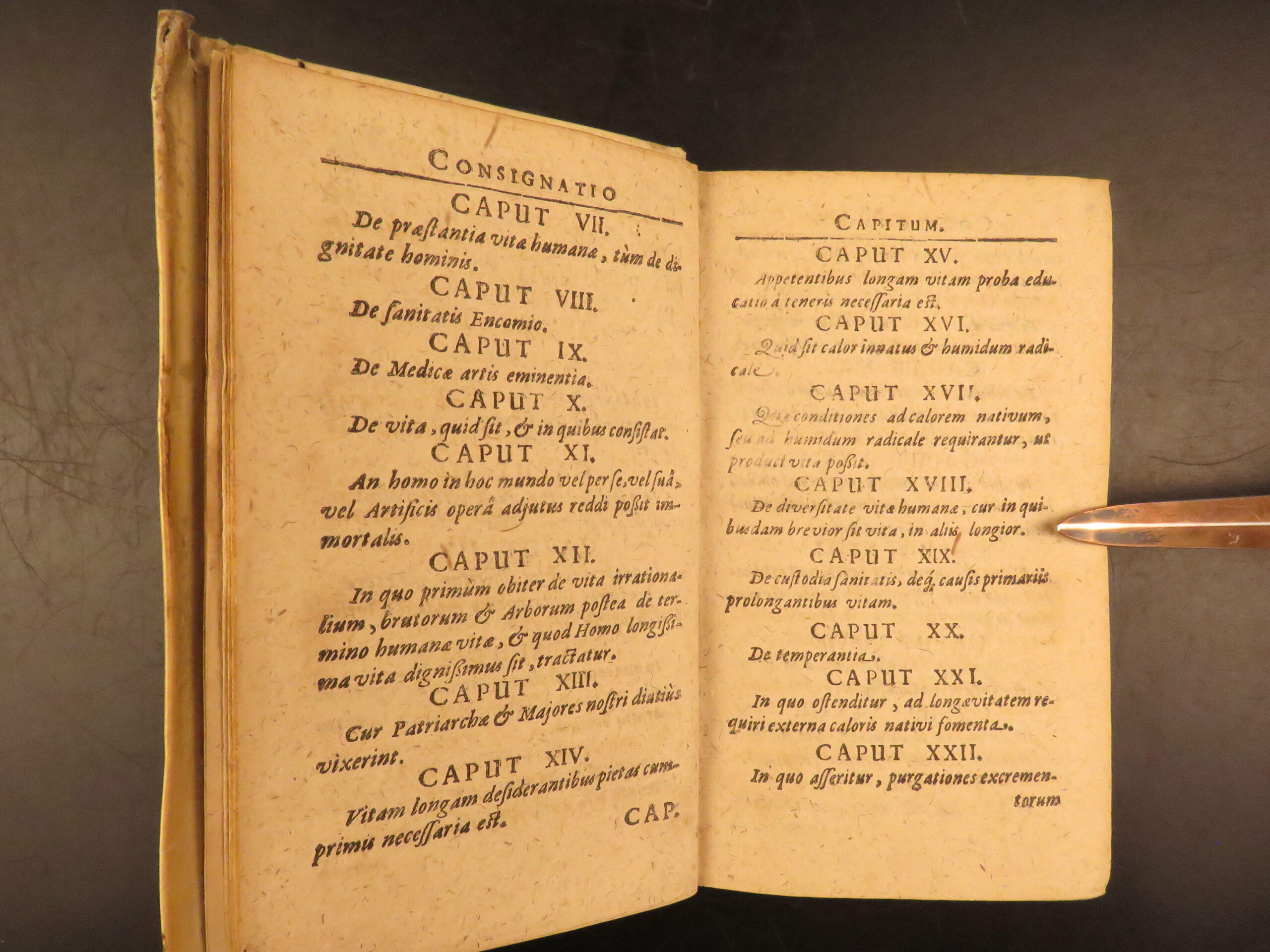 Aureus Libellus de Proroganda Vita by Martin Pansa is an early 17th-century survey on the causes of long and short life. Written from a medical perspective, this work covers questions of health, morality, and the limits of the human lifespan. To this end, Pansa even includes a section on whether humans can achieve immortality through medicine. Other sections include diet, air, environment, exercise, emotional states, and moderation in daily habits with a curious chapter on psychological concerns such as terror, damage of sexual restraint, and the fear of death.