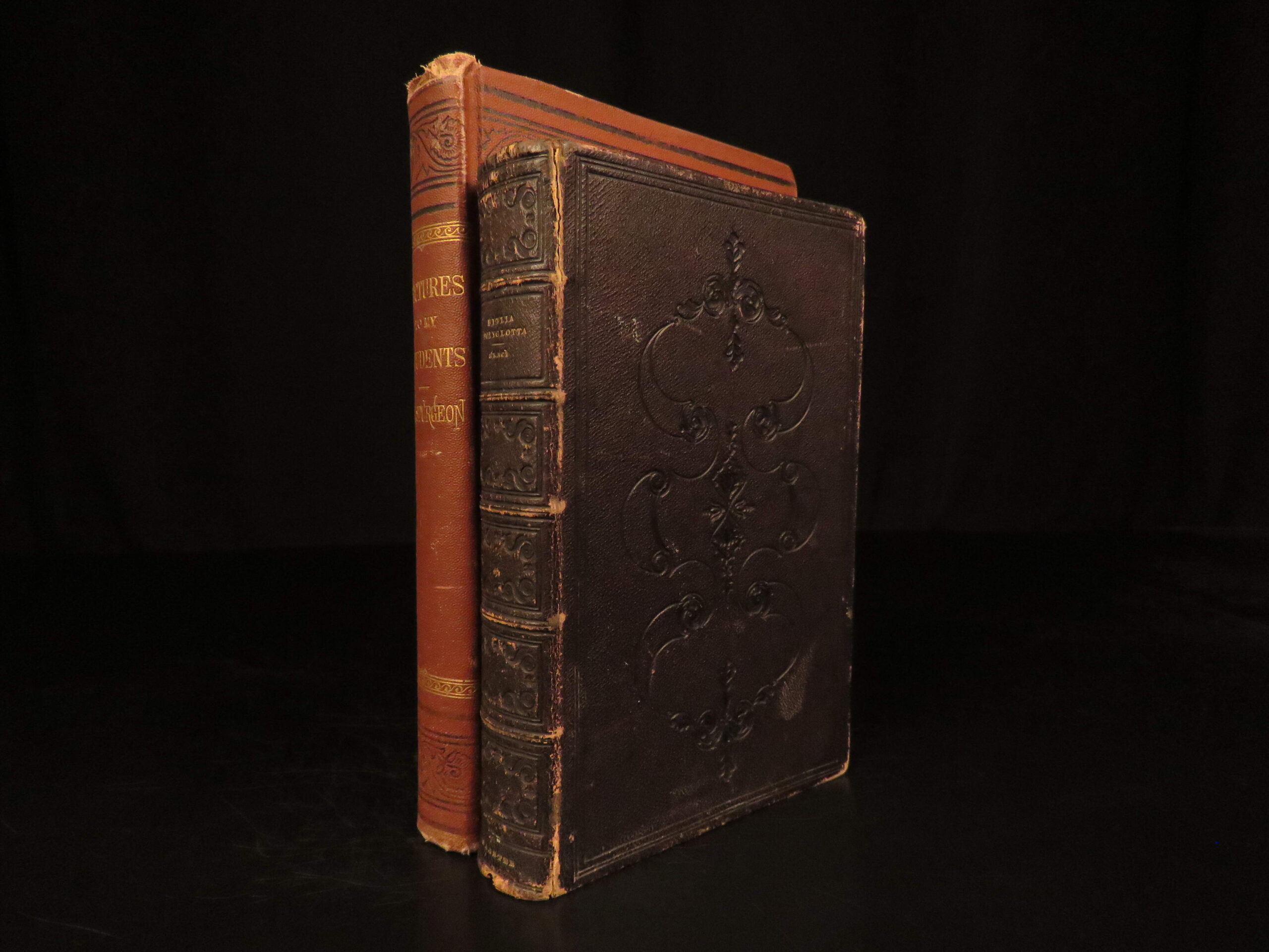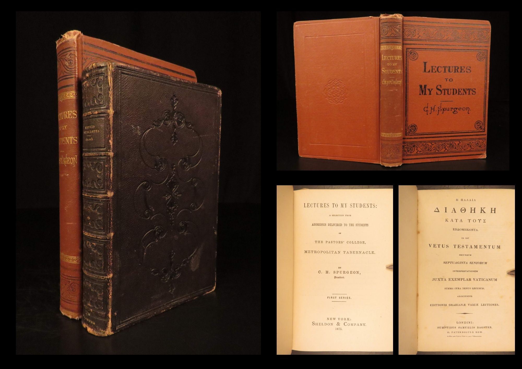 A charming lot of 2 volumes of religious texts, “Lectures to My Students” by Charles Spurgeon and a Greek Polyglot Bible published in London circa 1830. Bagster’s Greek Bibles are prized among collectors for their clean Greek typography, the integration of variant readings, and their influence on the distribution of biblical texts in England during the early Victorian era. This example features both the Septuagint text based on the Vatican edition and the New Testament based on Mill and Griesbach, making it a desirable reference point for students of textual criticism and for collectors of early English biblical scholarship. This copy is preserved in its original black leather binding with attractive blind tooling, an appealing survival from the 1830s.