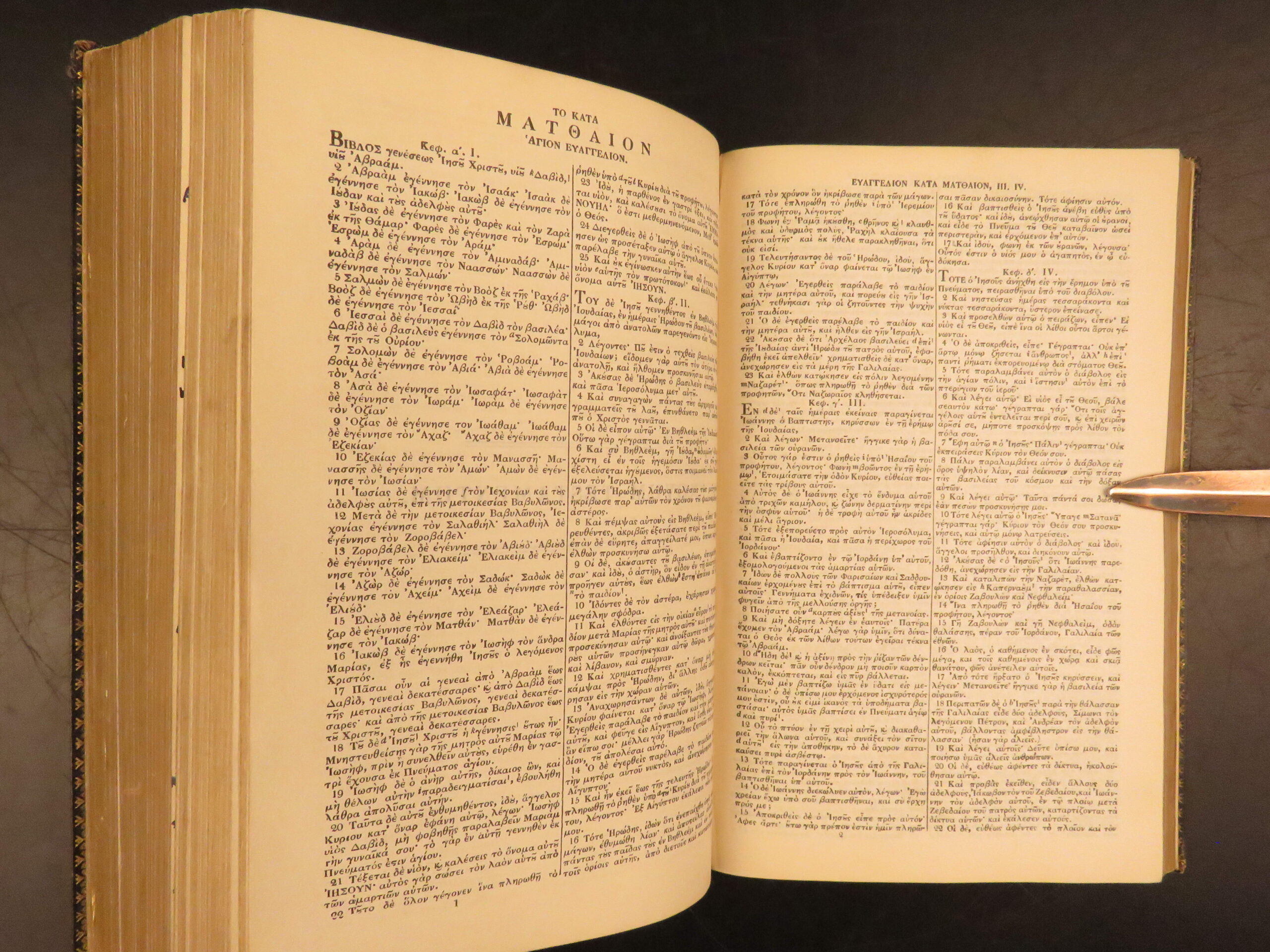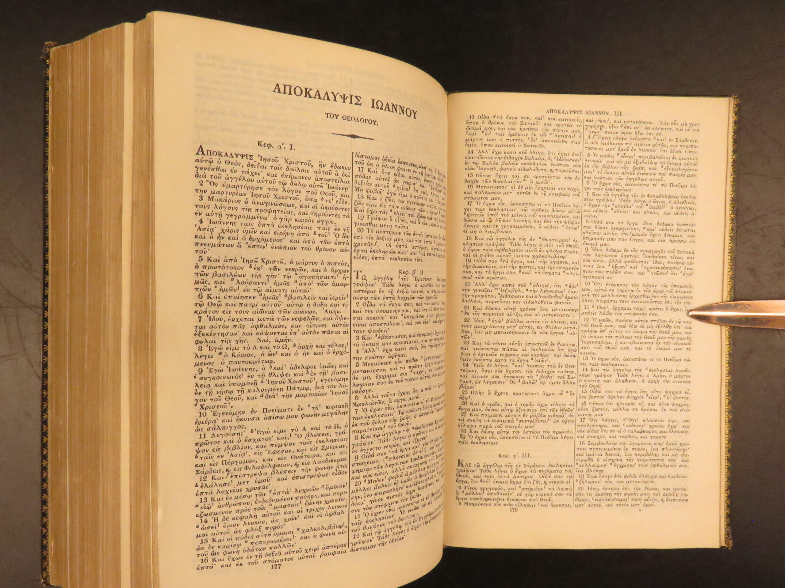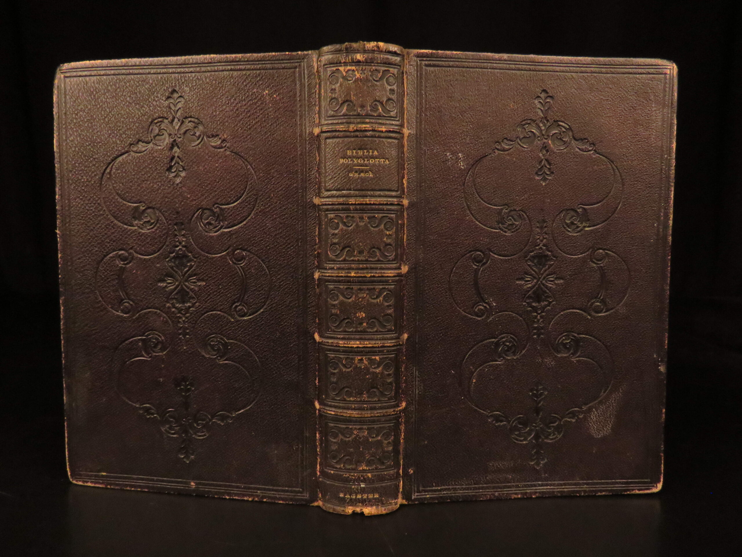 Good. Cloth binding is secure, moderate rubbing to corners and spine ends; leather is rubbed at corners and along the spine, with slight separation at the front inner hinge at the head of the spine. Text blocks clean and complete, with consistent age-toning to the pages. Occasional annotations in the Greek Bible from a previous reader.