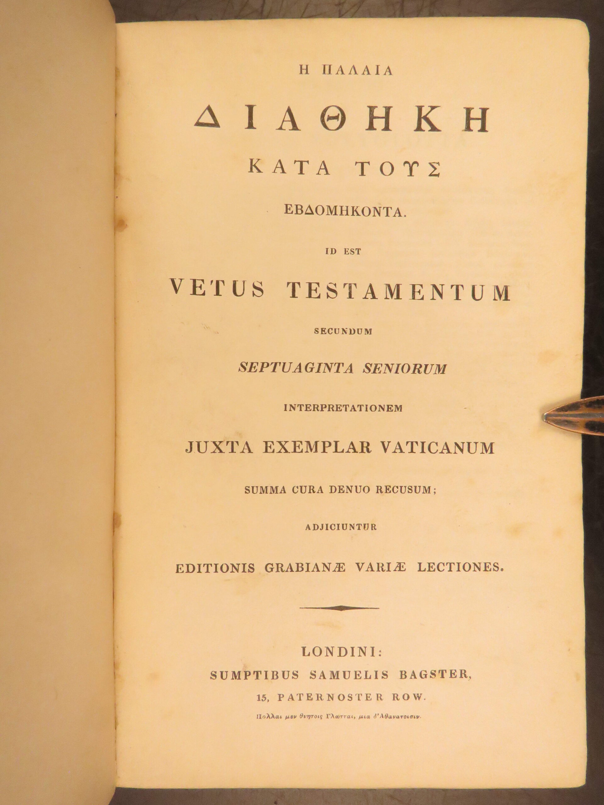 • Title: Η ΠΑΛΑΙΑ ΔΙΑΘΗΚΗ ΚΑΤΑ ΤΟΥΣ ΕΒΔΟΜΗΚΟΝΤΑ. ID EST VETUS TESTAMENTUM SECUNDUM SEPTUAGINTA SENIORUM INTERPRETATIONEM JUXTA EXEMPLAR VATICANUM SUMMA CURA DENUO RECUSUM; ADJICIUNTUR EDITIONIS GRABIANAE VARIAE LECTIONES.