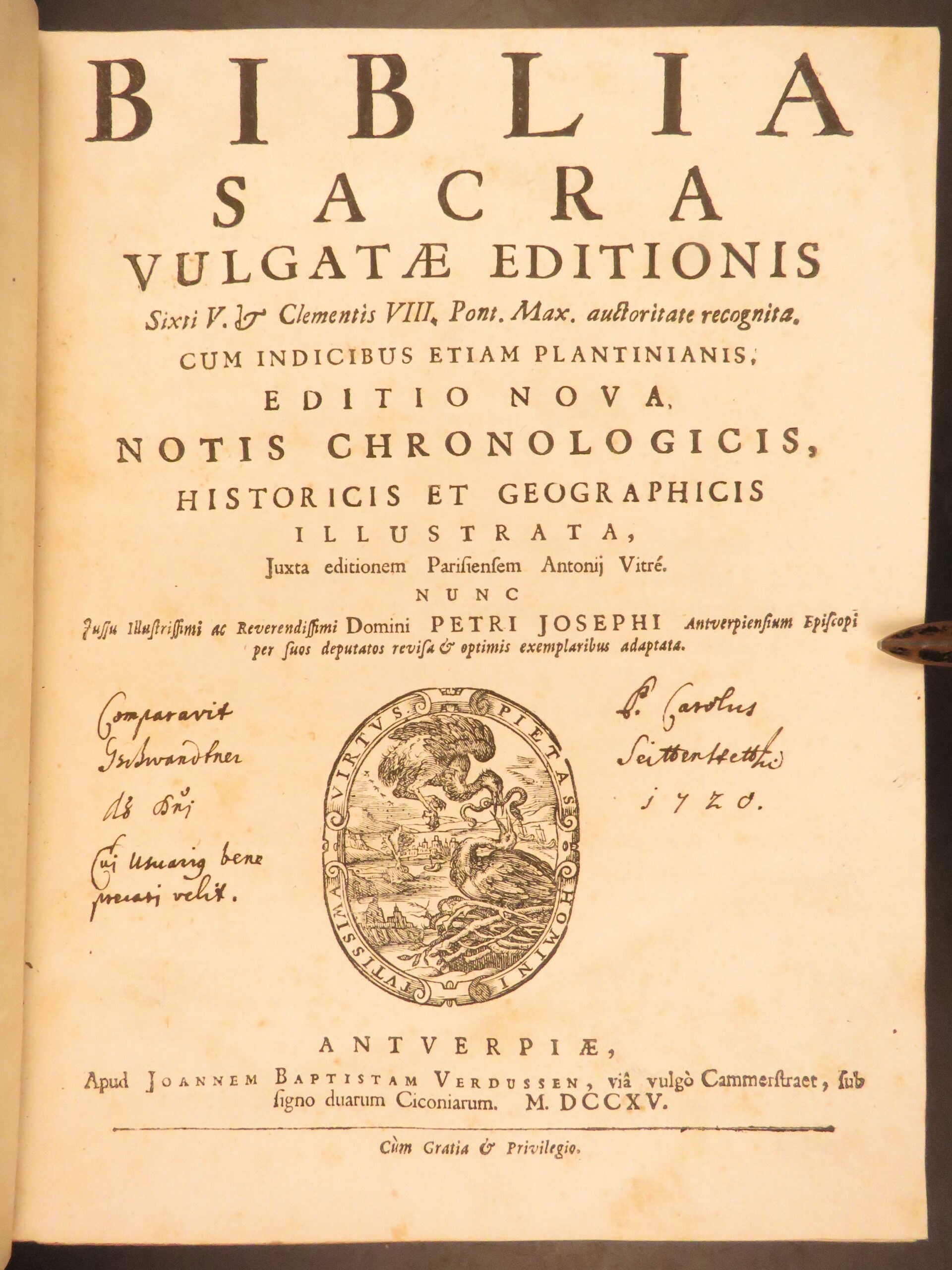 Biblia Sacra Vulgatae Editionis, printed in Antwerp in 1715, contains the Latin Vulgate text with Old and New Testaments and Apocrypha, issued by Verdussen with an engraved title page in quarto format.