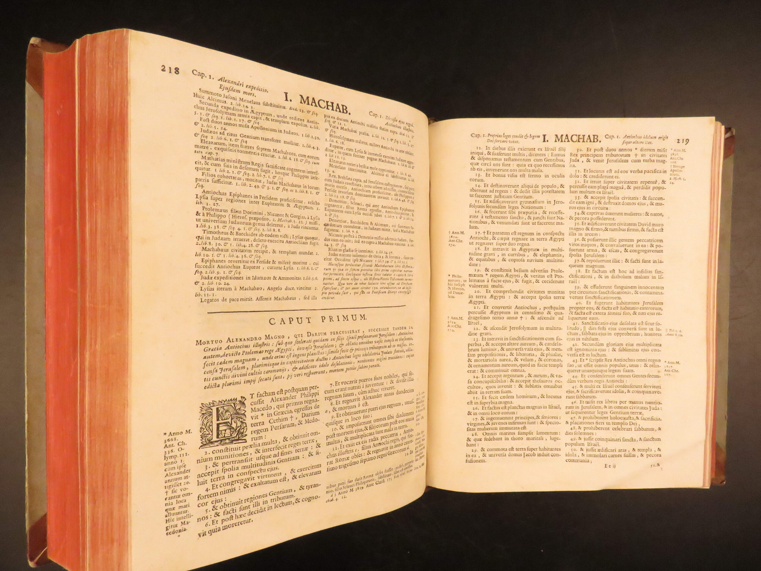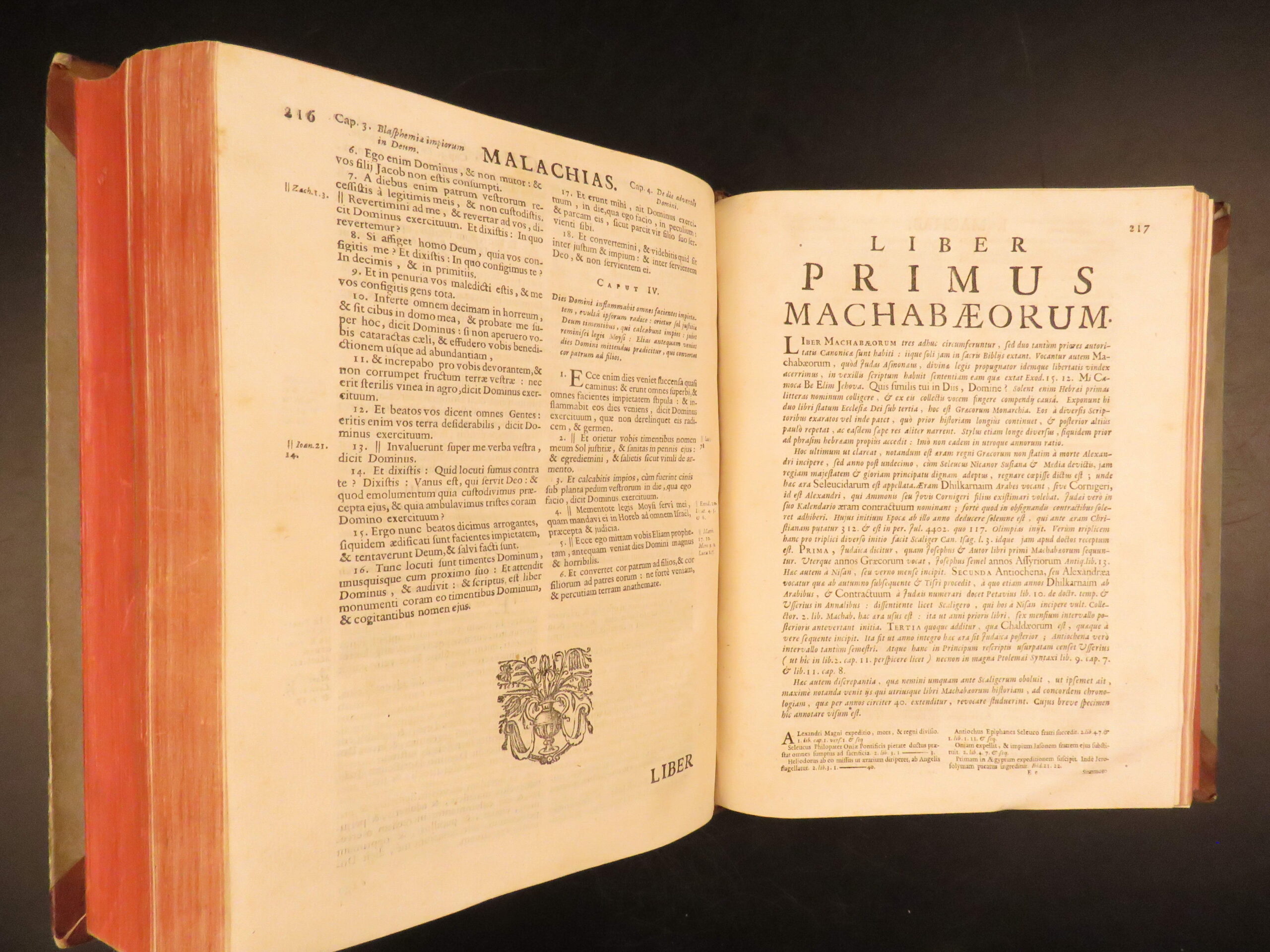 A rare, early 18th-century Biblia Sacra published in Antwerp in 1715. This Bible include the Vulgate Latin text, edited by Antonius Vitre. Vitre editions of the Vulgate Bible are considered some of the best Vulgate editions. It includes both the Old and New Testaments along with Apocryphal books and marginal references.