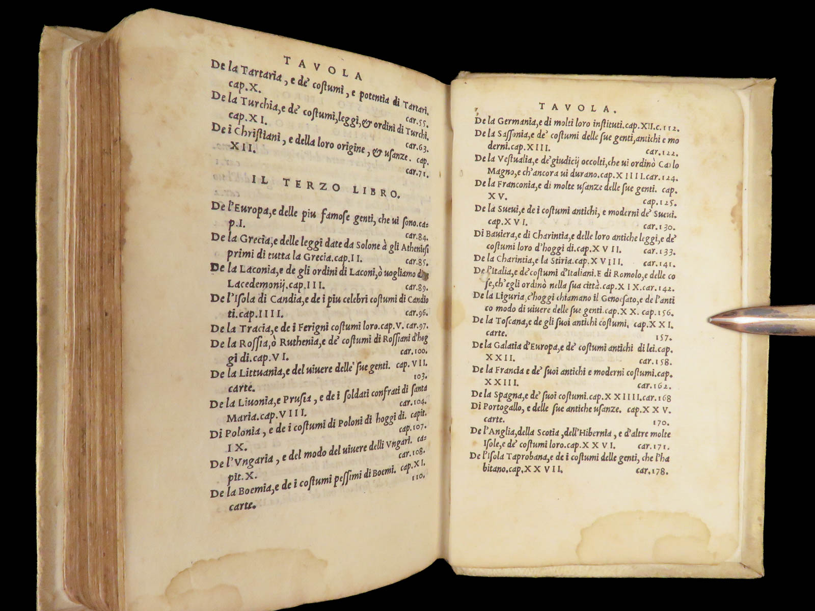 Gli costumi, le leggi, et l’usanze di tutte le genti by Joannes Boemus, is a 1543 first Italian edition of his influential ethnographic text, Omnium Gentium Mores, Leges et Ritus, first published in Latin in 1520. This book was the is a collection of descriptions of royal rituals, clothing customs, food laws, religious practices, and societal expectations, many of which are drawn from classical authors such as Tacitus and Herodotus.