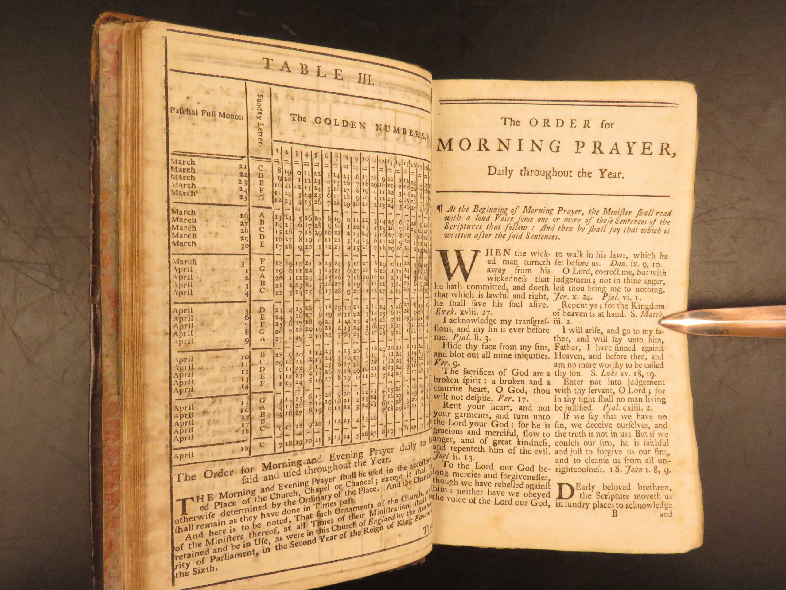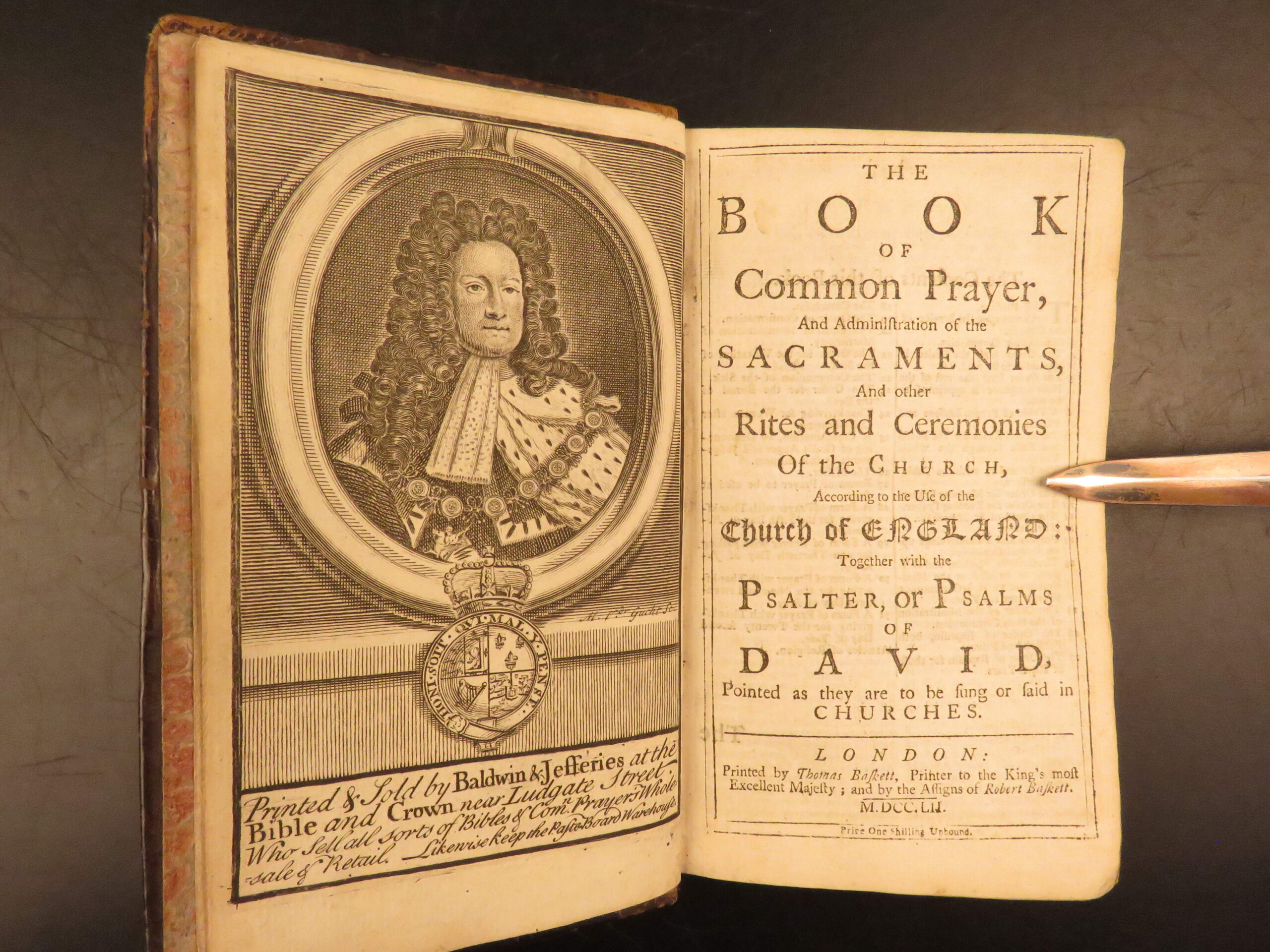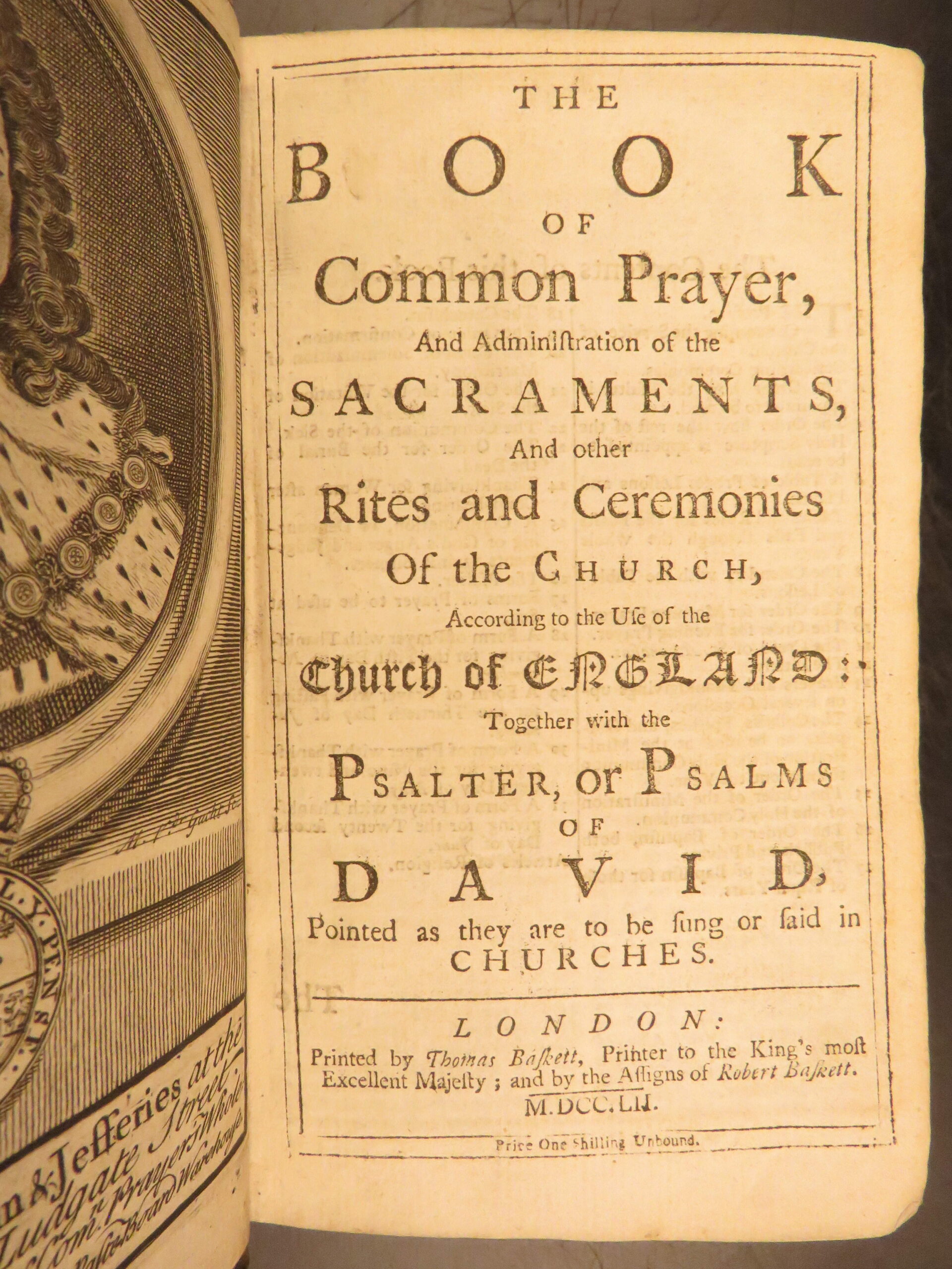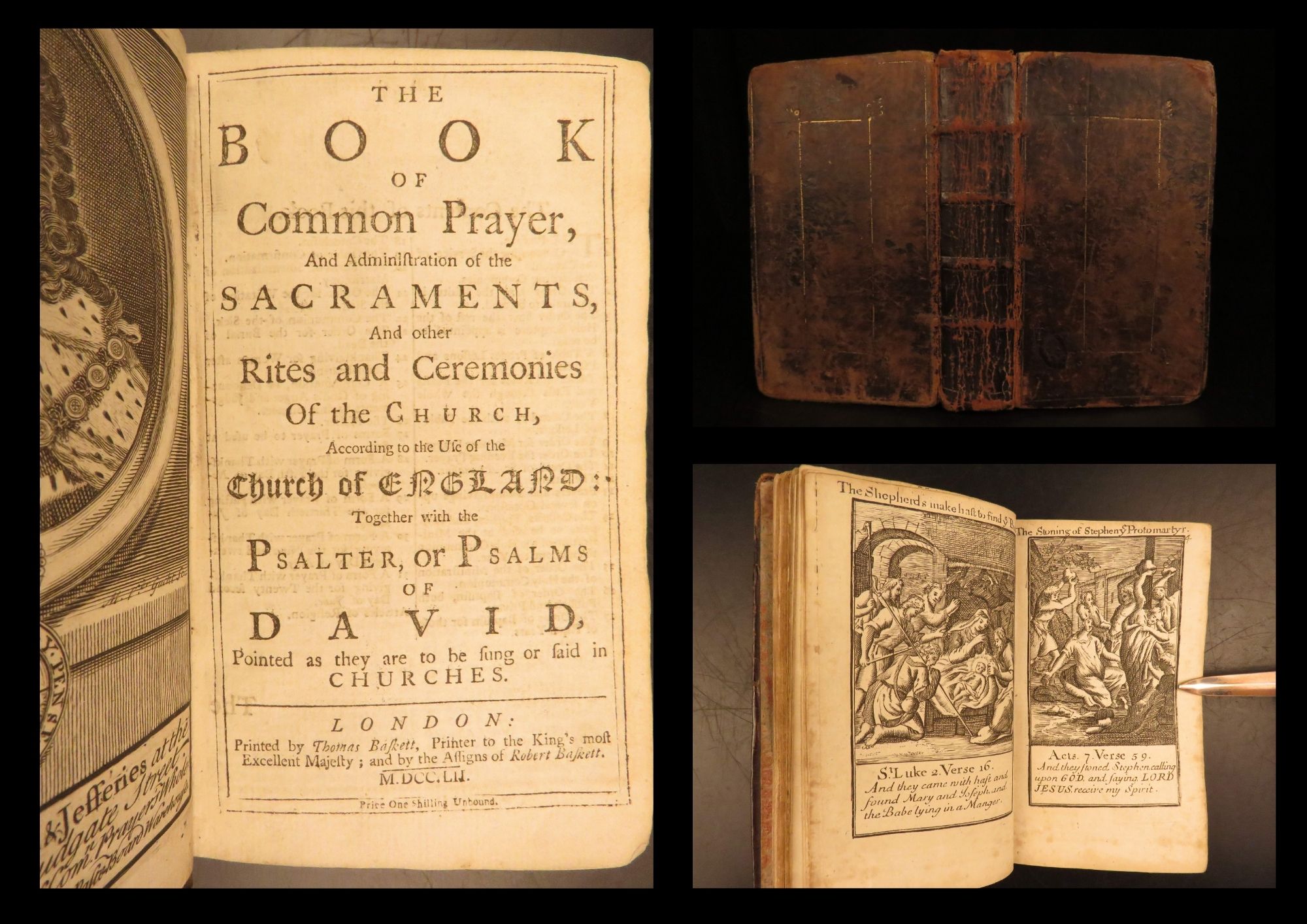 Church of England’s 1752 Book of Common Prayer printed by Thomas Baskett in London, featuring the separately titled Whole Book of Psalms (1751), in original full leather with clean engravings.