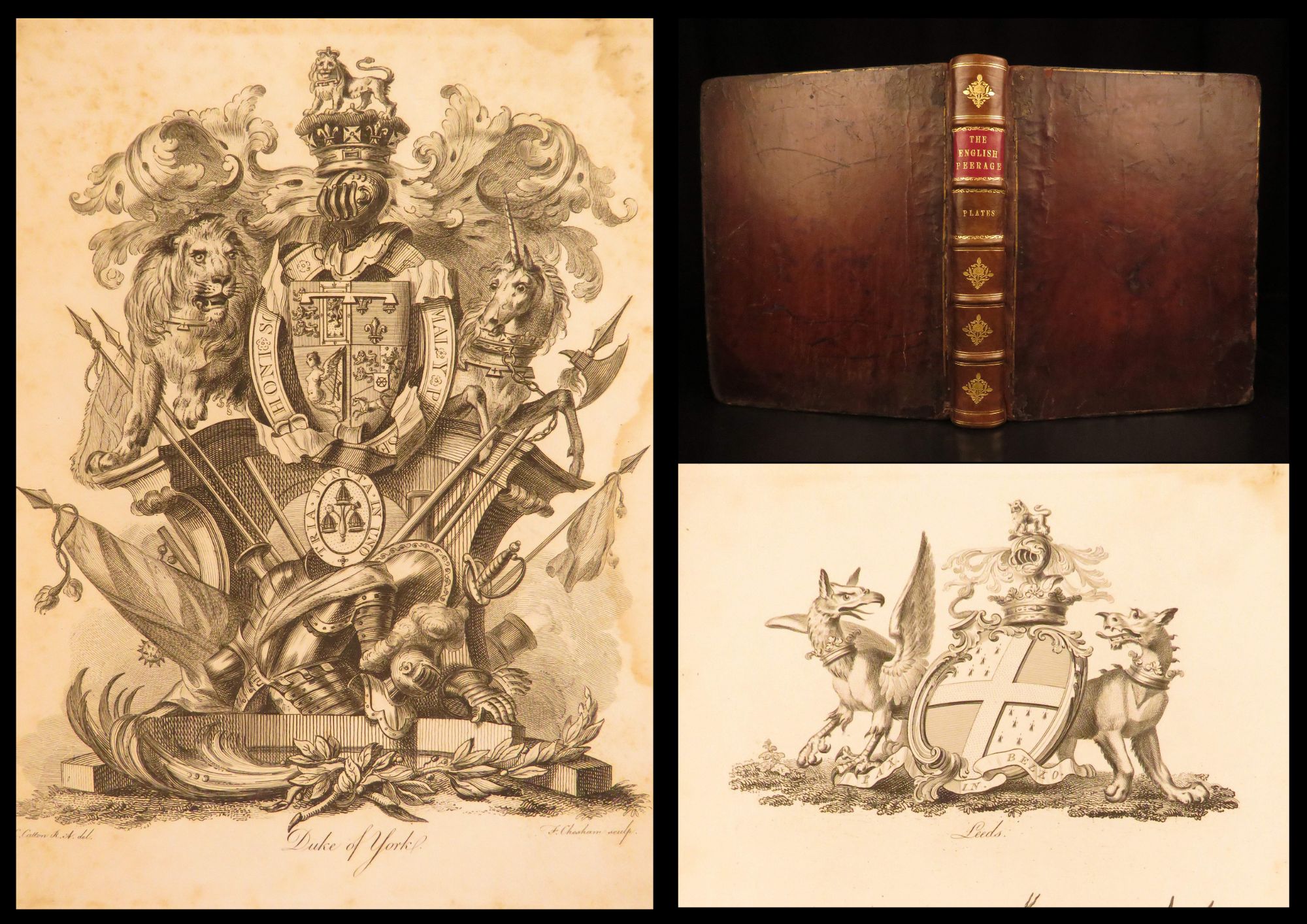Charles Catton’s “The English Peerage” is an extensive historical account of English nobility. This work covers the entirety of the English peerage from the earliest times during the Norman conquest through the end of the 18th-century. Catton focuses on various barons and viscounts, along with the rise and fall of their lineage. The set itself is popular, not just for the biographies of notable political figures, but also for the 125 highly impressive engravings – portraits, coats-of-arms – found in this third volume.