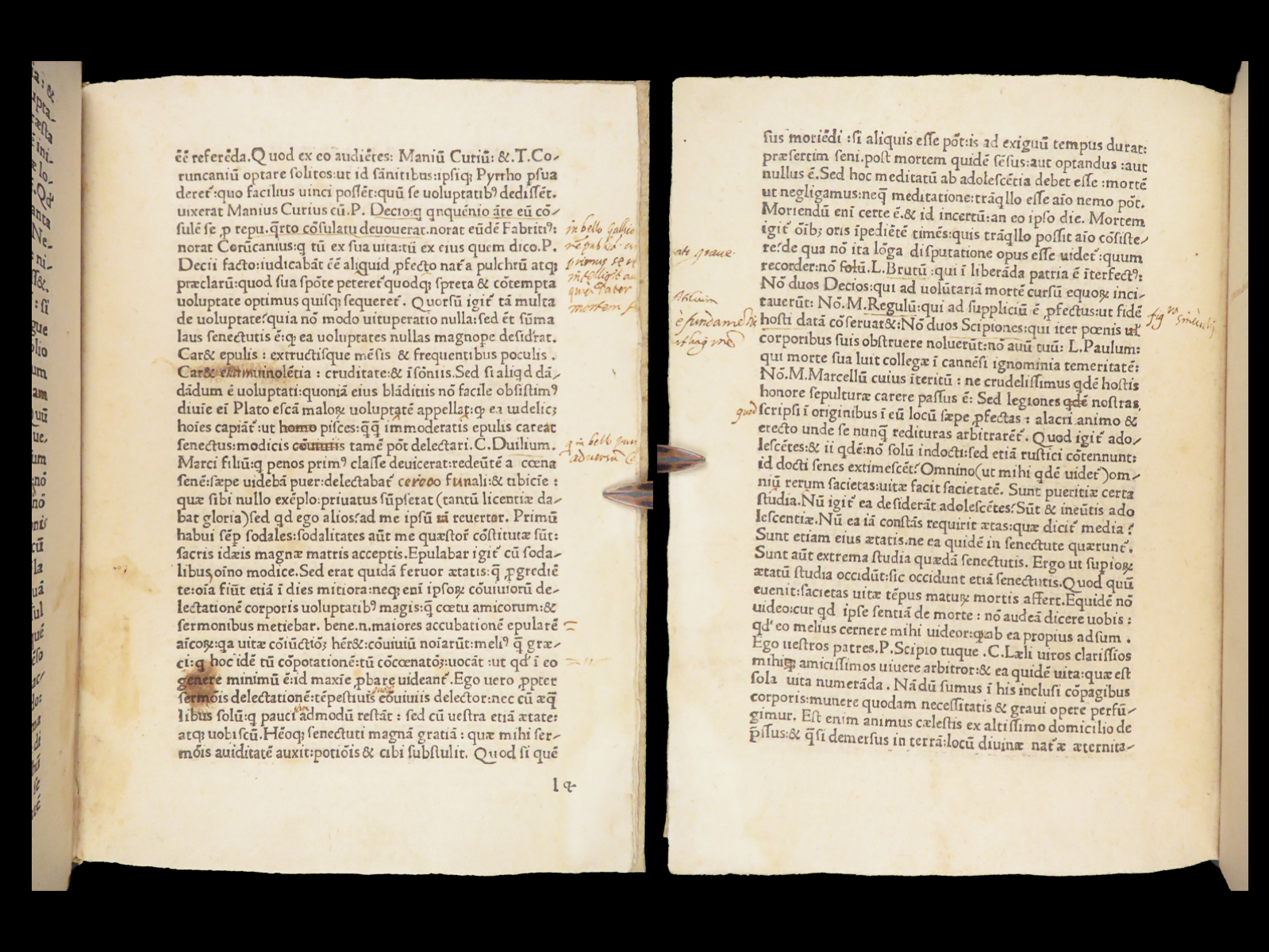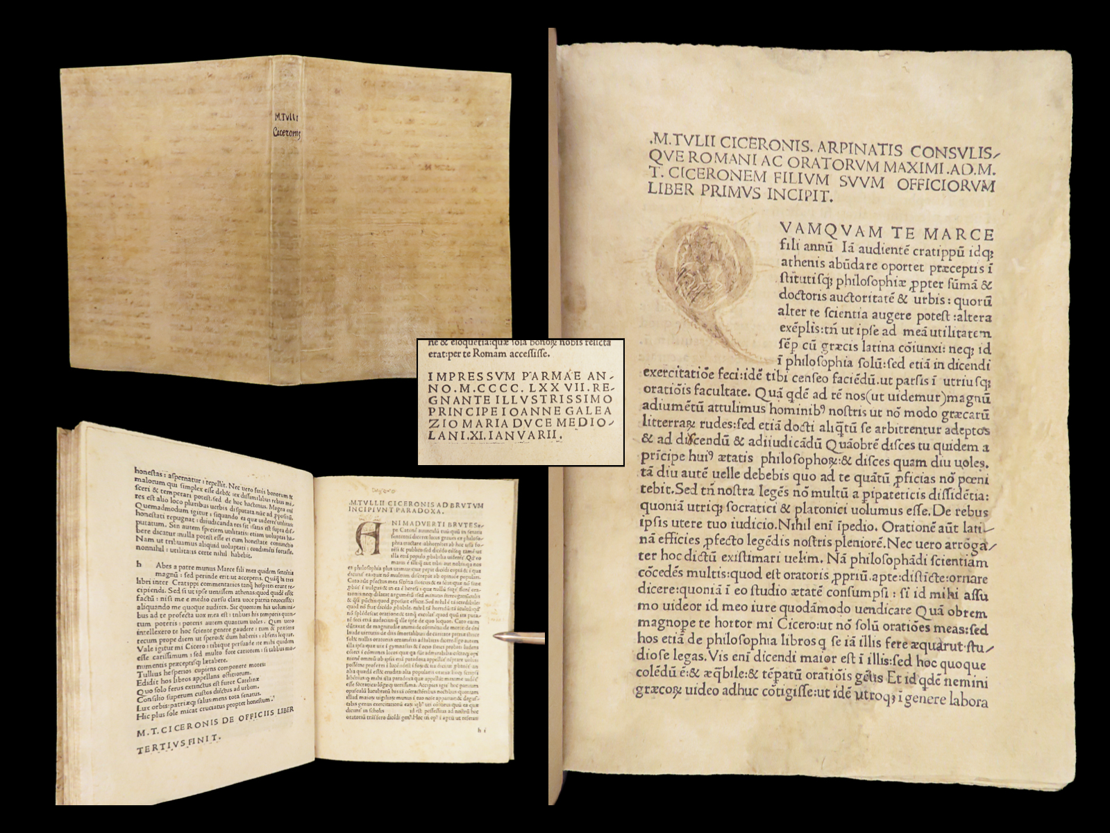 Marci Tullii Ciceronis Arpinatis consulisq[ue] Romani: ac oratorum maximi is an exceedingly rare 1477 incunable printing of Marcus Tulius Cicero’s famous treatise De Officiis. Produced in Parma by Stephanus Corallus (the first printer established Parma) on 11 January 1477, this edition was the first edition of Cicero published in Parma and remains one of the most important incunable editions of Cicero’s writings. The colophon explicitly dates the printing to Parma under the reign of Gian Galeazzo Maria Sforza, Duke of Milan.