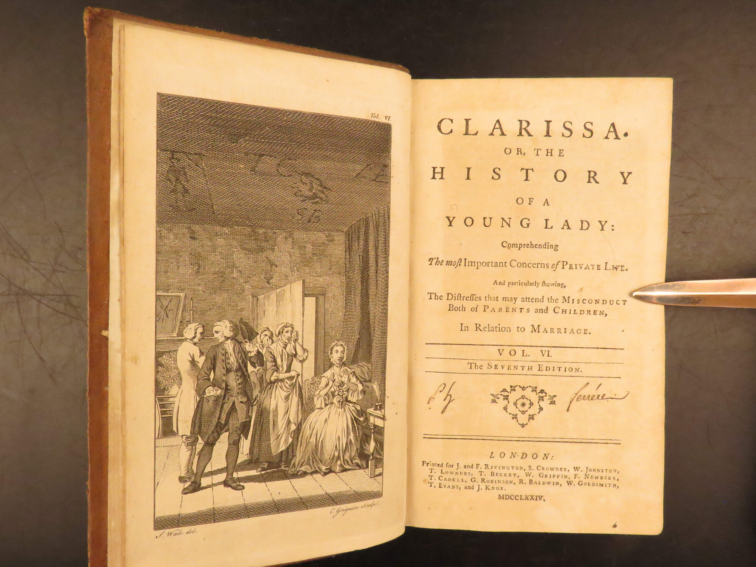 Complete eight-volume 1774 edition of Richardson’s Clarissa, printed in London by Rivington, with original frontispieces and full leather bindings.