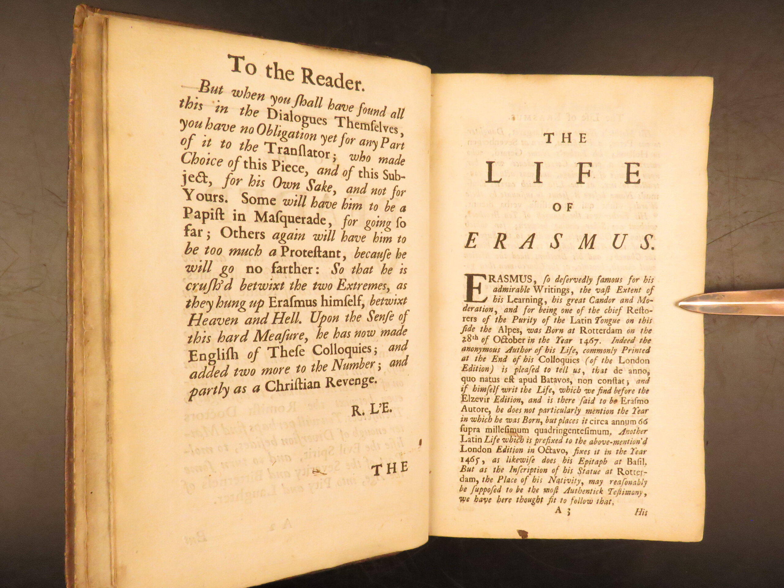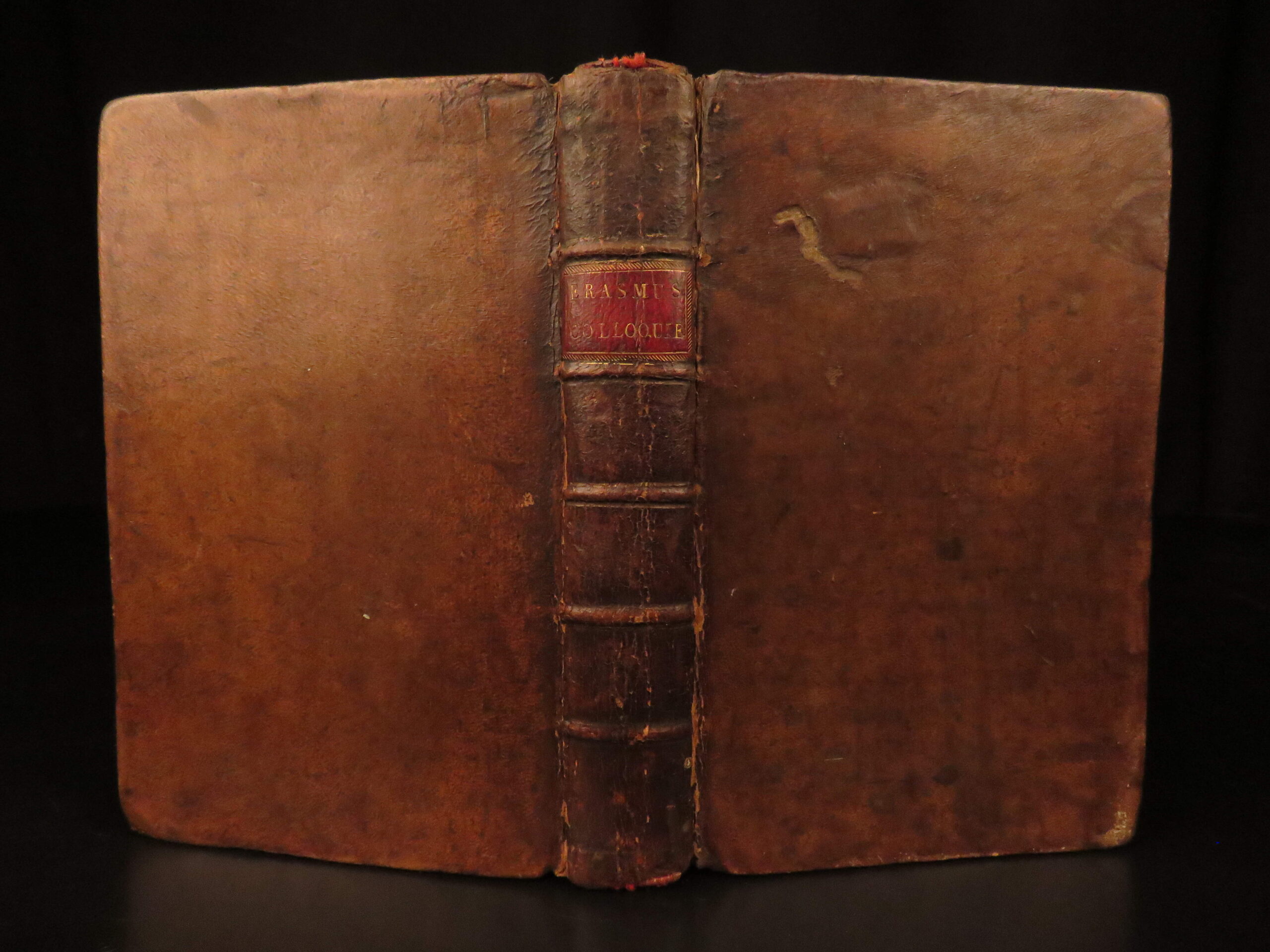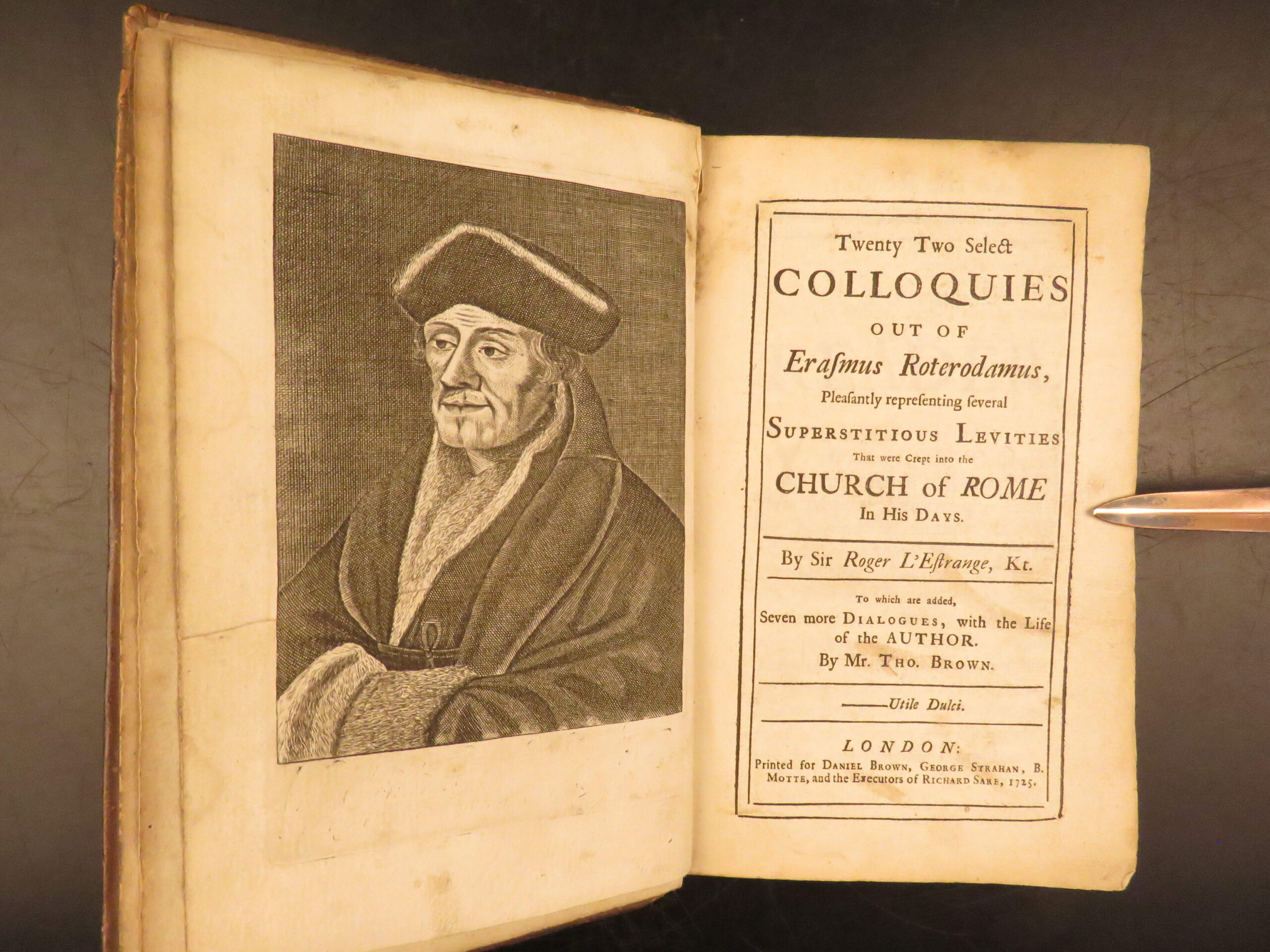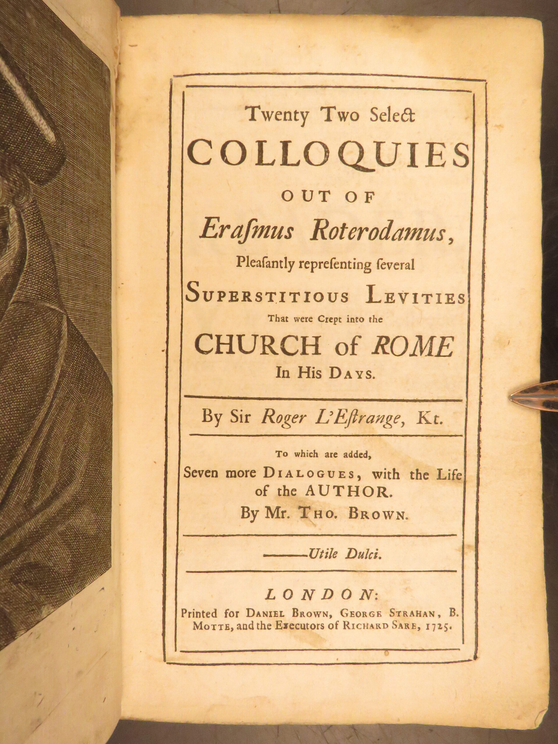 1725 – colloquies by erasmus of rotterdam | famous l’estrange english translation | 1725 english edition of erasmus’s colloquies, translated by l’estrange and featuring additions by thomas brown, bound in leather with engraved frontispiece.
