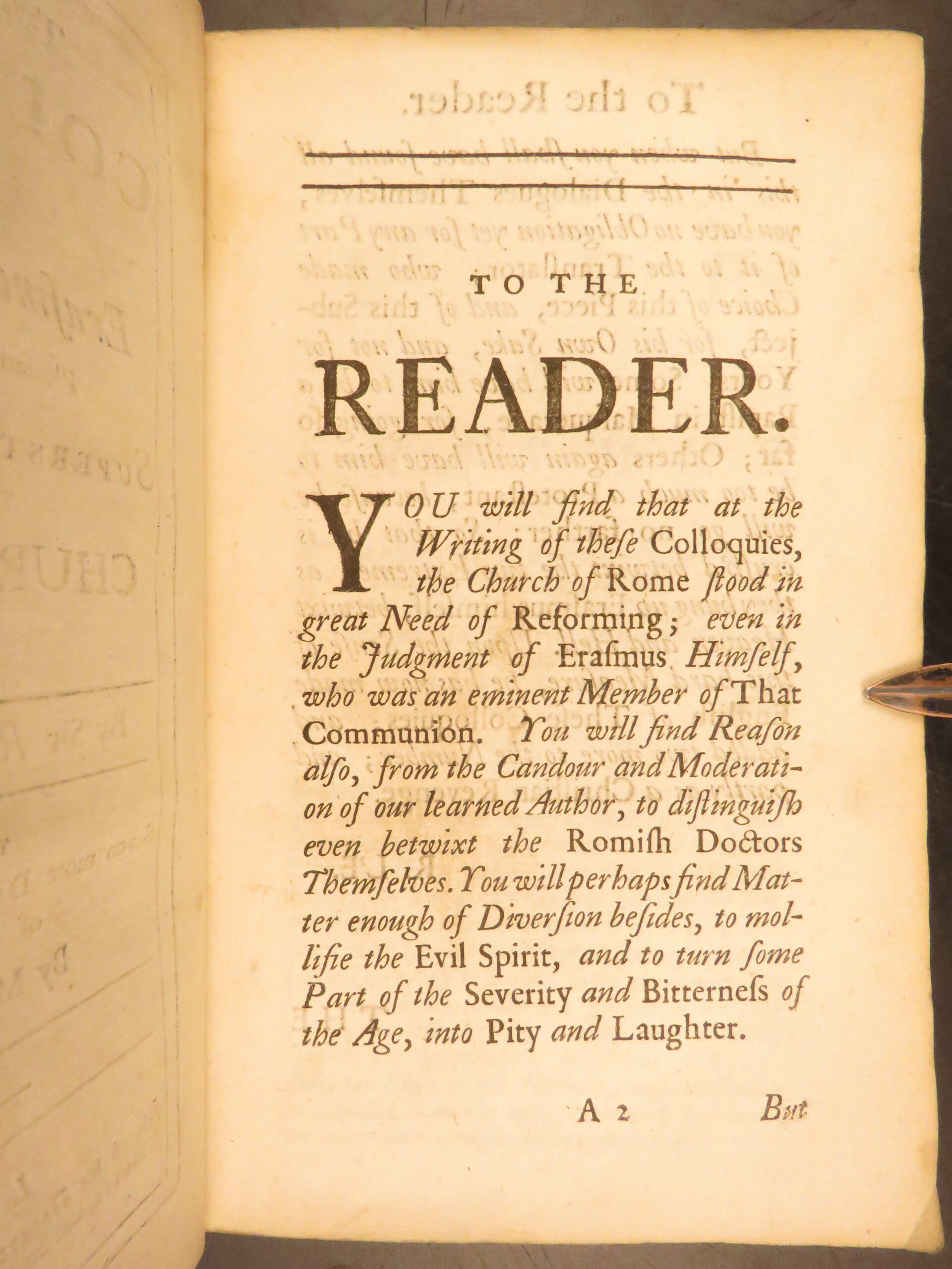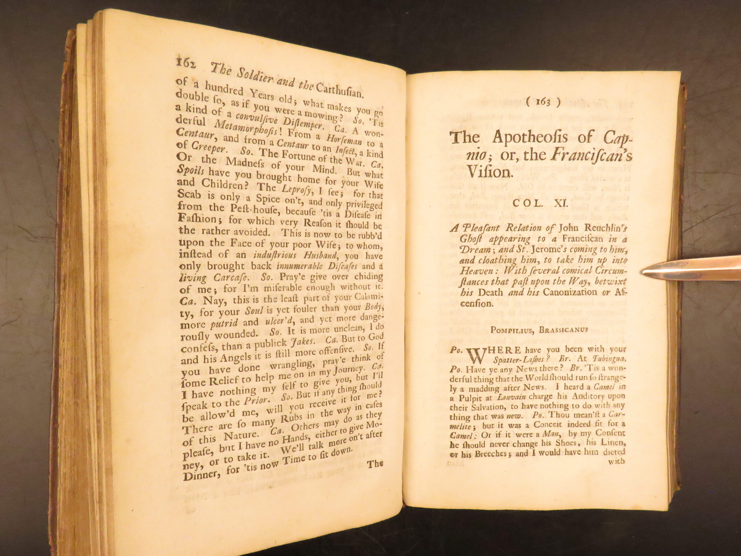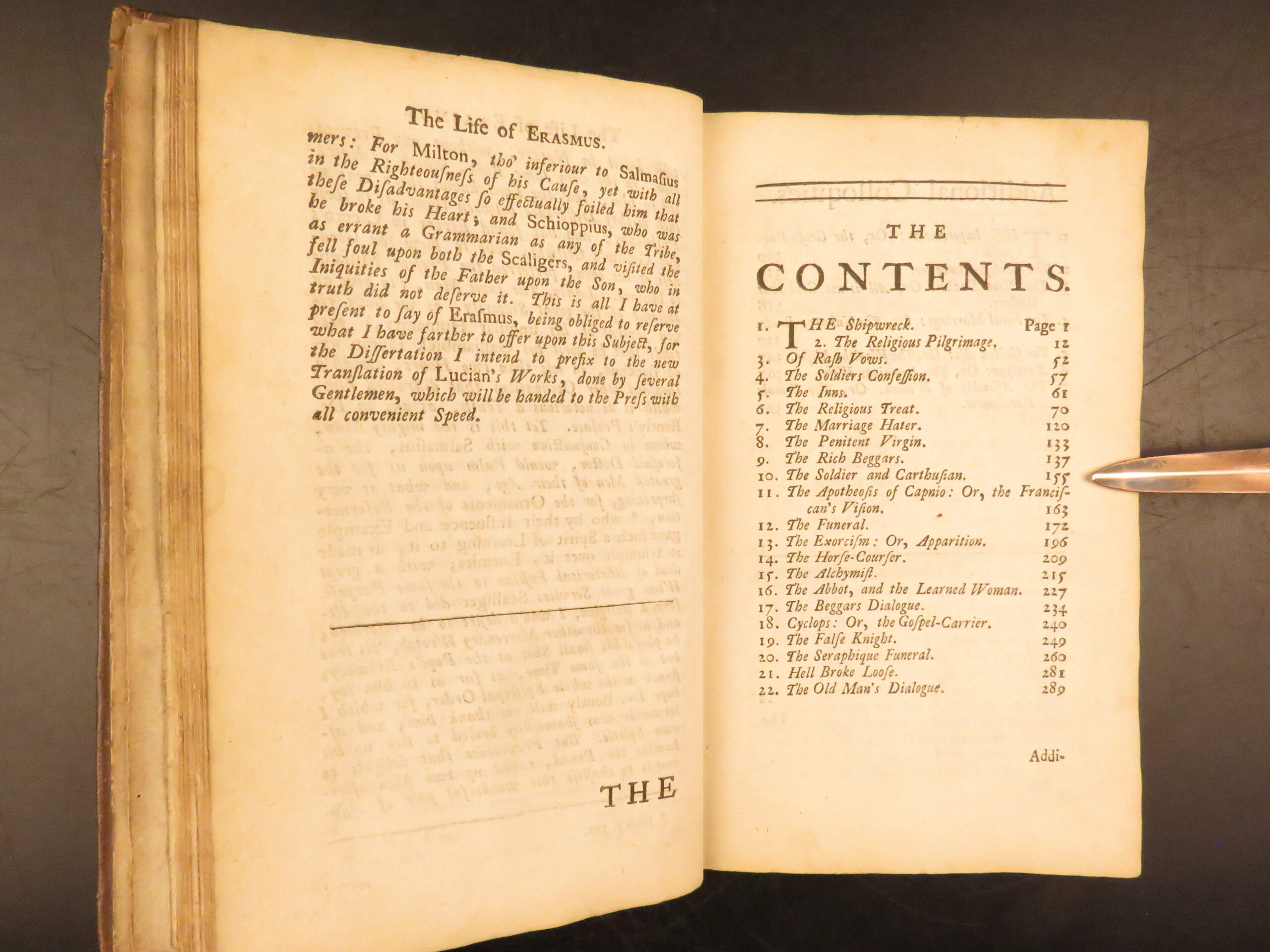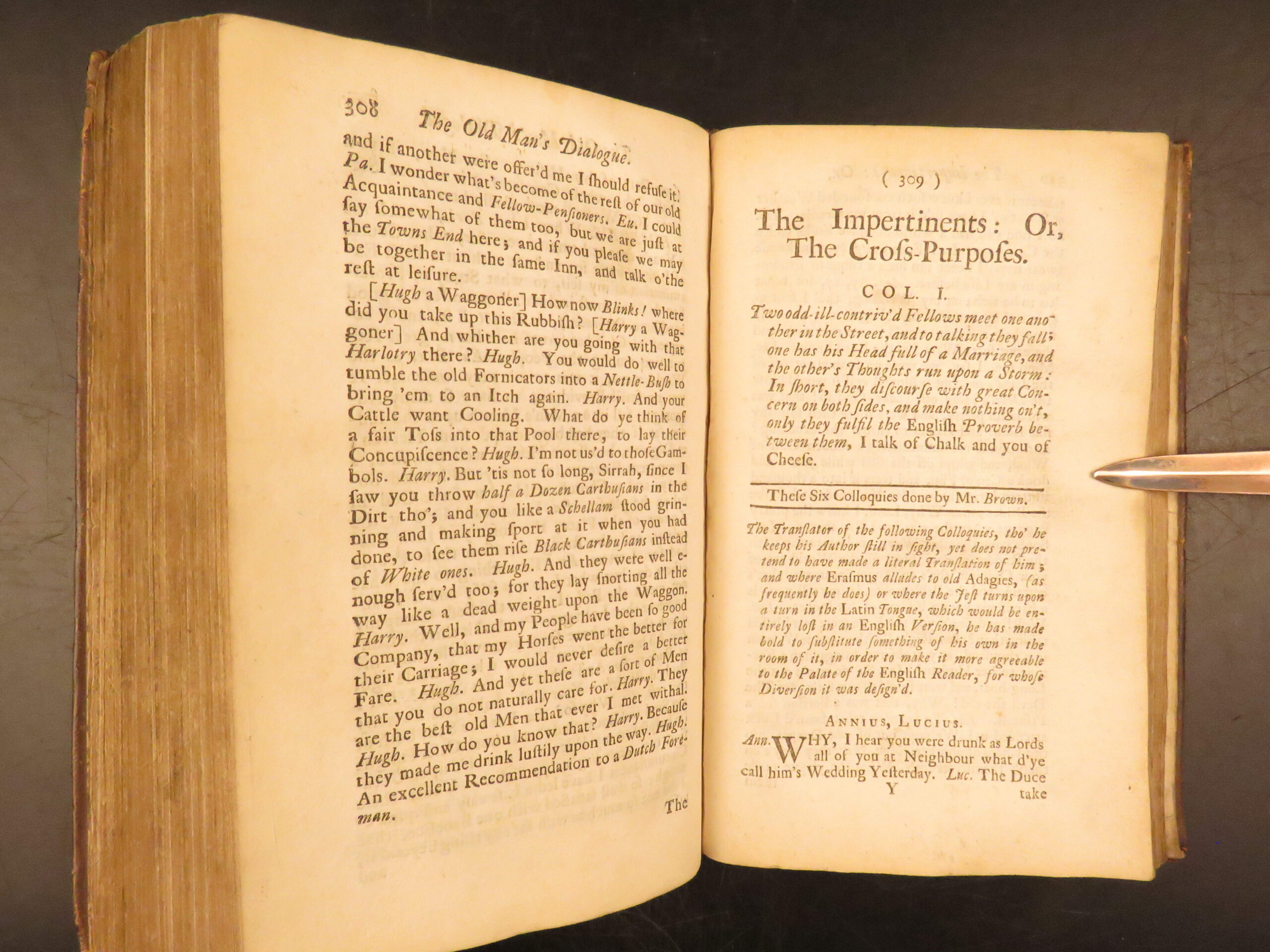 1725 – colloquies by erasmus of rotterdam | famous l’estrange english translation | 1725 english edition of erasmus’s colloquies, translated by l’estrange and featuring additions by thomas brown, bound in leather with engraved frontispiece.