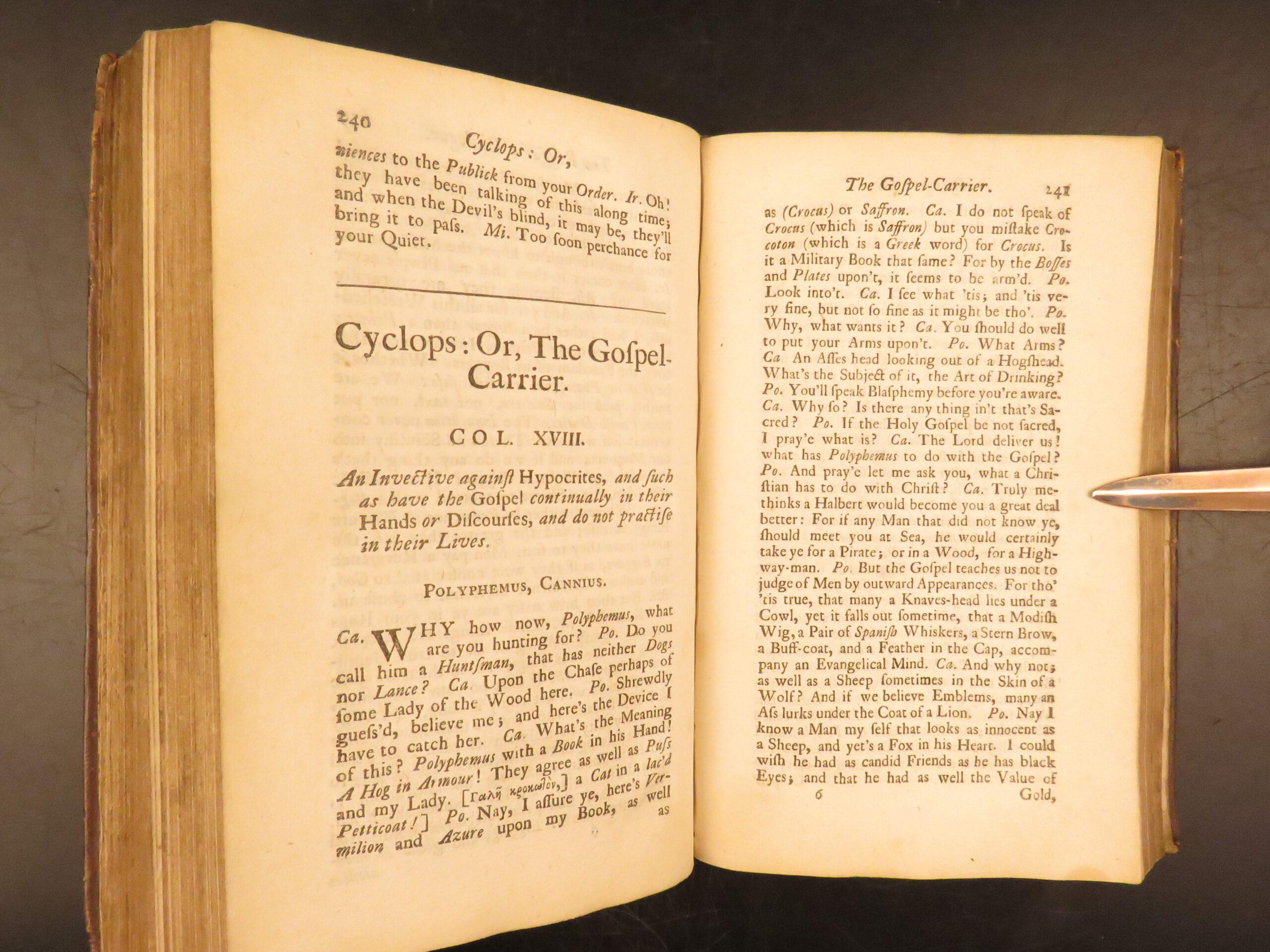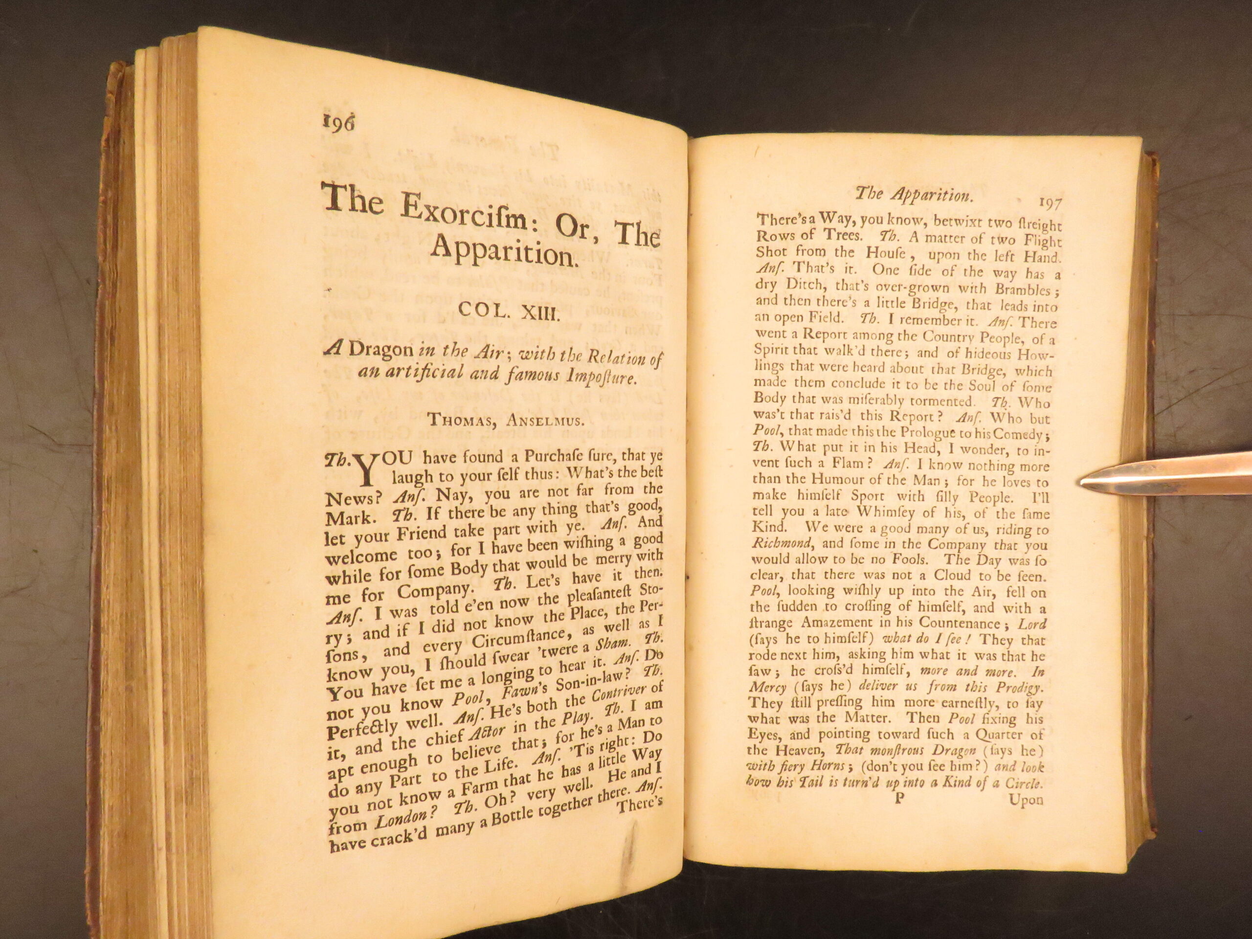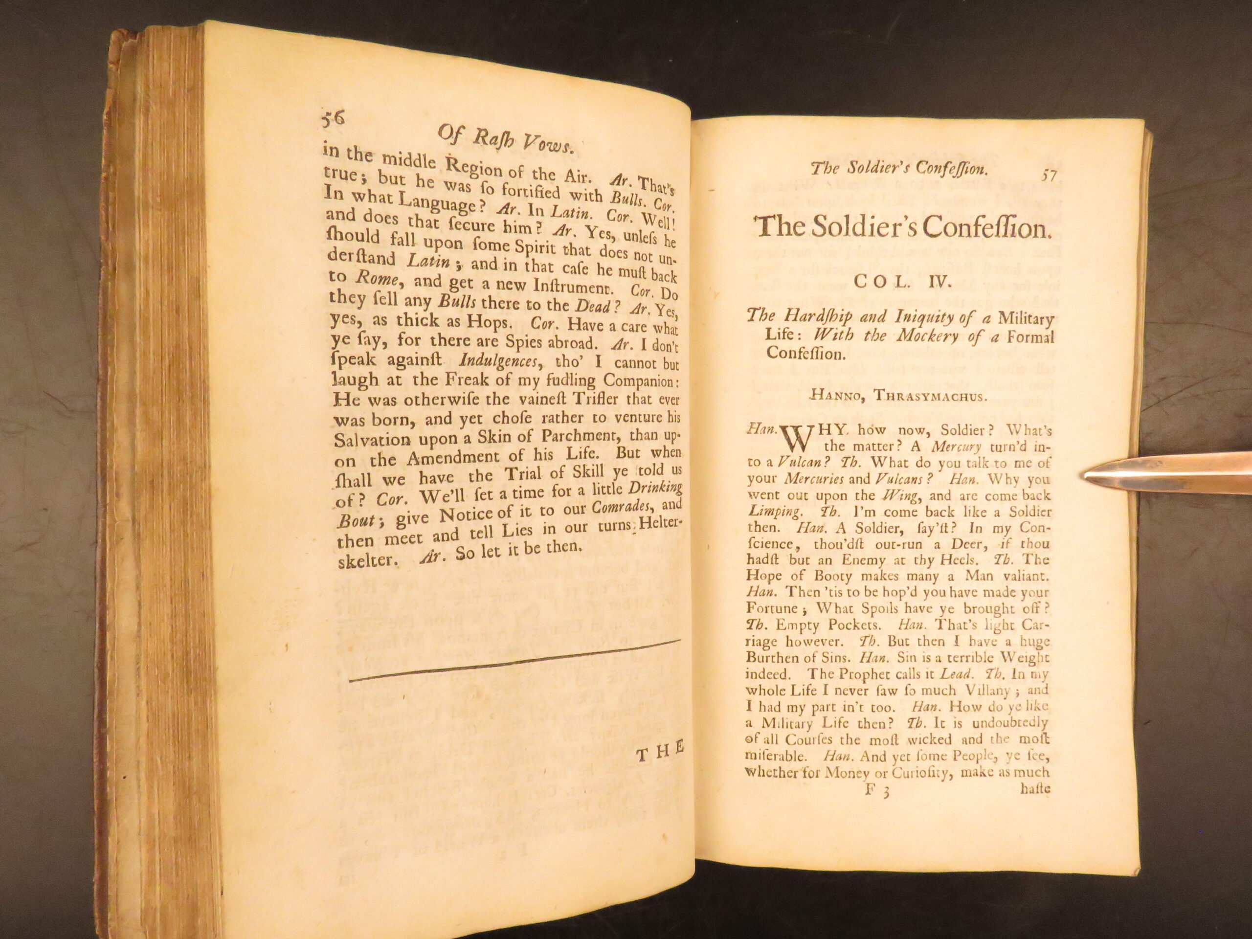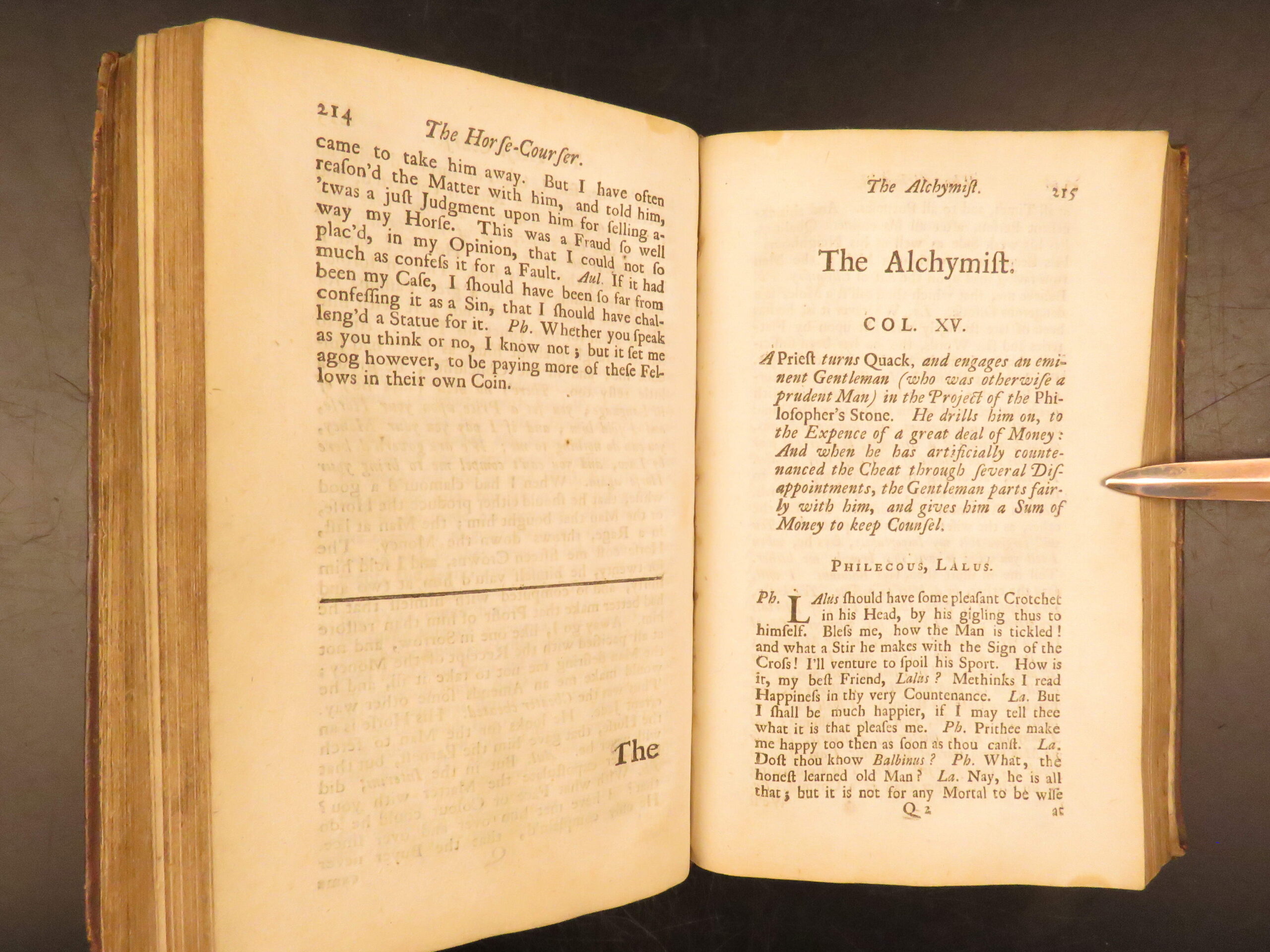1725 – colloquies by erasmus of rotterdam | famous l’estrange english translation | 1725 english edition of erasmus’s colloquies, translated by l’estrange and featuring additions by thomas brown, bound in leather with engraved frontispiece.