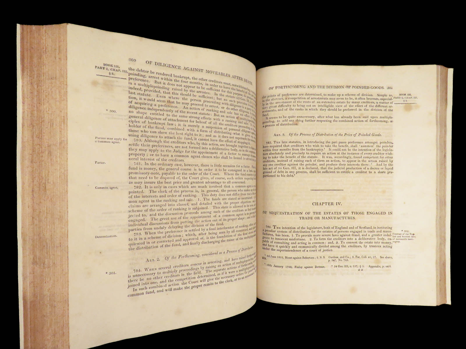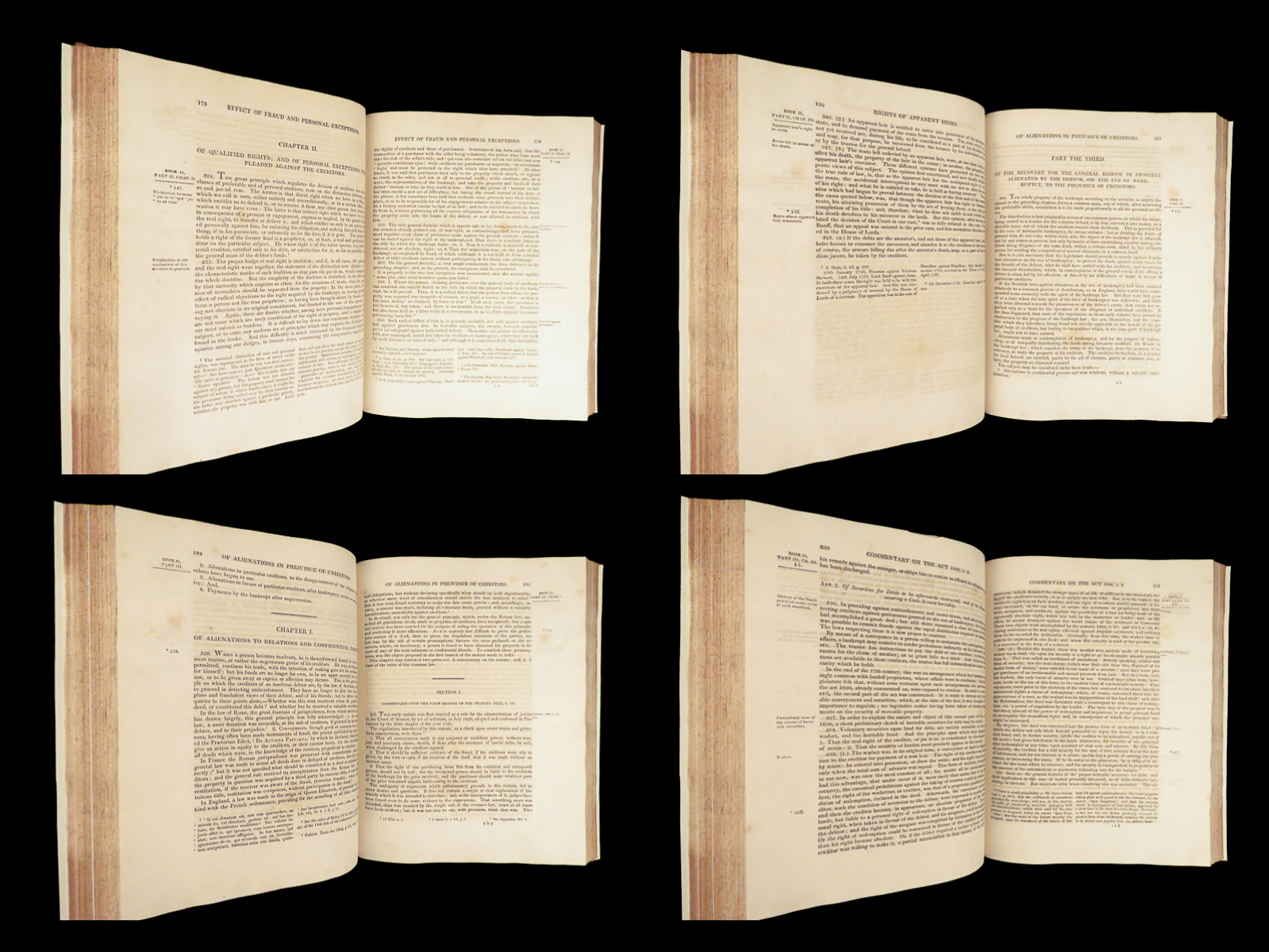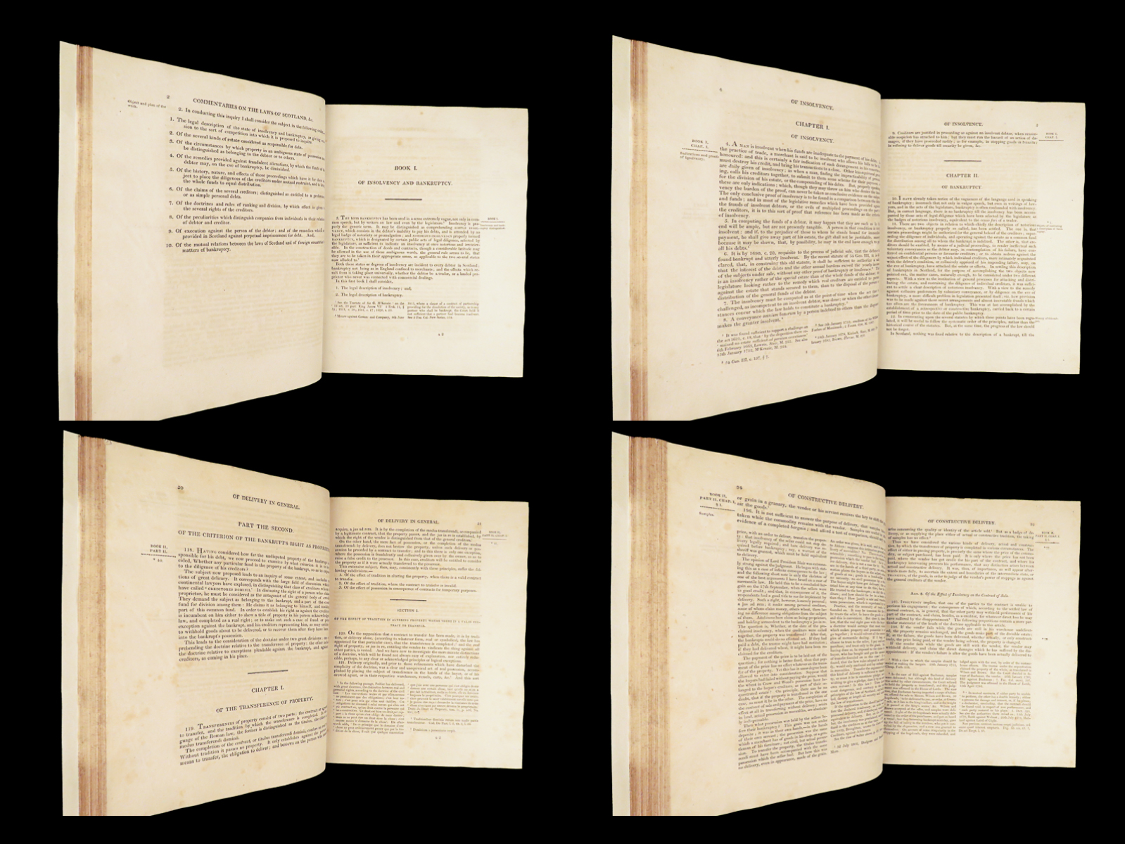 Commentaries on the Laws of Scotland : and on the Principles of Mercantile Jurisprudence by George Joseph Bell was printed in Edinburgh between 1816 and 1819 by Alex. Lawrie & Co. for Archibald Constable. Bell, a leading Scottish jurist and professor, published this two-volume work as a systematic examination of commercial and mercantile law. The text covers bankruptcy, creditors’ competition, priority rules, acts of insolvency, and the rights of traders. Maritime topics appear extensively, including charter parties, freight, bottomry, and insurance. Numerous references to decisions of the Court of Session appear throughout, grounding Bell’s commentary in active practice and case law.