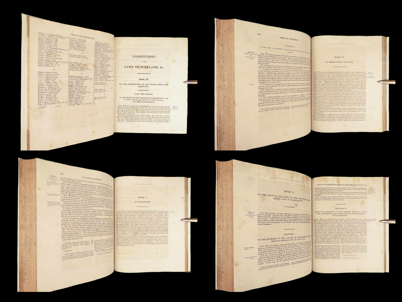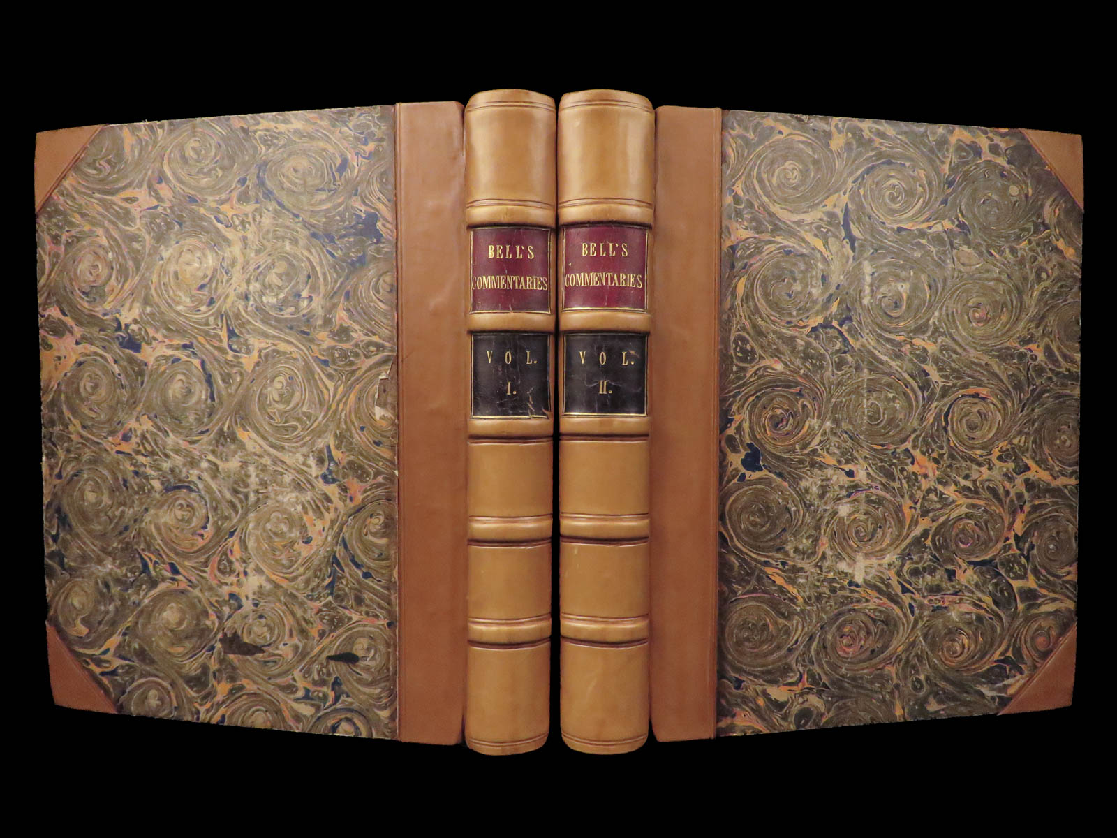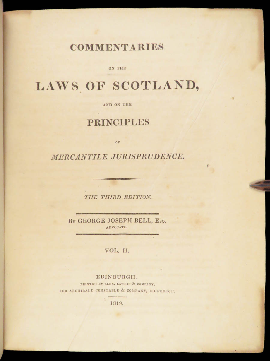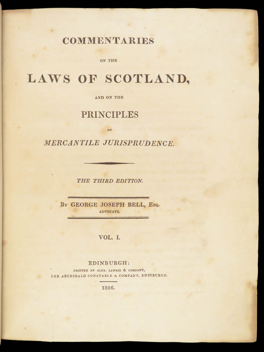 First edition of George Joseph Bell’s Commentaries on the Laws of Scotland and on the Principles of Mercantile Jurisprudence (1816–1819), a two-volume legal treatise on bankruptcy, creditors’ rights, and maritime commerce.