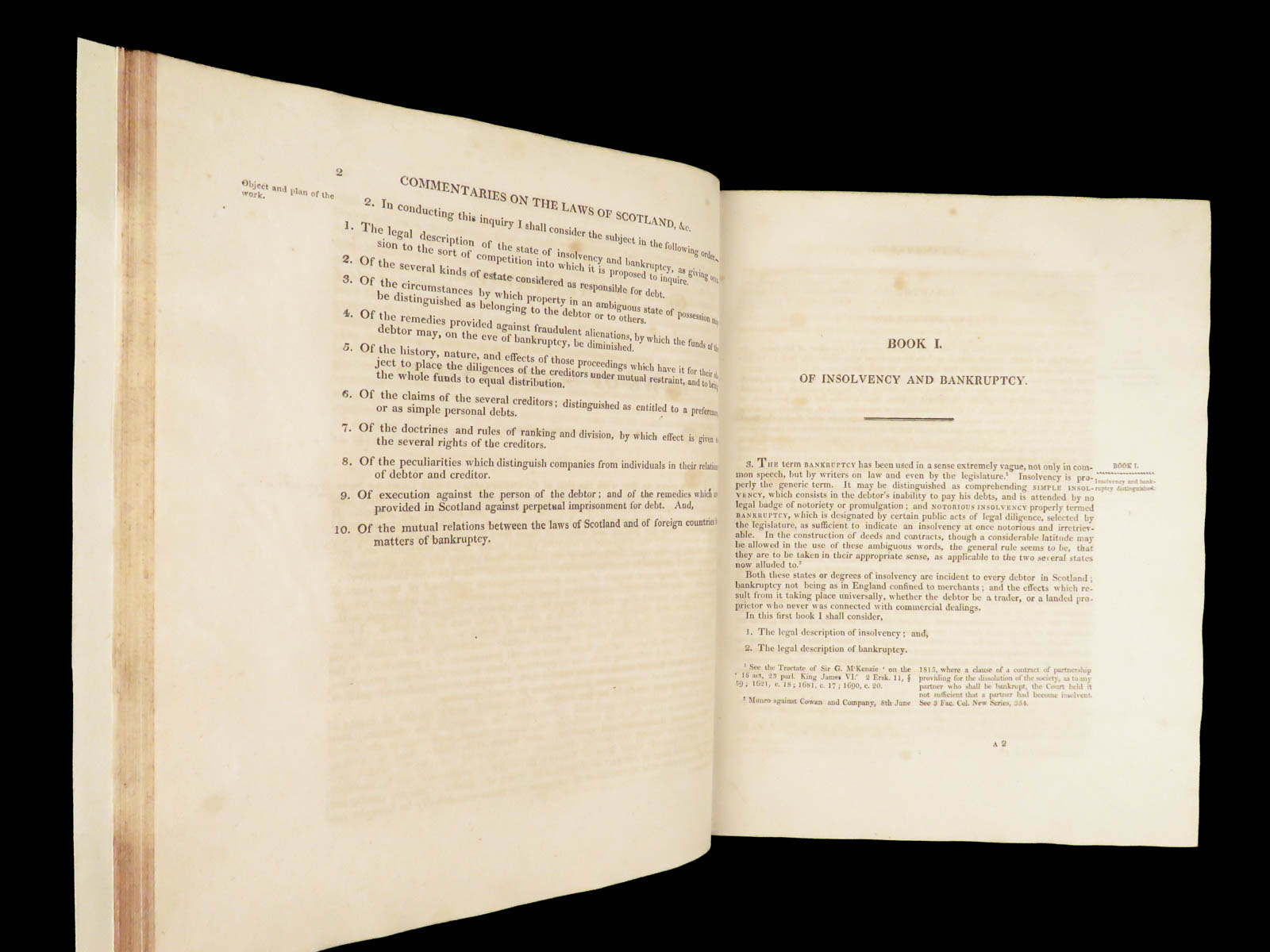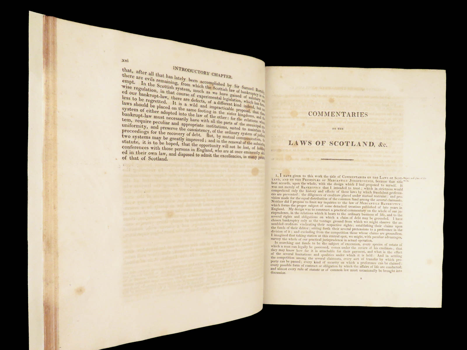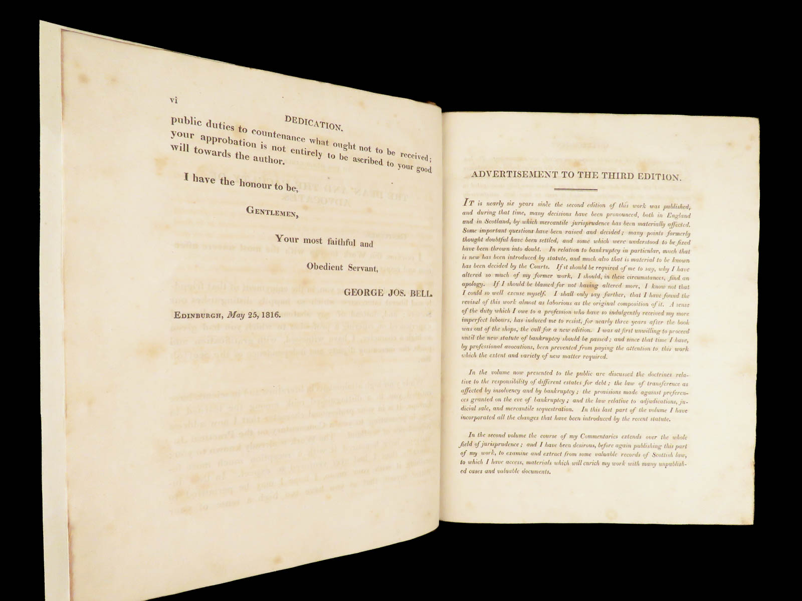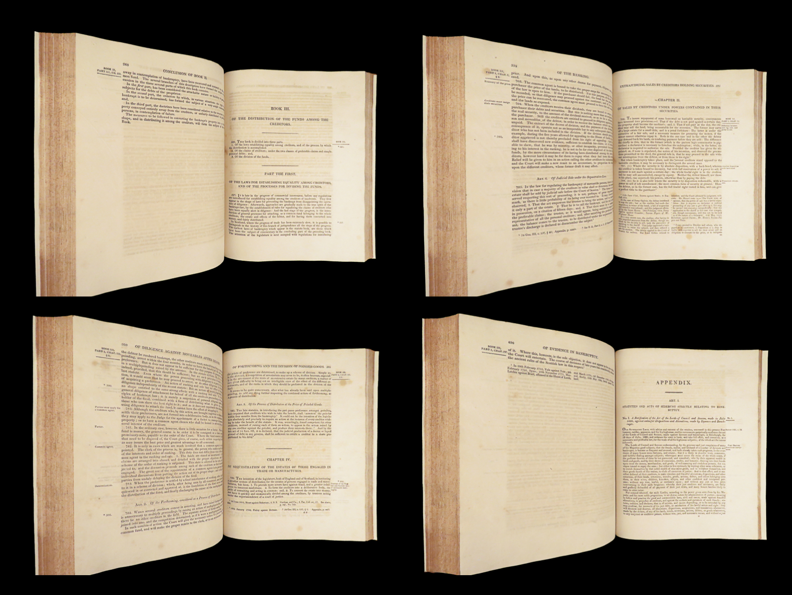 First edition of George Joseph Bell’s Commentaries on the Laws of Scotland and on the Principles of Mercantile Jurisprudence (1816–1819), a two-volume legal treatise on bankruptcy, creditors’ rights, and maritime commerce.