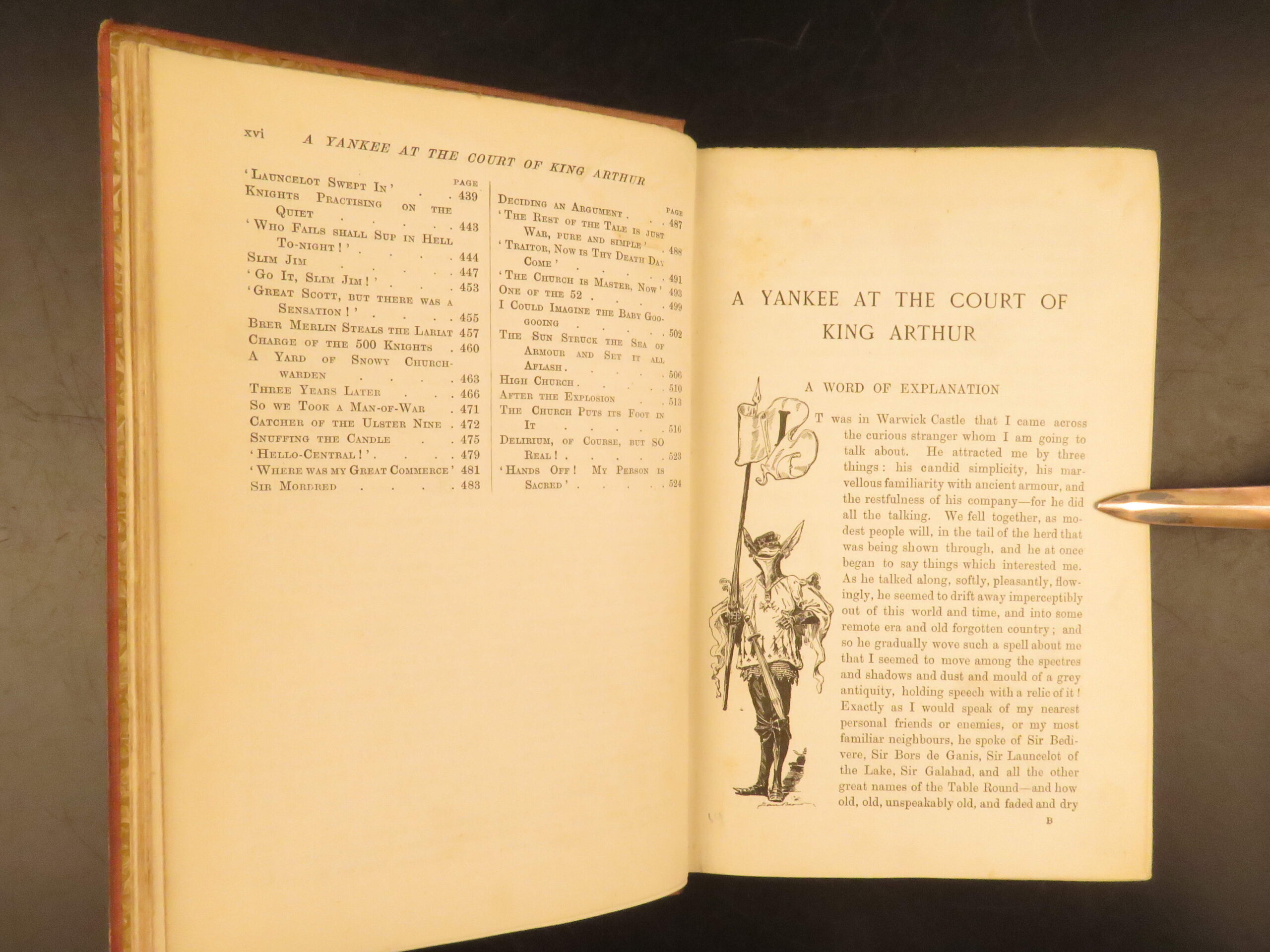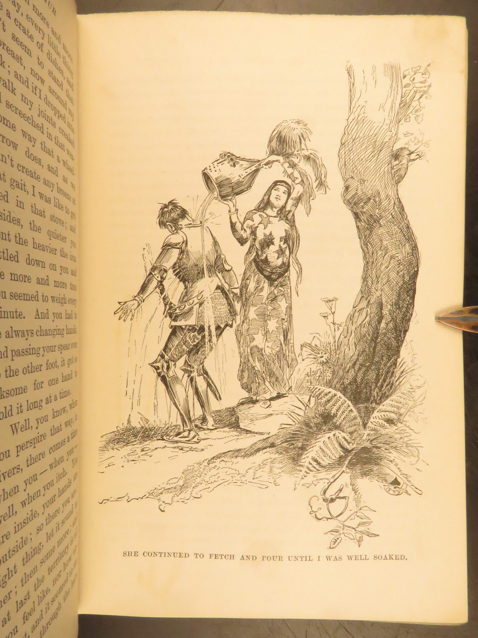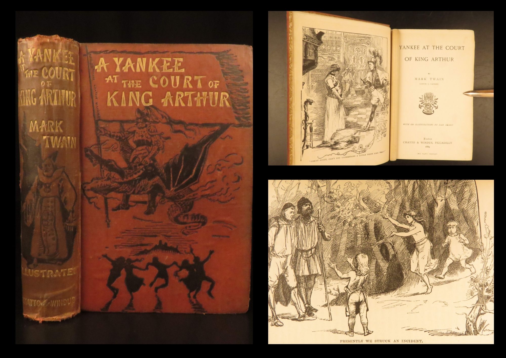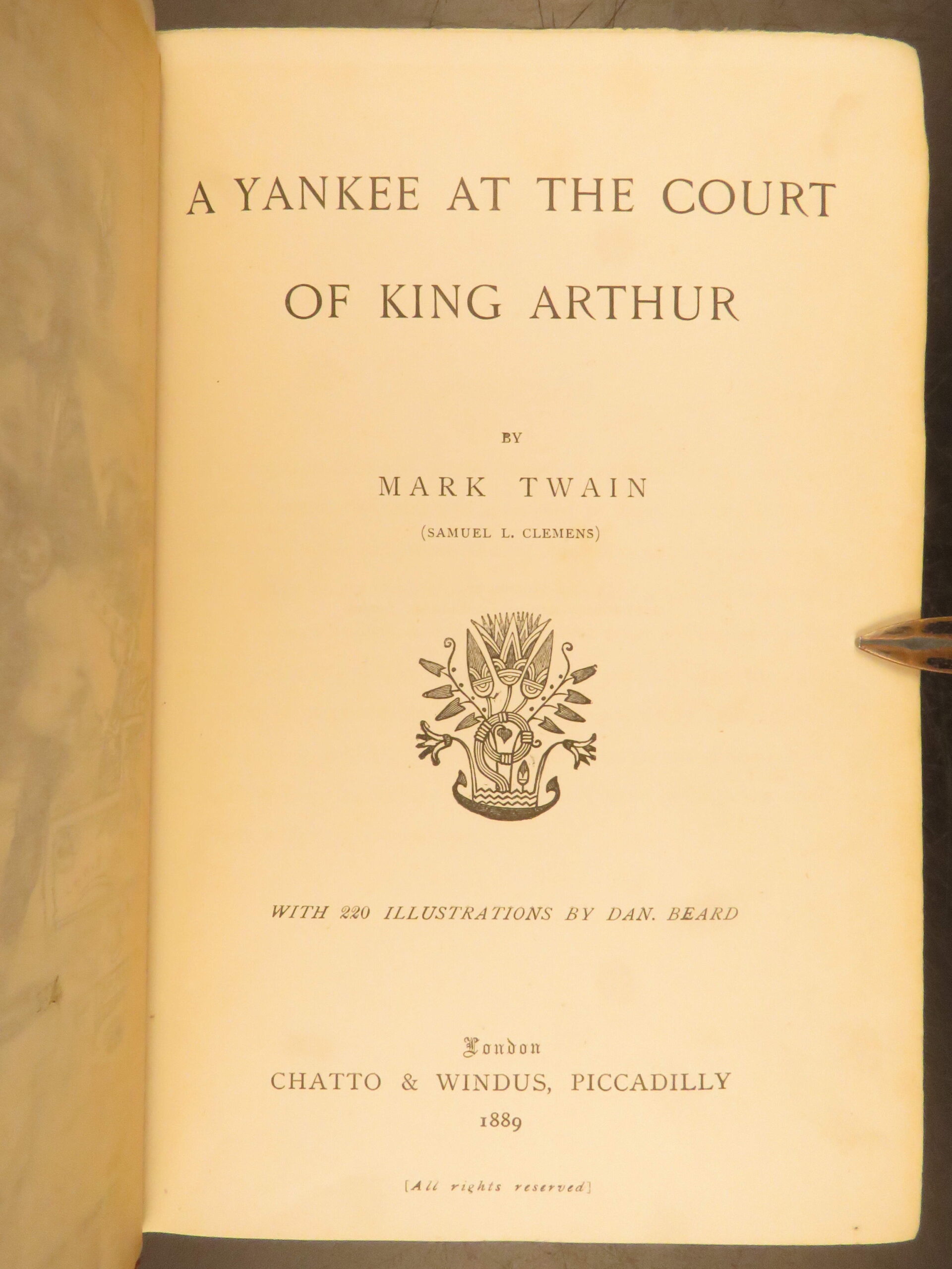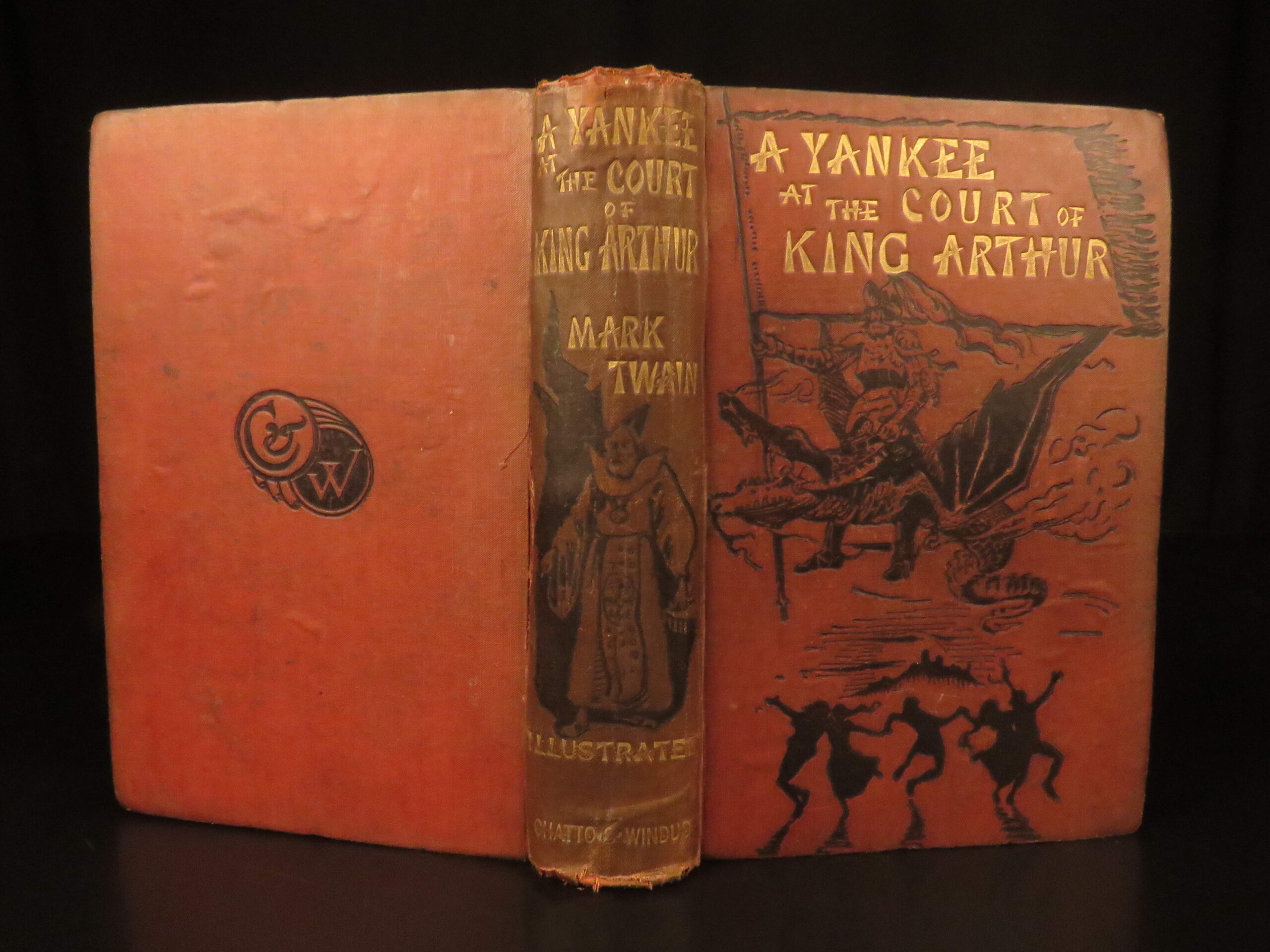 First UK edition of Mark Twain’s time-travel satire A Connecticut Yankee in King Arthur’s Court (1889), illustrated by Dan Beard with 220 drawings and published by Chatto & Windus, London.