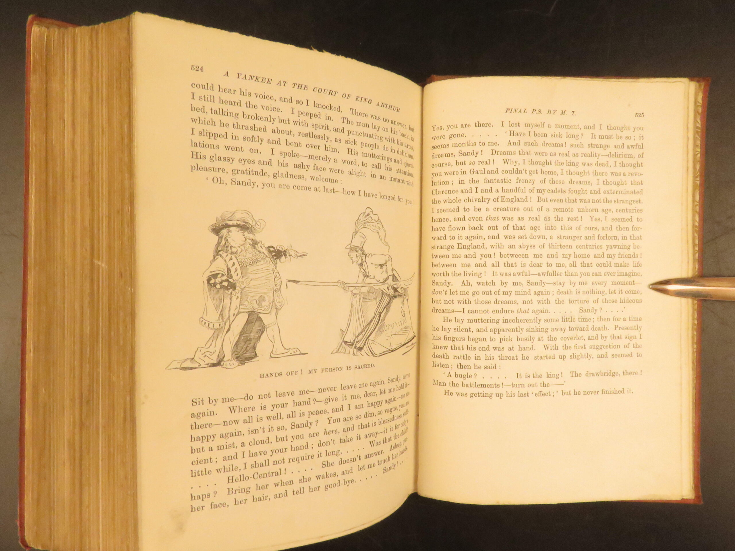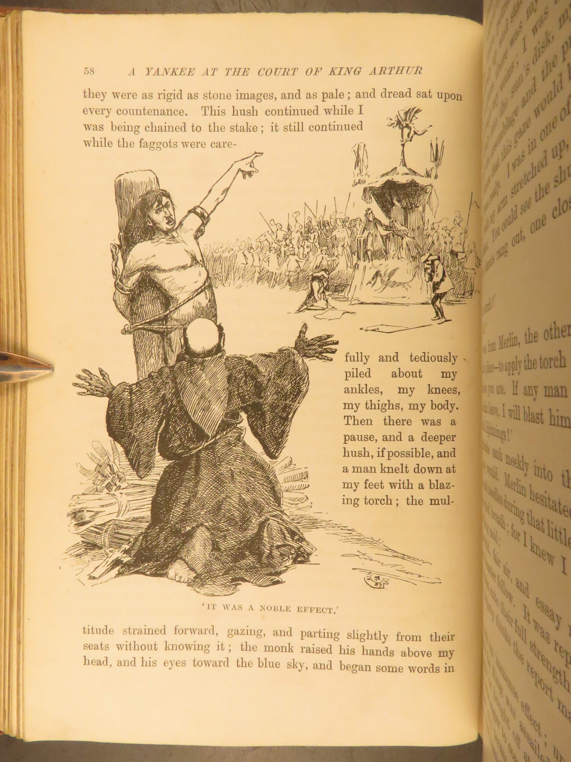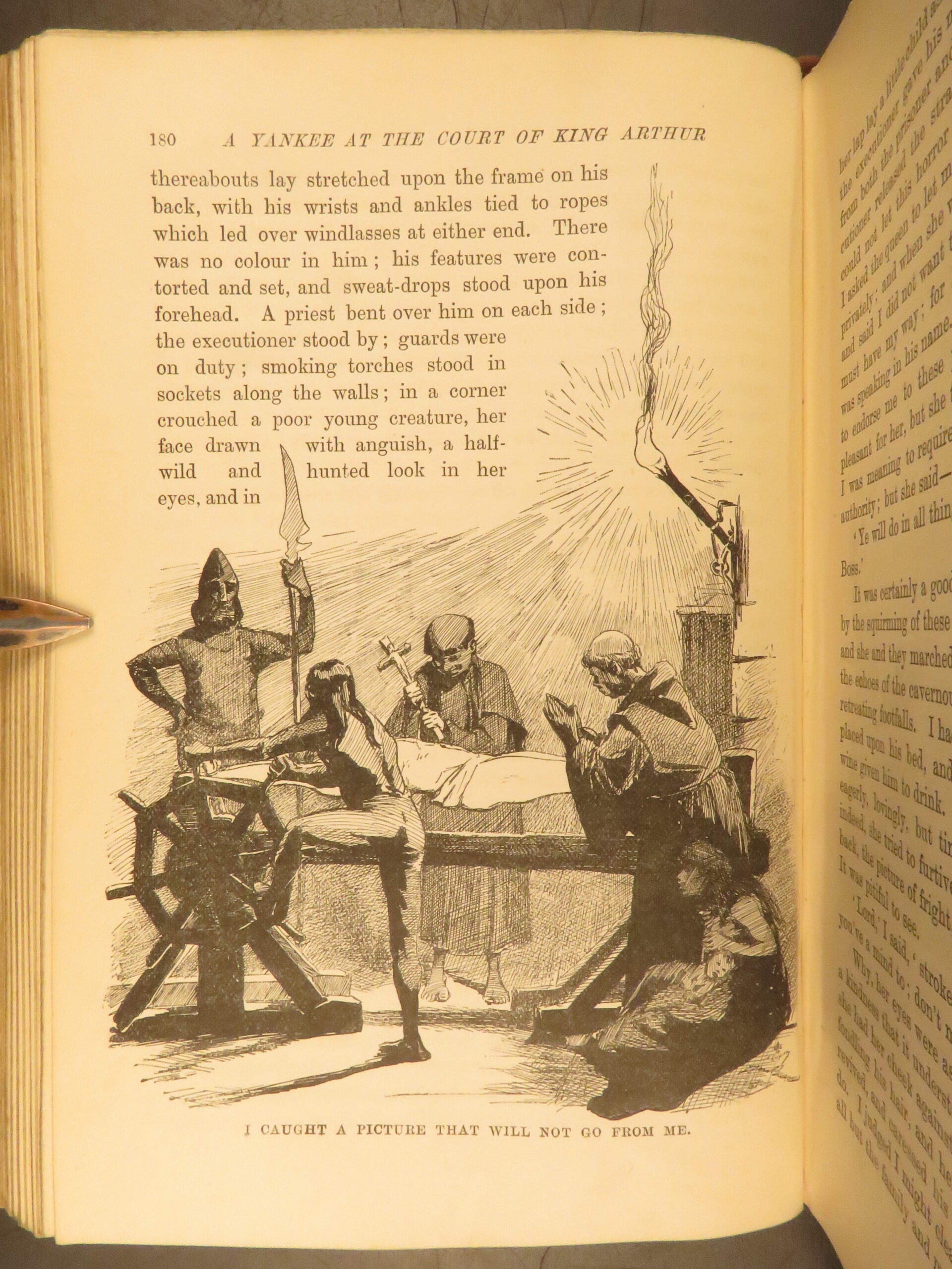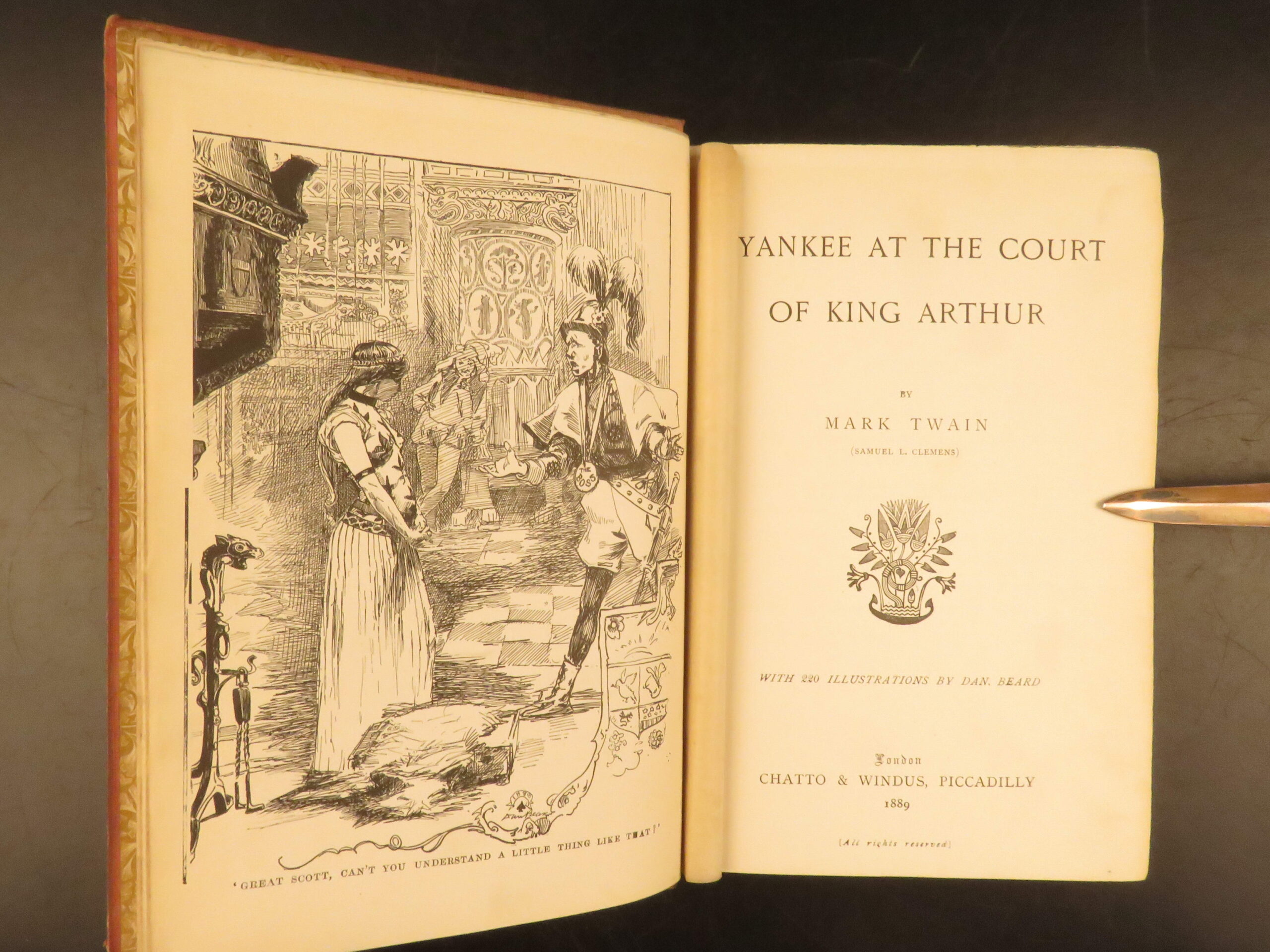 First UK edition of Mark Twain’s time-travel satire A Connecticut Yankee in King Arthur’s Court (1889), illustrated by Dan Beard with 220 drawings and published by Chatto & Windus, London.