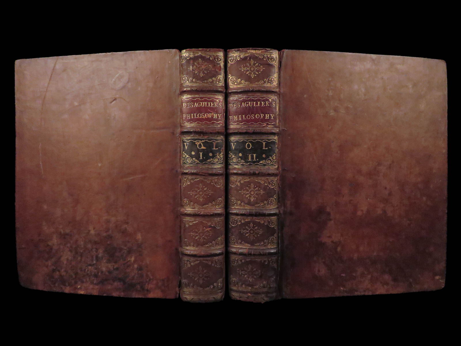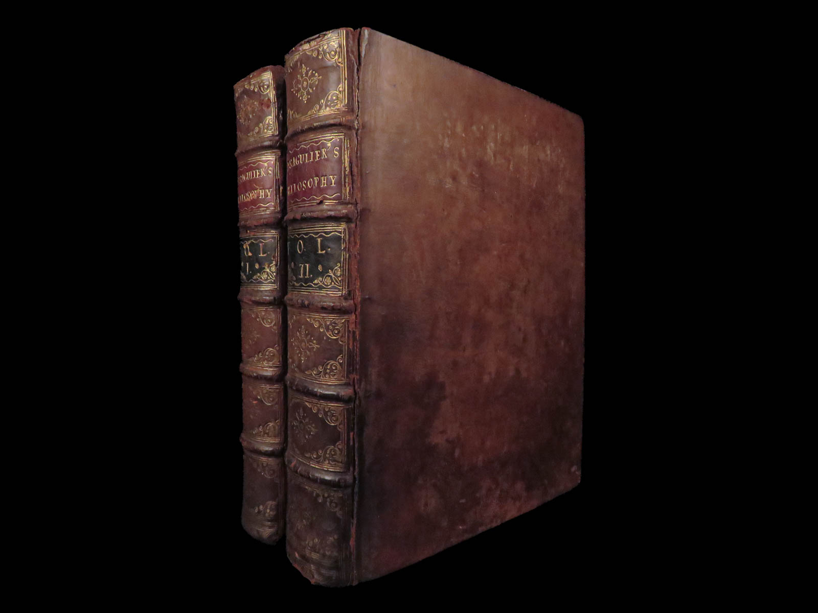 The volumes are bound in leather with secure spines. The boards show rubbing and surface staining, with edges showing wear. Hinges show pulling but remain sound. Text and plates are complete and intact. Very Good for an eighteenth-century scientific set.