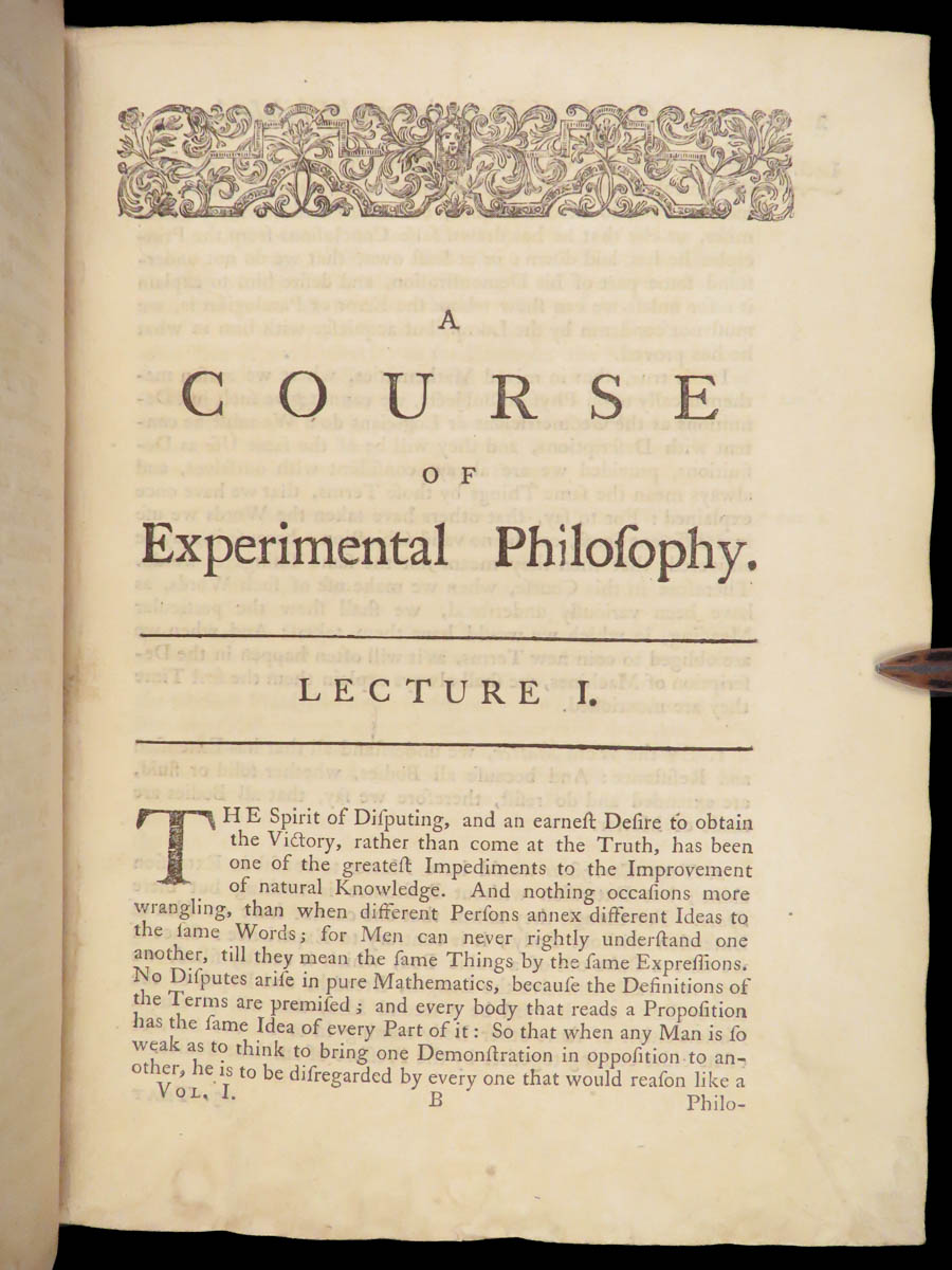 A Course of Experimental Philosophy by John Theophilus Desaguliers is a premier source of Enlightenment philosophy. First published in 1734, this landmark work was designed to teach principles of Newtonian physics through mechanical demonstrations. Desaguliers’ methods of teaching physics is on full display in this 1763 edition which contains 78 engraved plates illustrating mechanics, optics, and hydrostatics experiments.