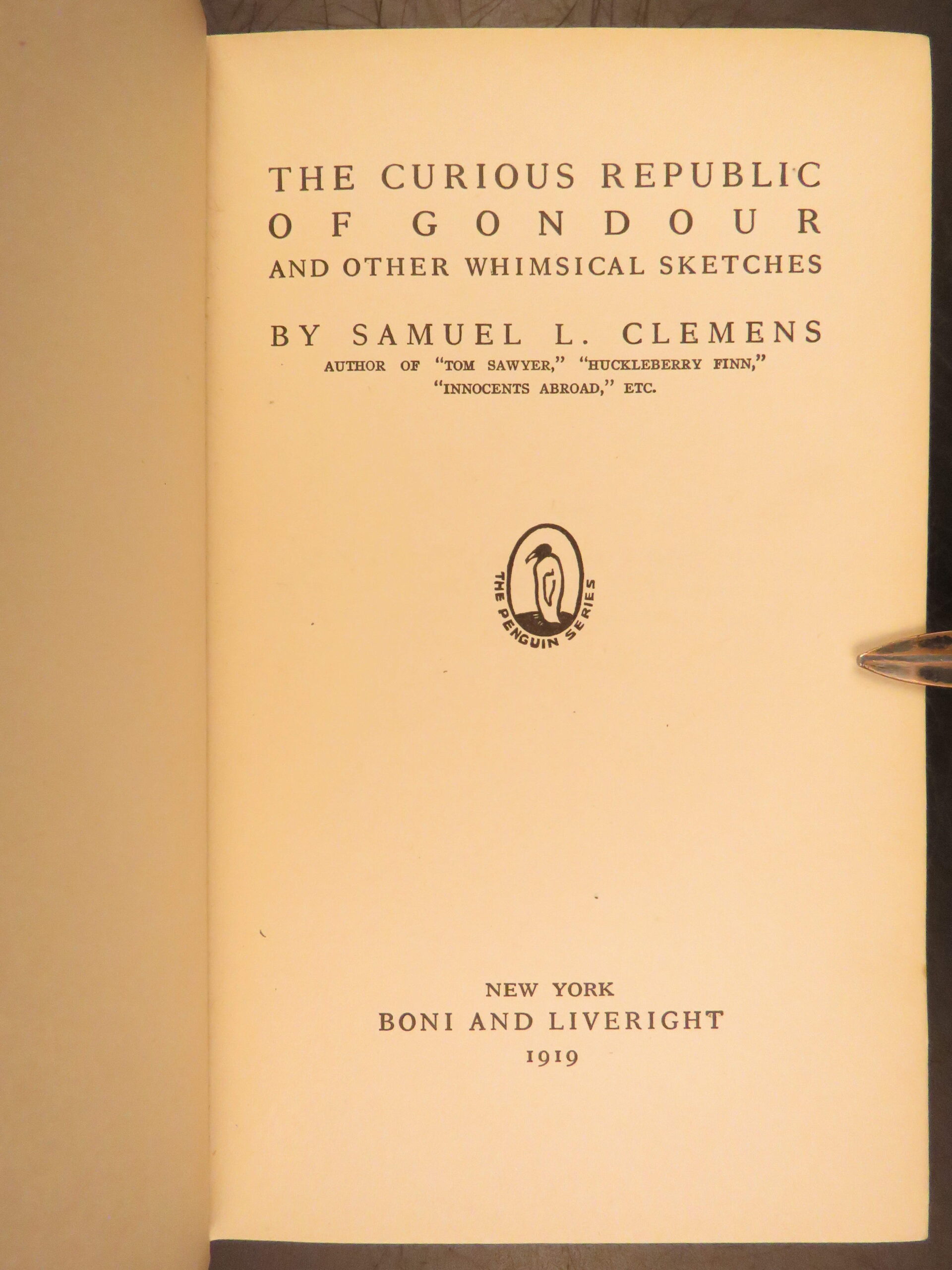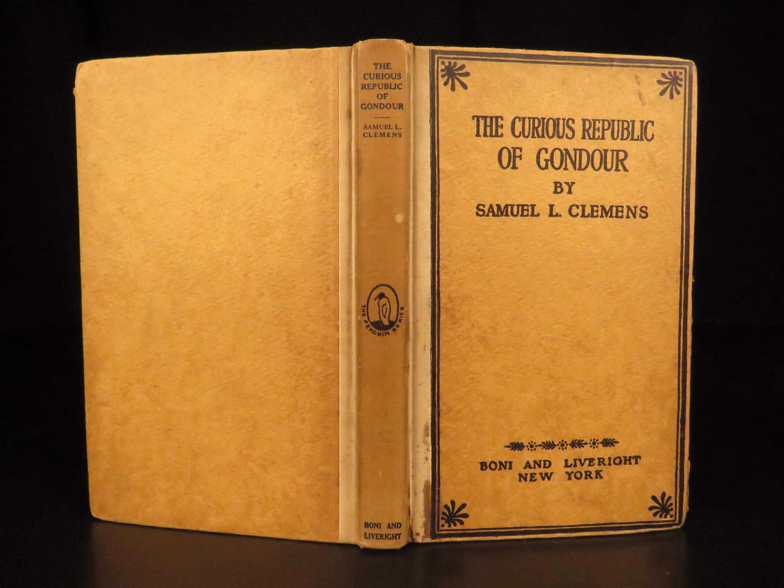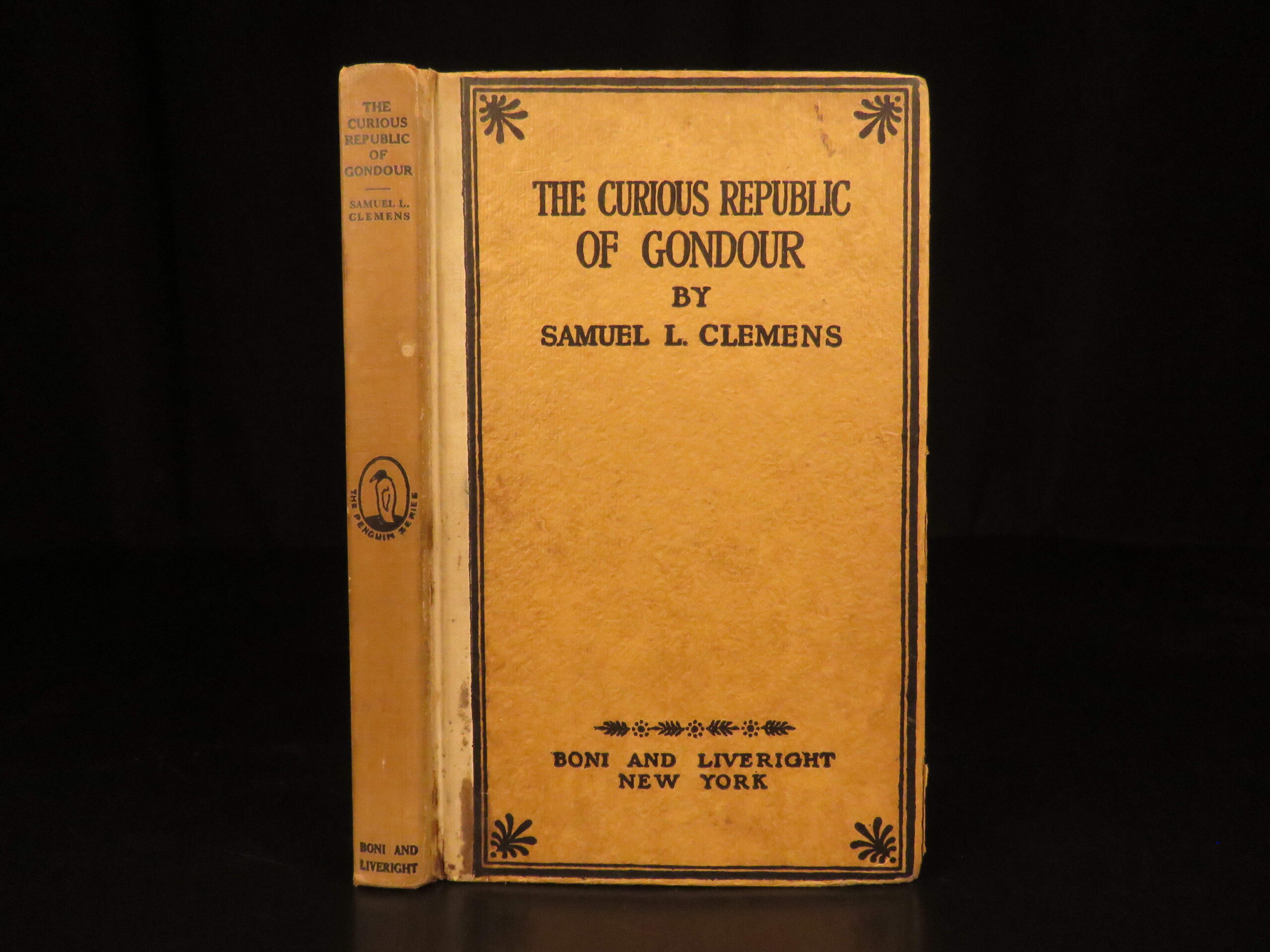 The curious republic of gondour – mark twain – 1919 | first issue, political satire | mark twain’s <em>the curious republic of gondour</em>, first issued in 1919 by boni & liveright, is a short story collection satirizing politics and societal norms, offered here in its first edition, first issue.