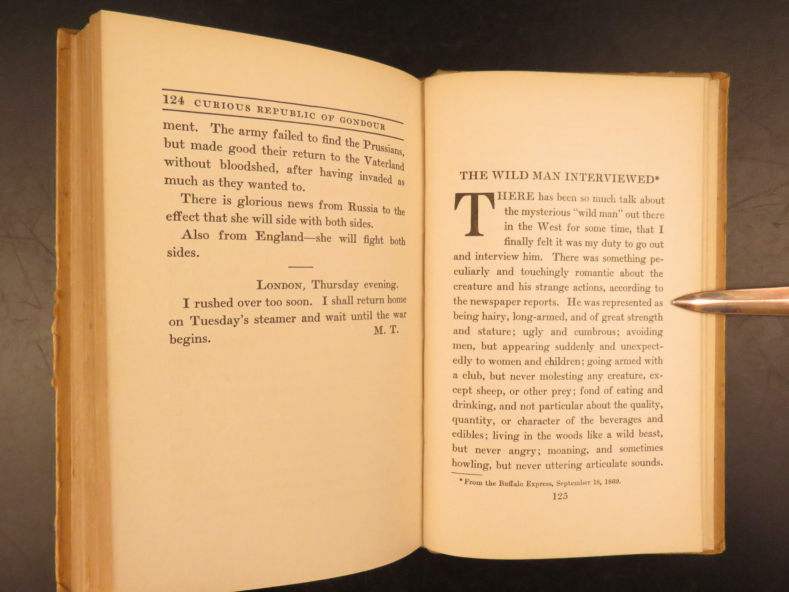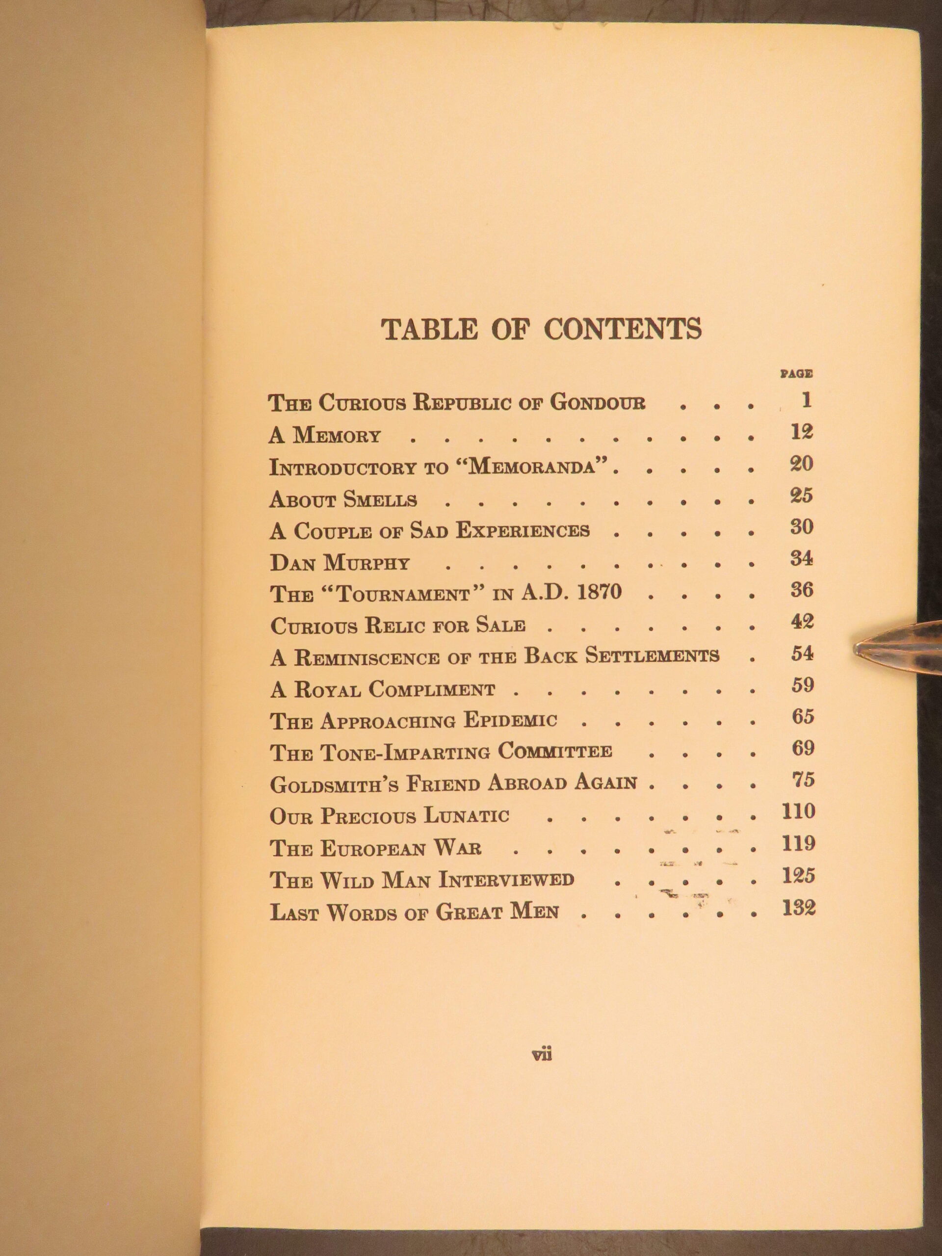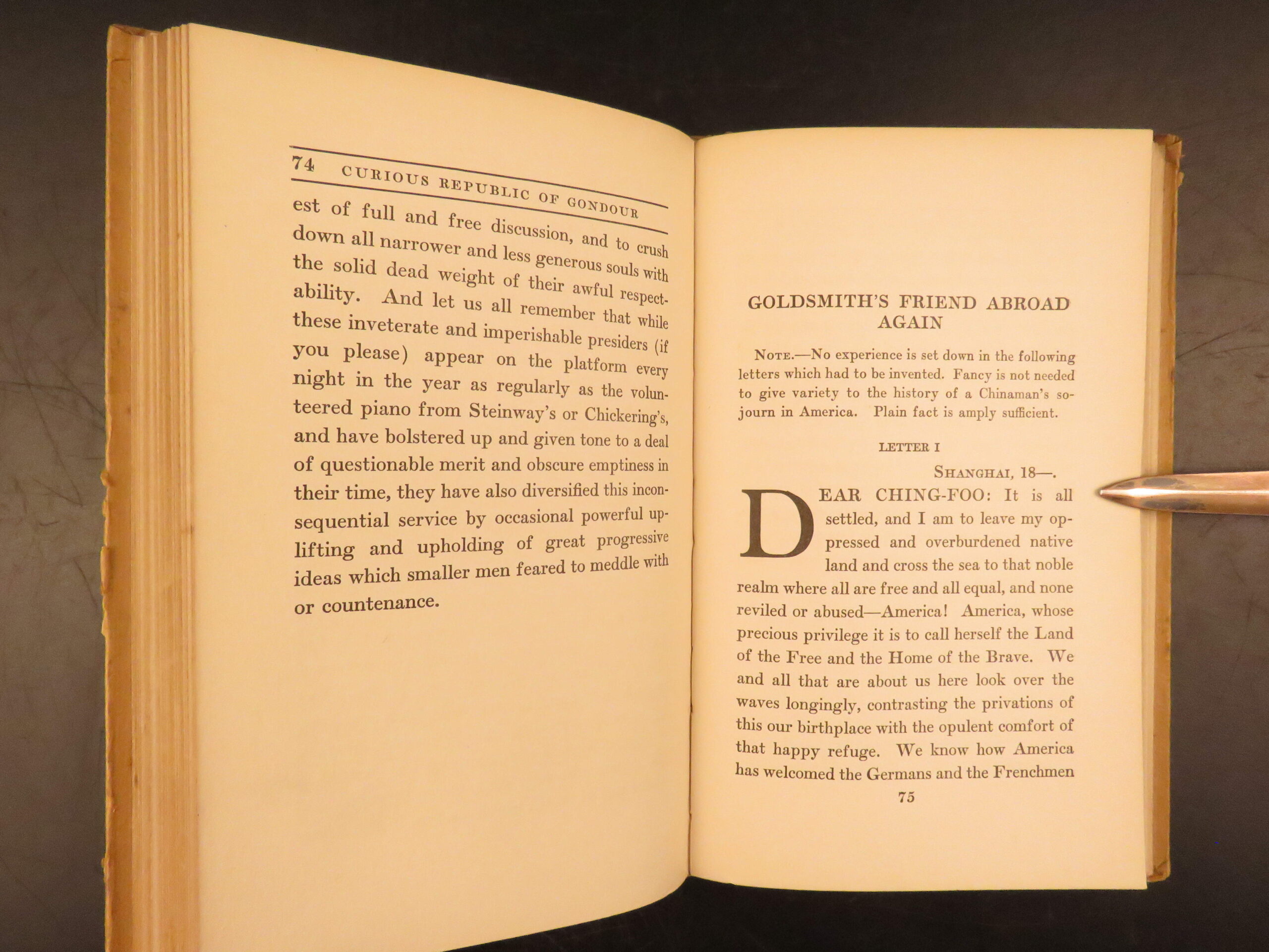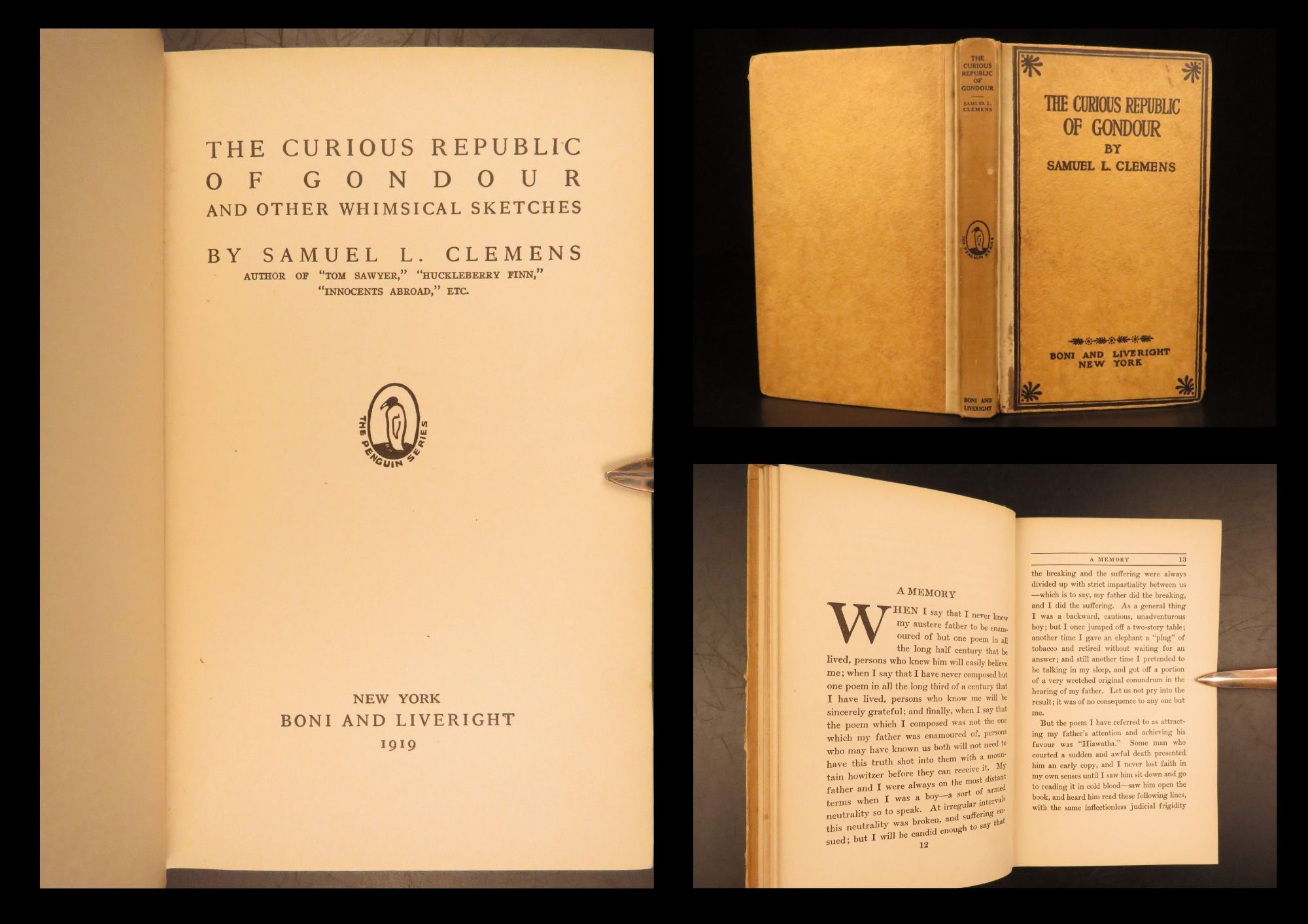 The curious republic of gondour – mark twain – 1919 | first issue, political satire | mark twain’s <em>the curious republic of gondour</em>, first issued in 1919 by boni & liveright, is a short story collection satirizing politics and societal norms, offered here in its first edition, first issue.