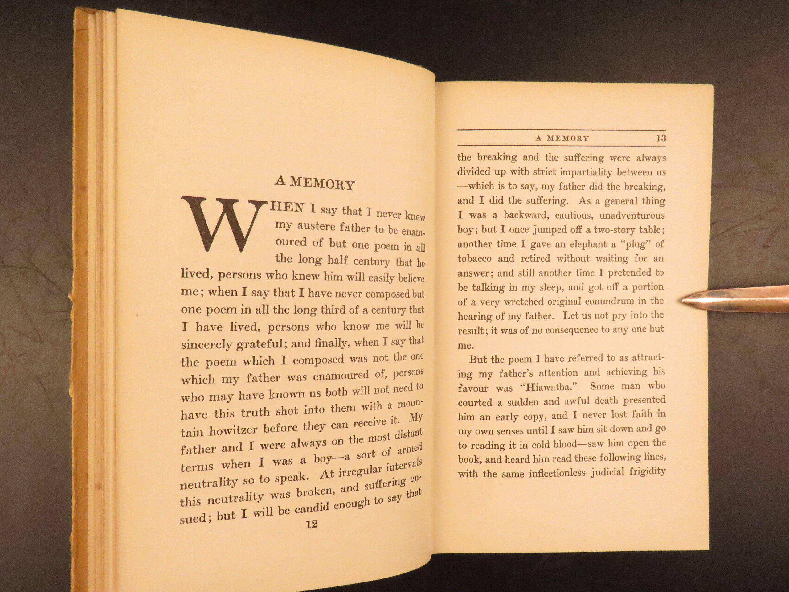 The Curious Republic of Gondour by Mark Twain is a collection of short stories and sketches that was collected and published posthumously in 1919. This first edition, first printing was issued by Boni & Liveright and contains some of Twain’s more eccentric and whimsical works. In these sketches, Twain explores the absurdities of politics and social hierarchy with his signature, sarcastic wit. The title piece satirizes the electoral process, proposing a system where suffrage is universal, but individuals can earn additional votes based on their wealth and education. This edition occupies a small yet intriguing place within the broader Twain bibliography.