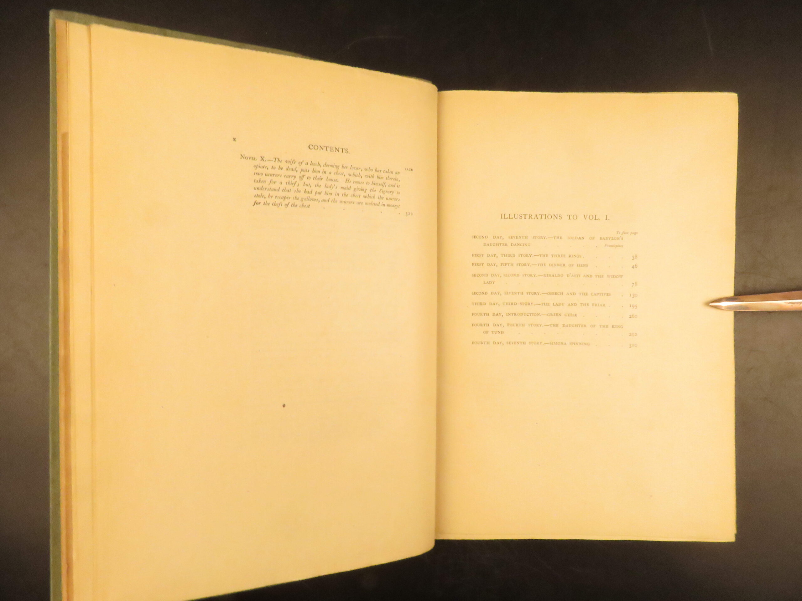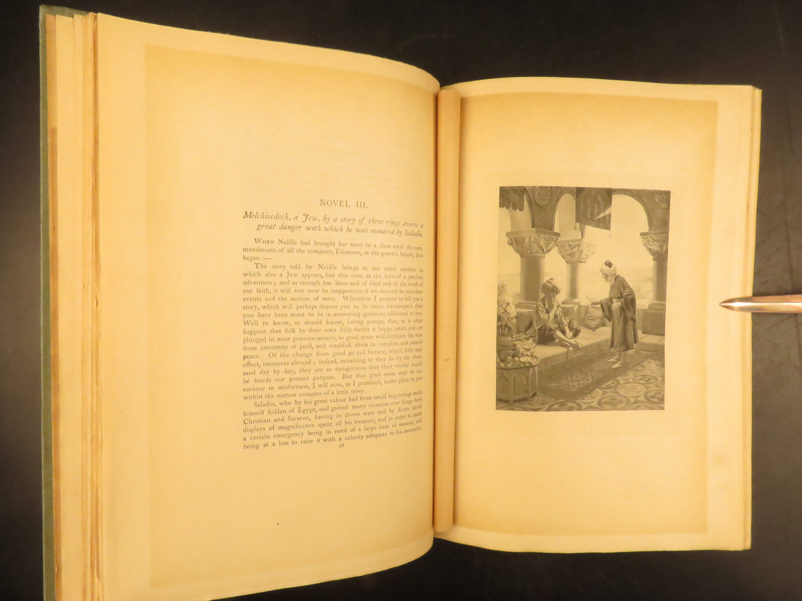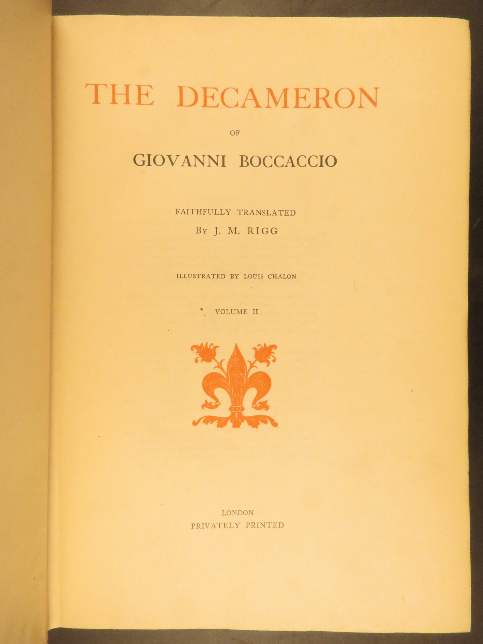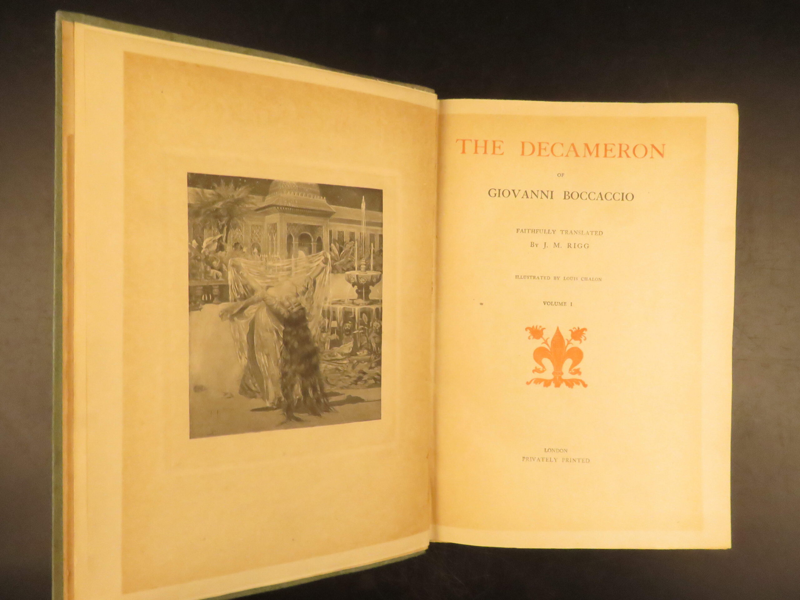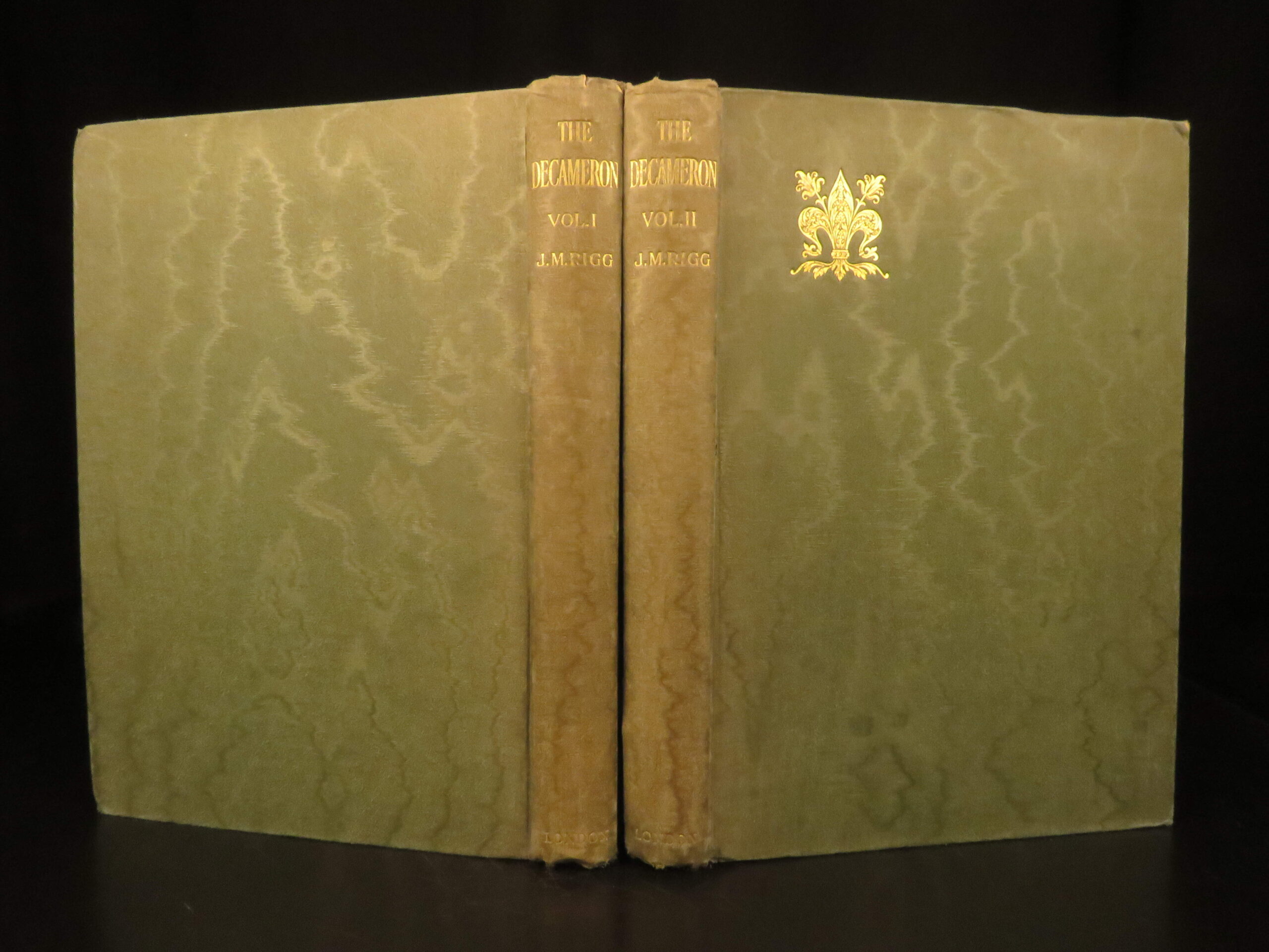 Two-volume 1921 deluxe edition of Boccaccio’s The Decameron, translated by J.M. Rigg and privately printed in London in a 1000-copy limitation, featuring full-page engravings.