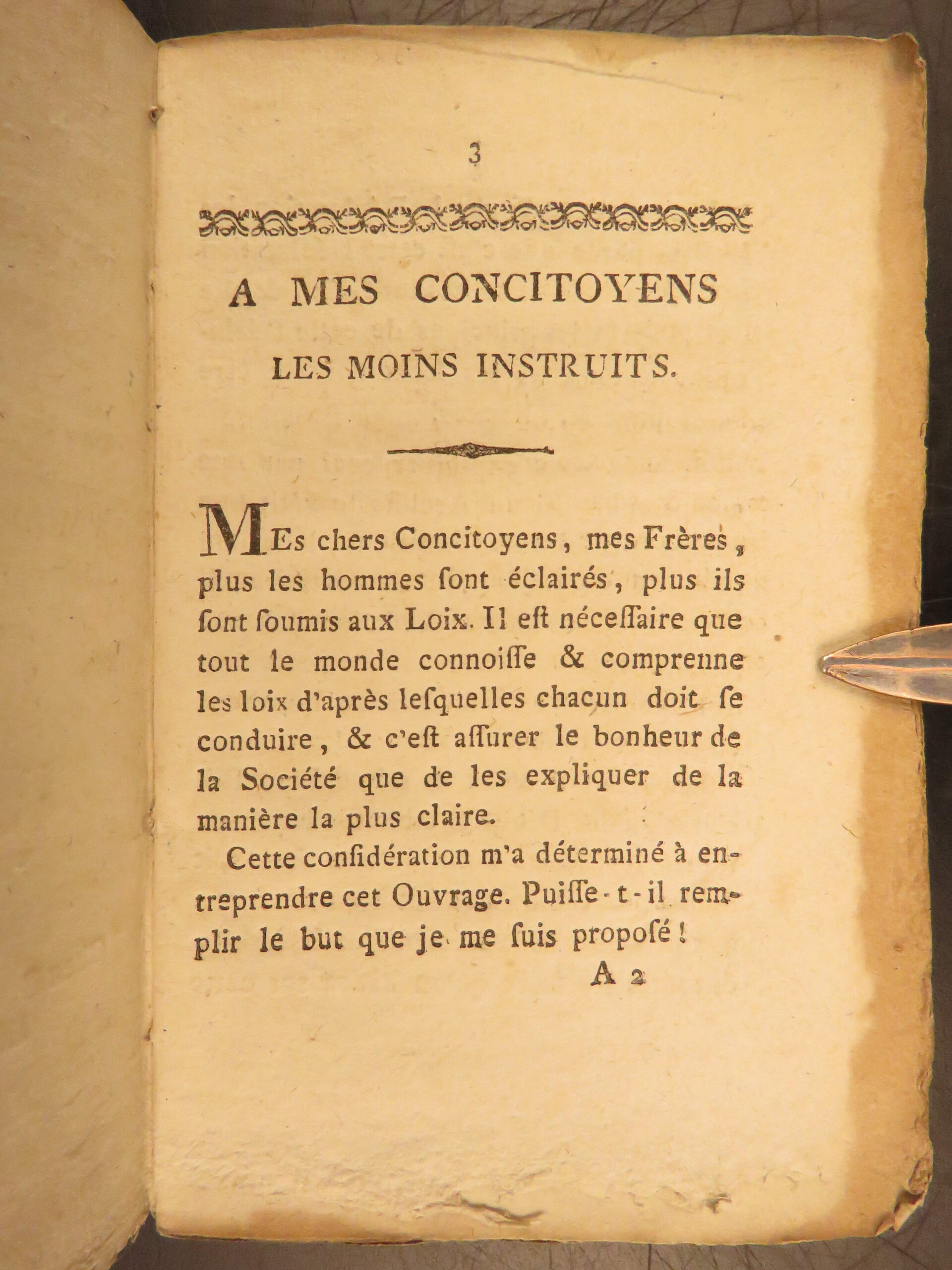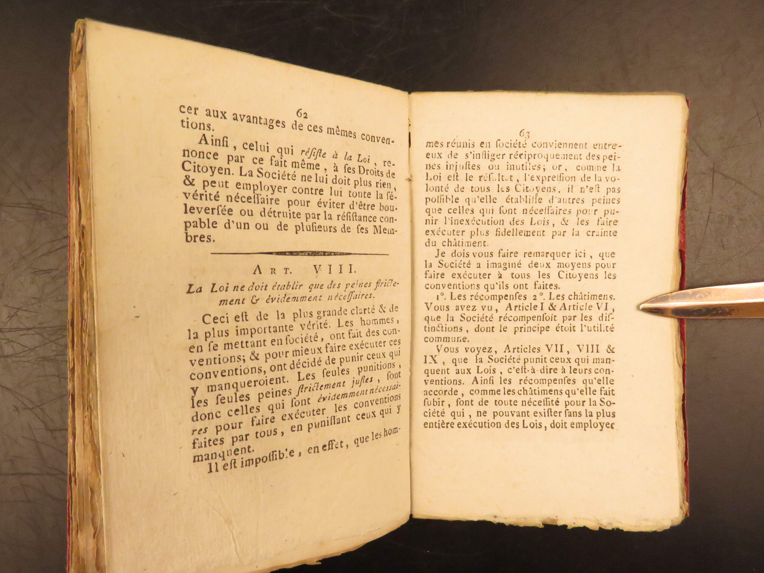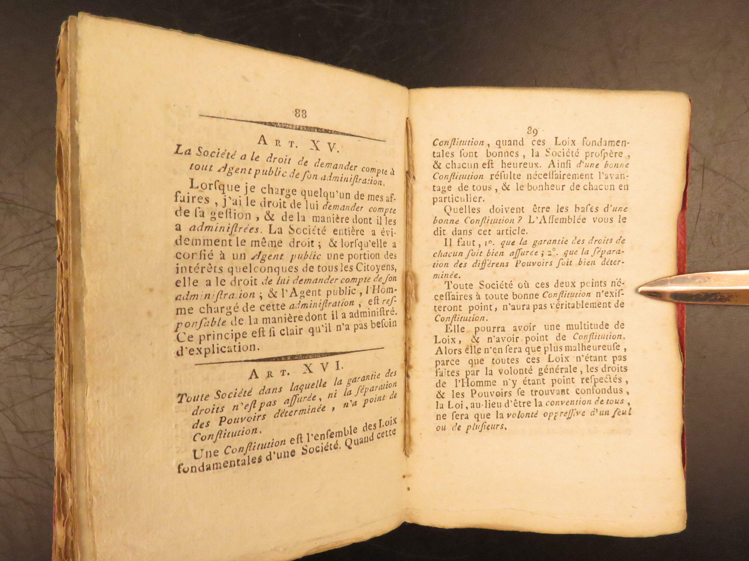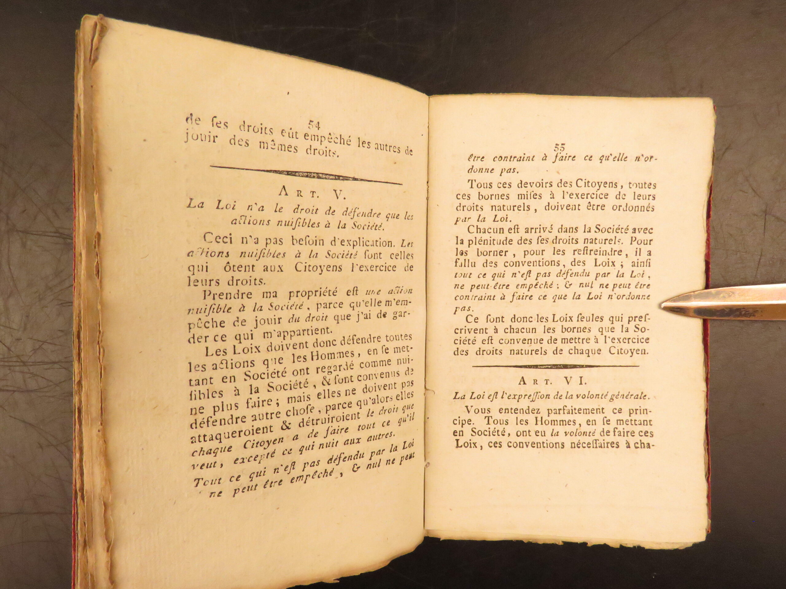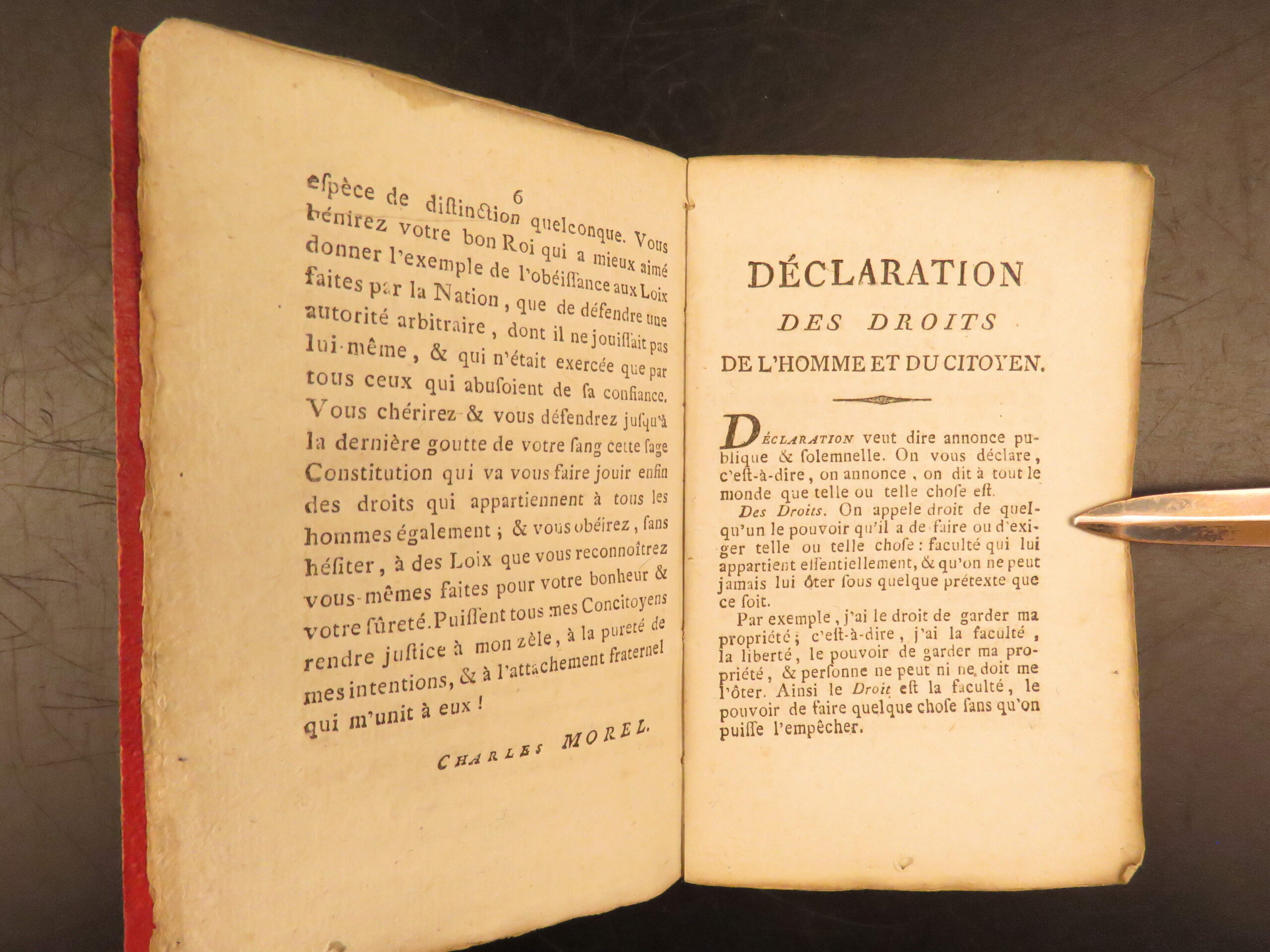 Les Déclaration des Droits de l’Homme et du Citoyen by Charles Morel de Vinde is a first edition, French Revolution-era commentary on the famed Déclaration des Droits de l’Homme et du Citoyen or Declaration of the Rights of Man. De Vinde, a royalist, provided this commentary during the first phases of the French Revolution in which he examined civic ideas against the royalty.