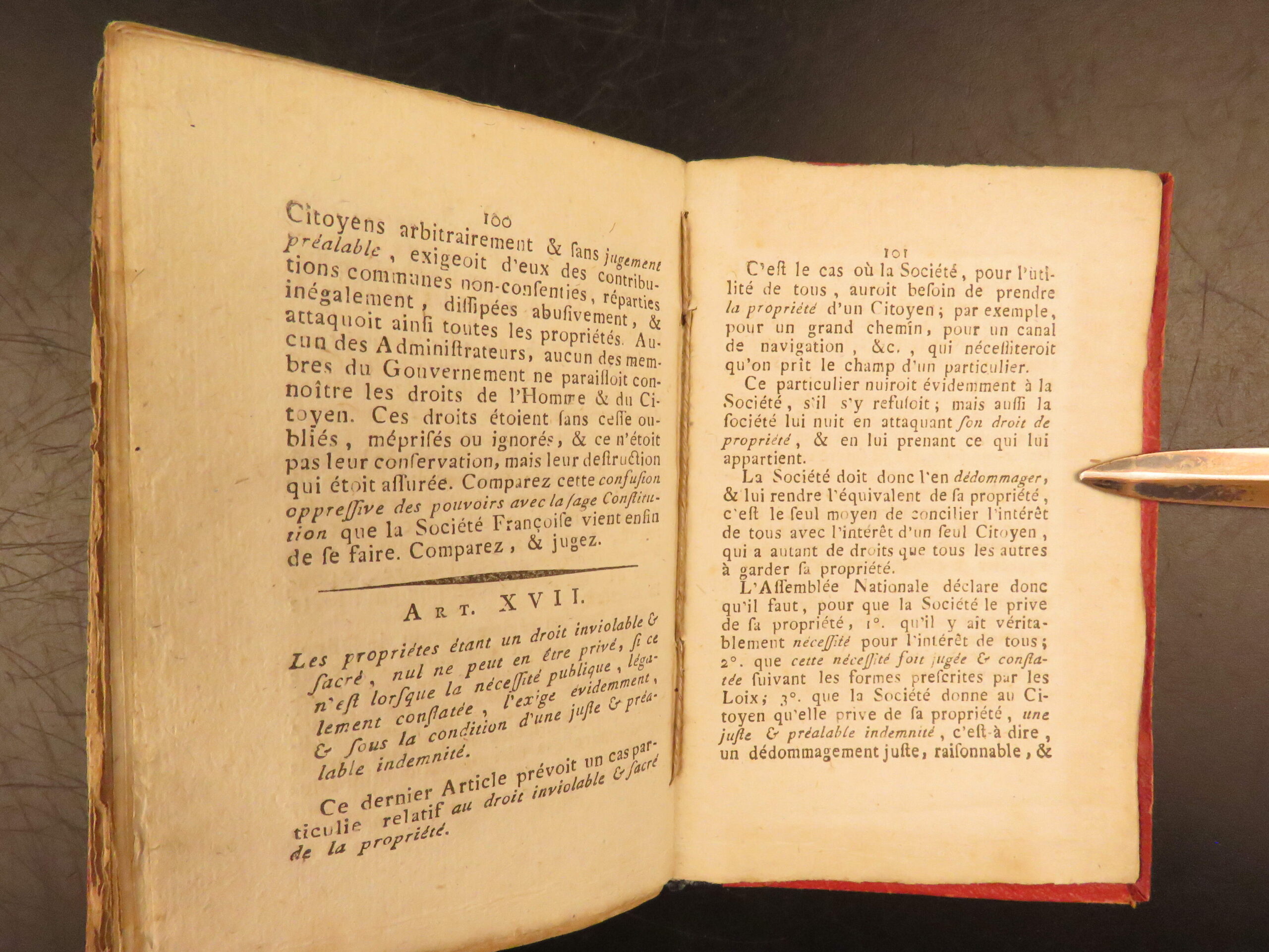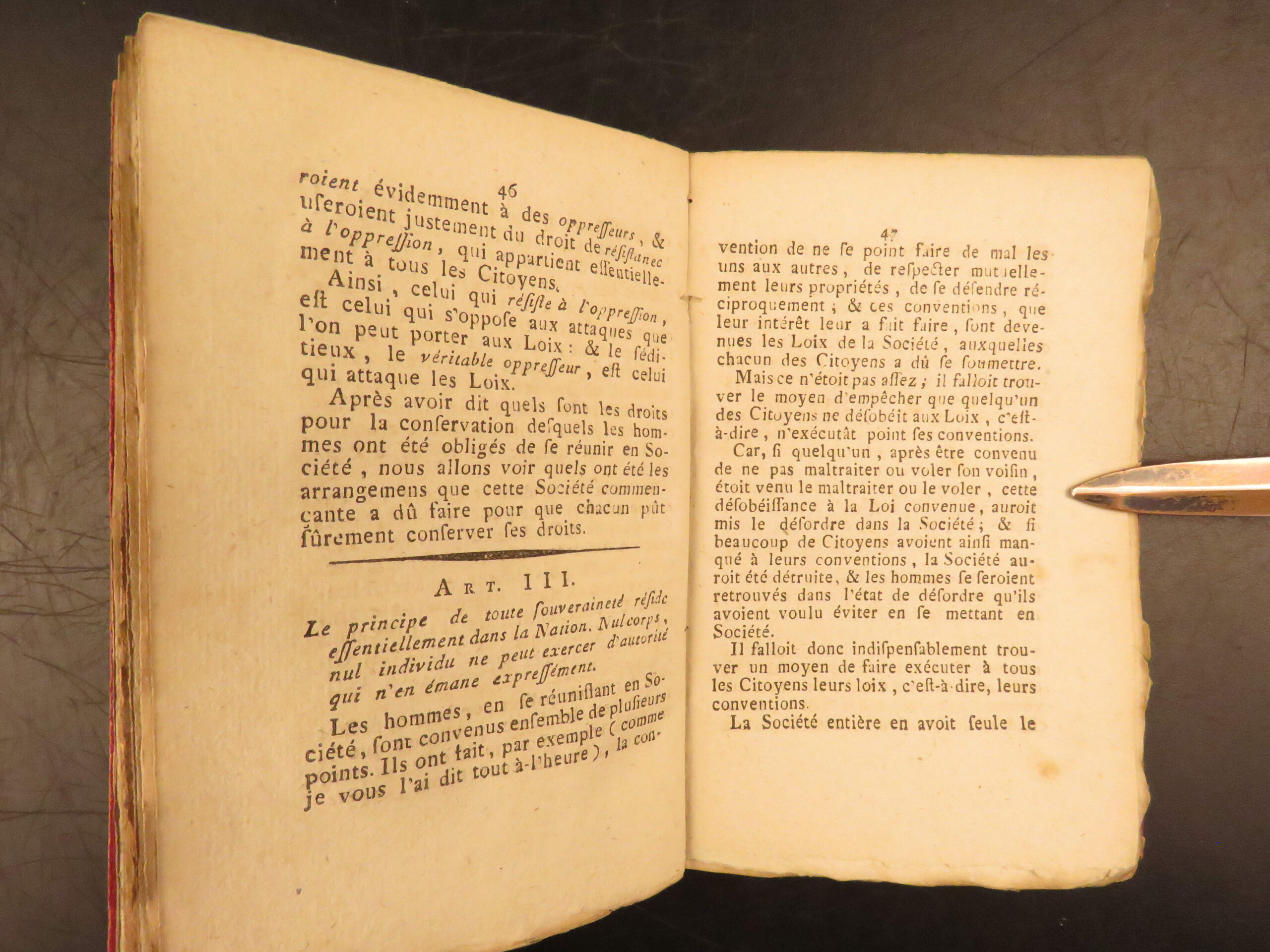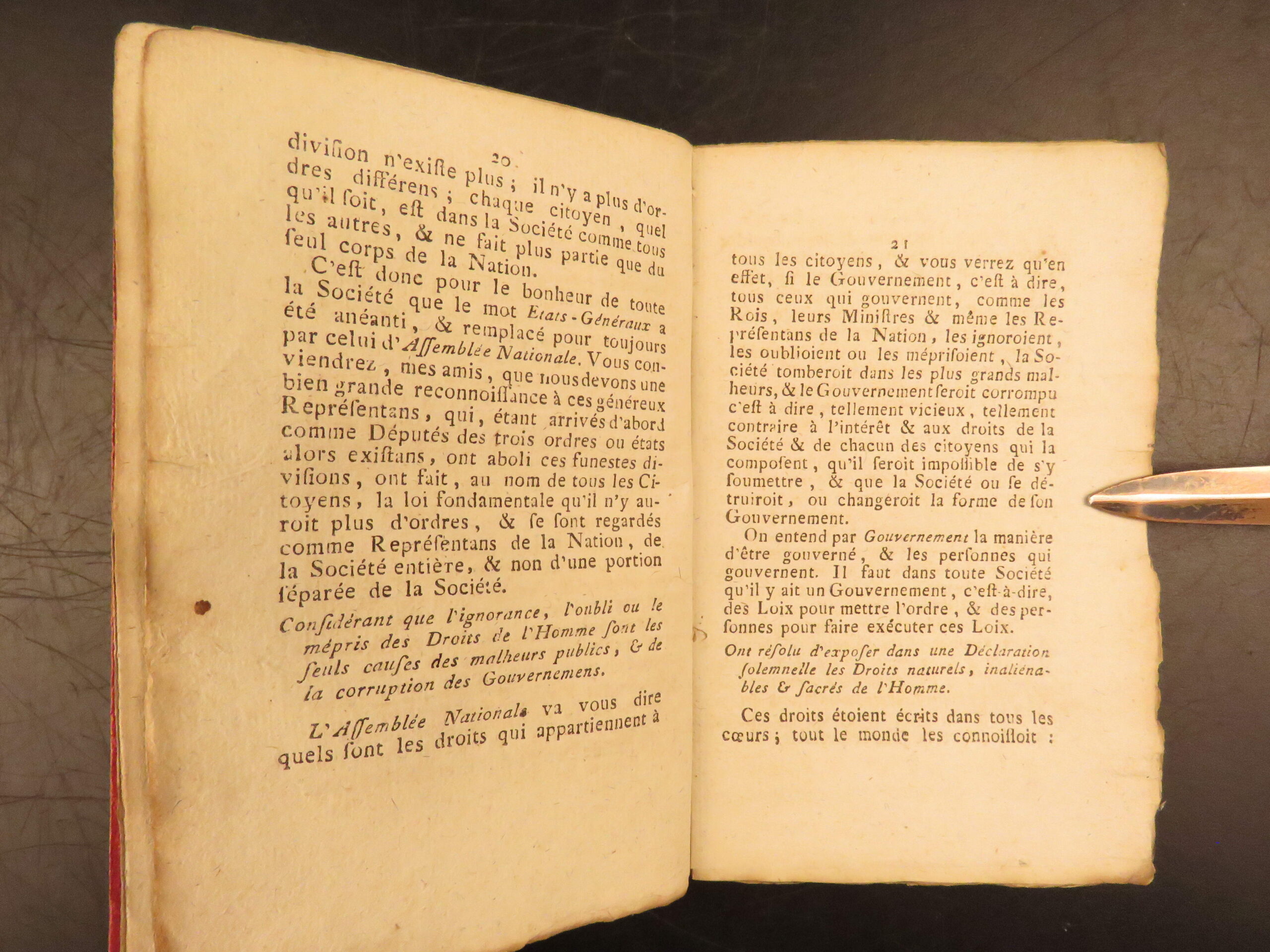 Small Lille imprint of Morel de Vindé’s 1790 commentary on the Déclaration des Droits de l’Homme et du Citoyen, expressing a royalist interpretation of revolutionary ideals.