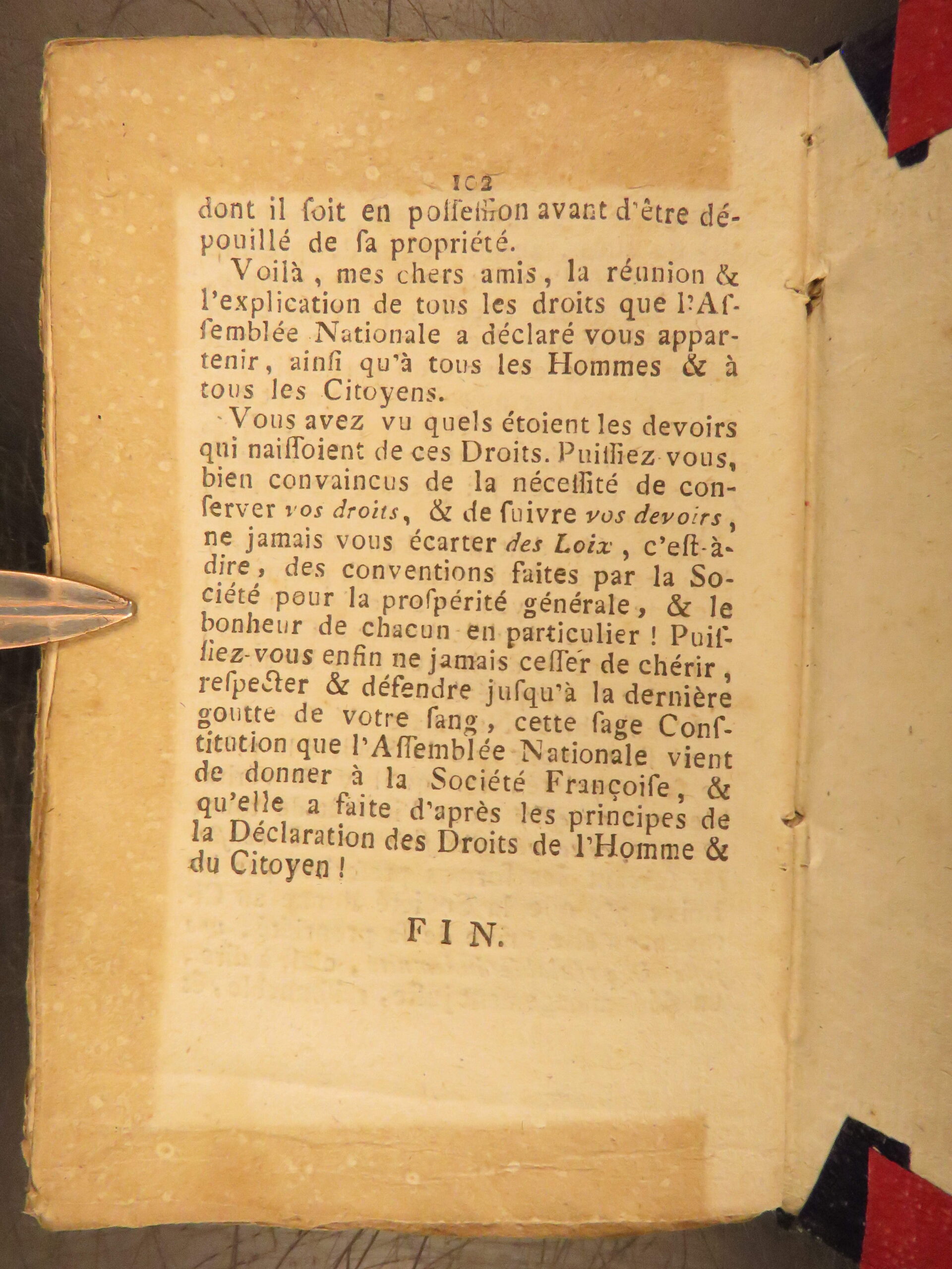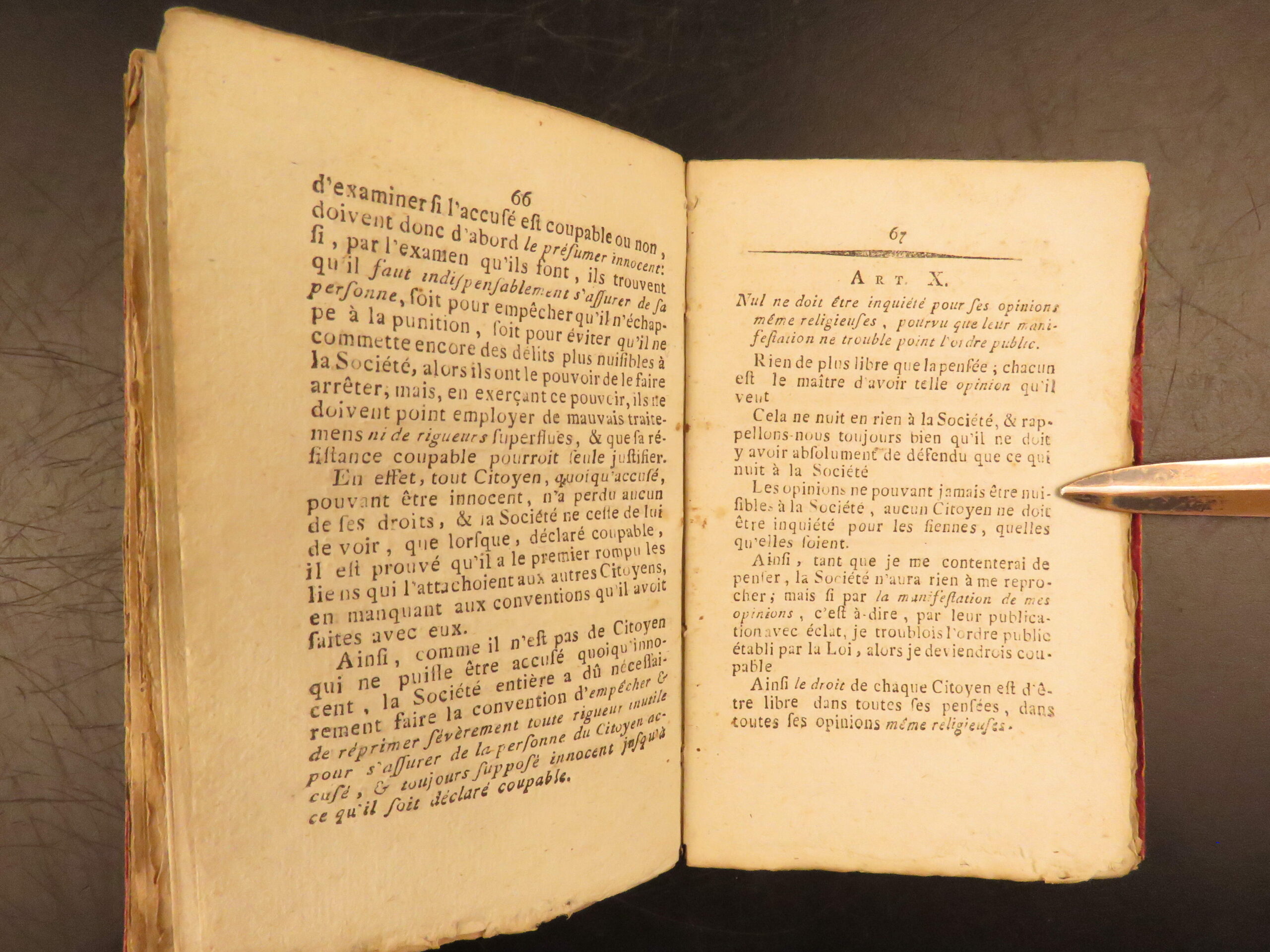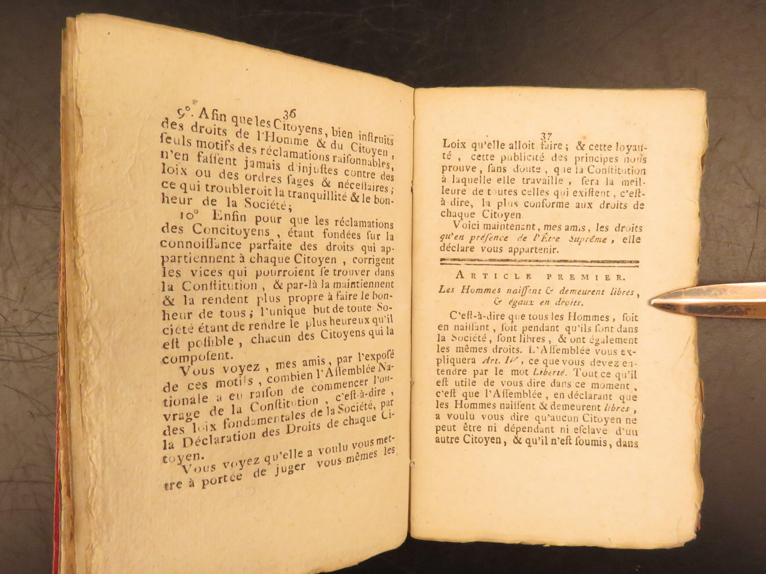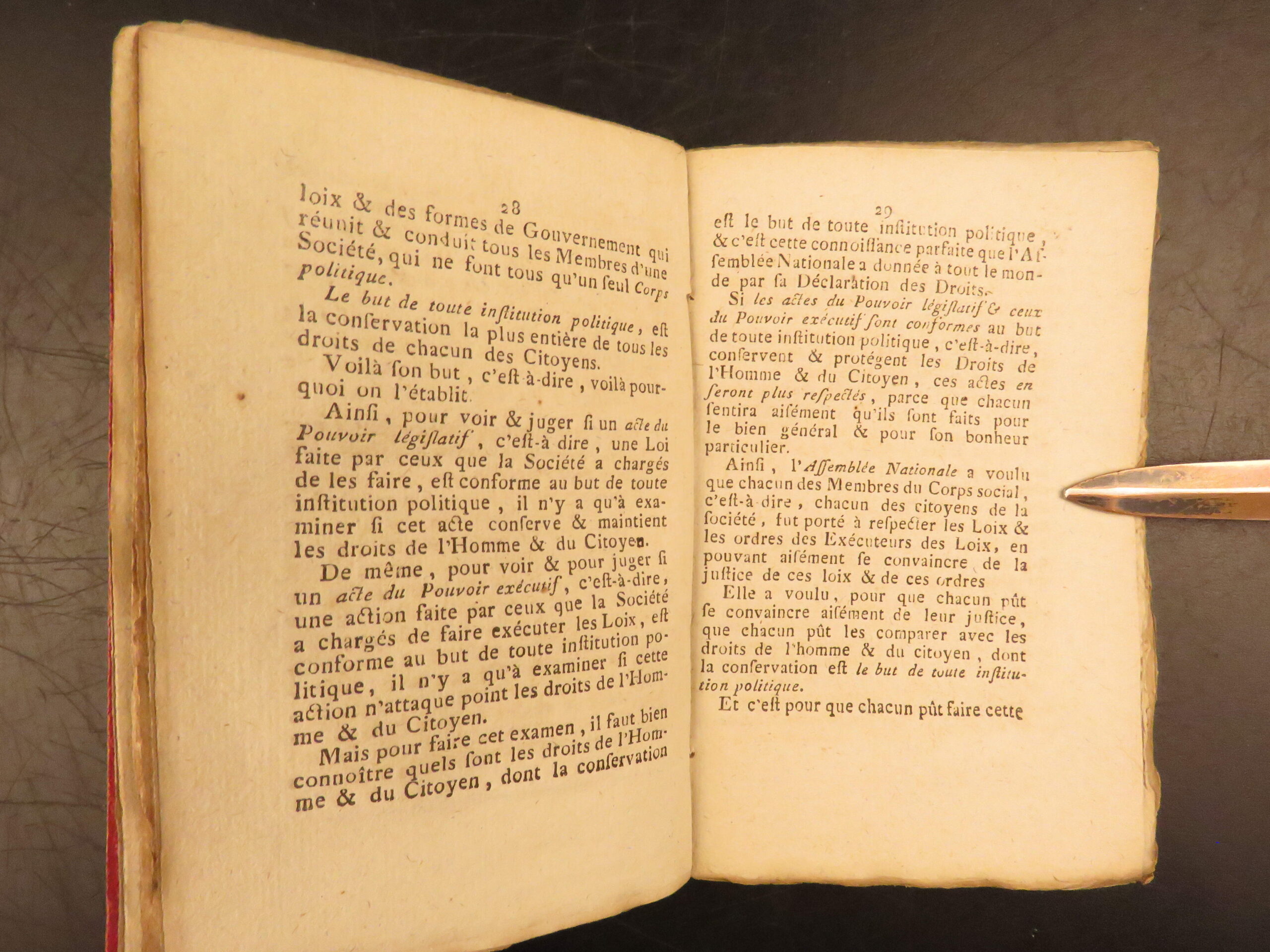 Small Lille imprint of Morel de Vindé’s 1790 commentary on the Déclaration des Droits de l’Homme et du Citoyen, expressing a royalist interpretation of revolutionary ideals.