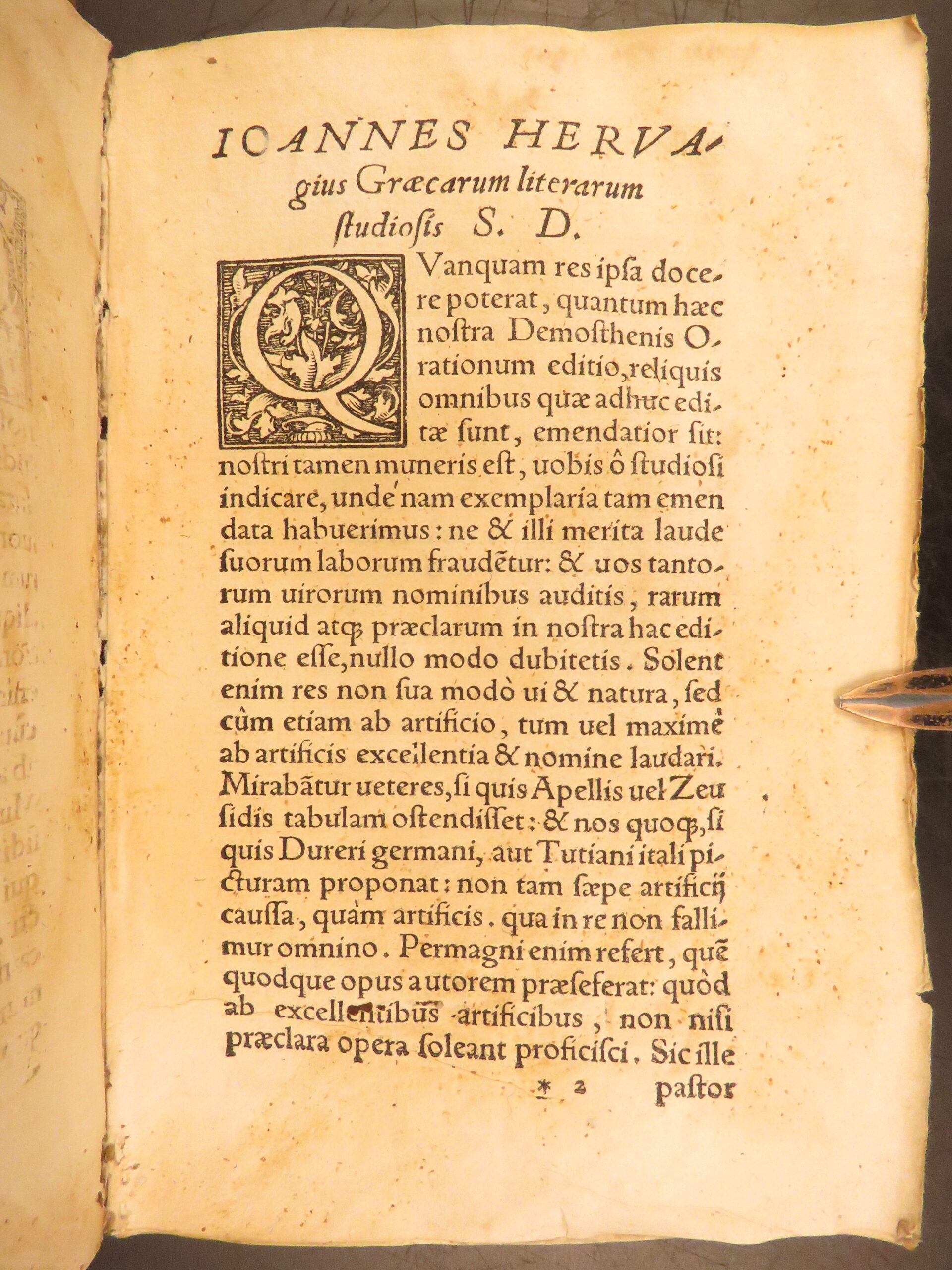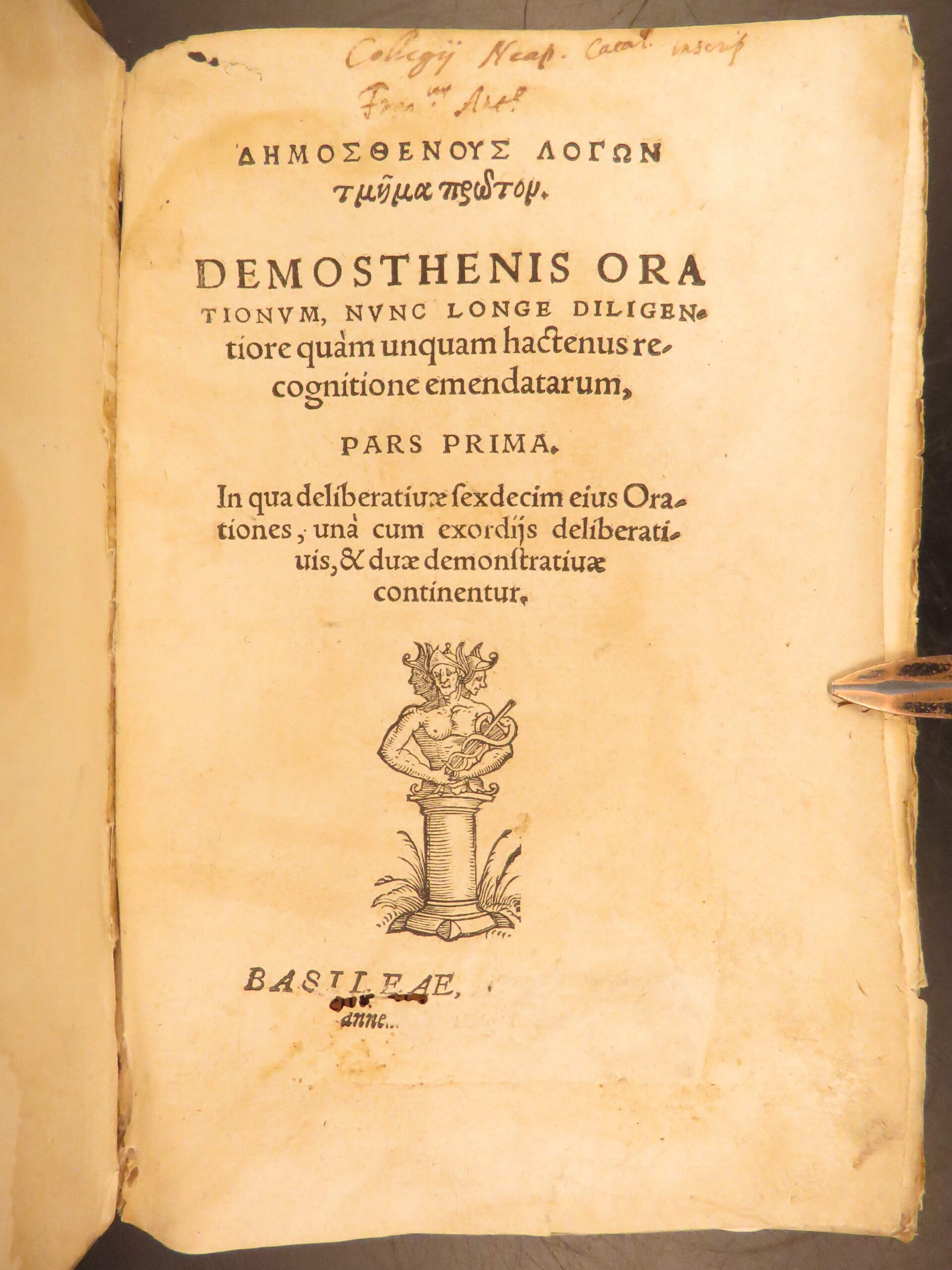 1547 Basel edition of Demosthenes’ Orationes, printed by Ioannes Heruagius, with Greek text, Latin preliminaries, and the arguments of Libanius; volume one in full vellum.