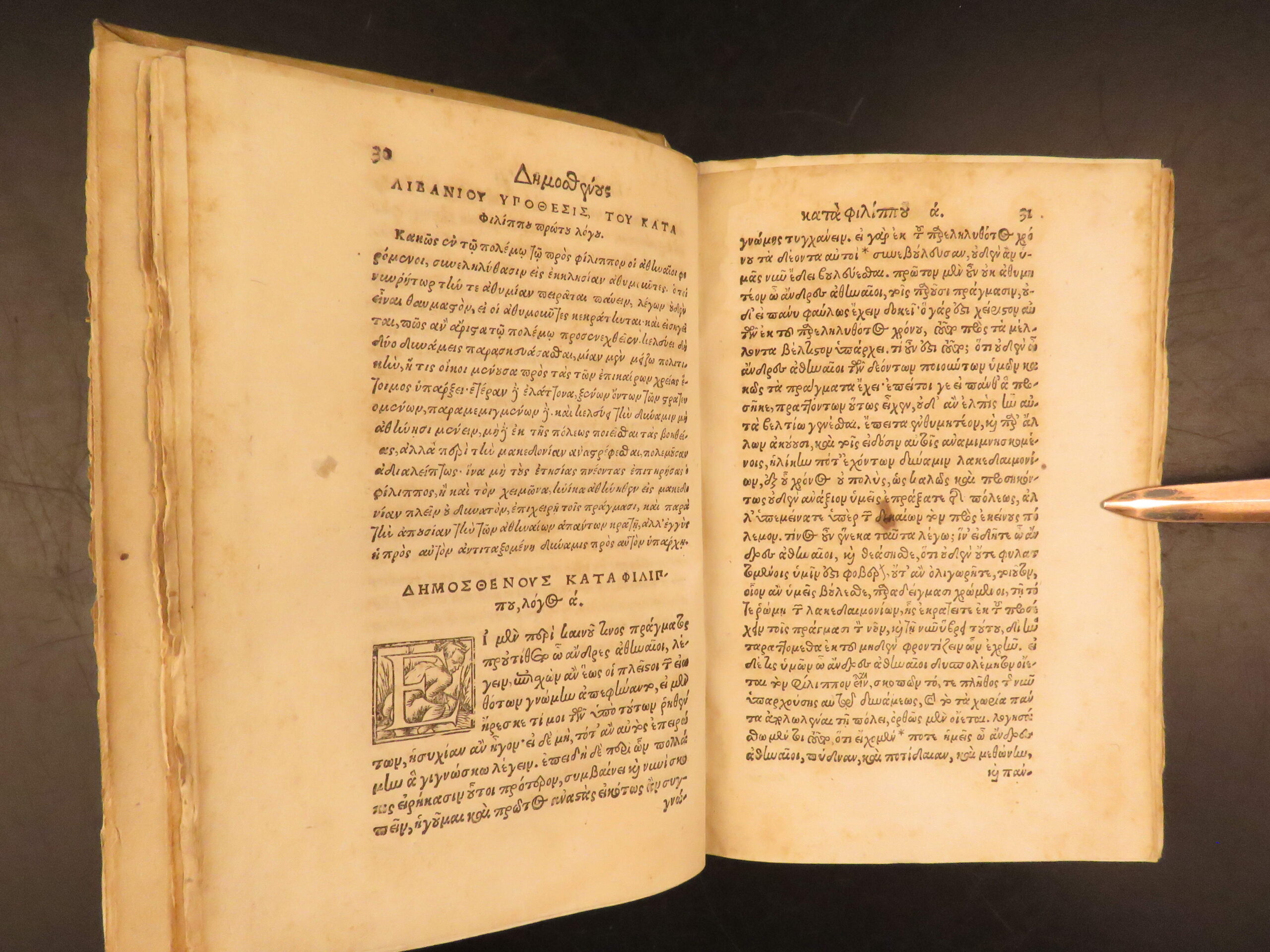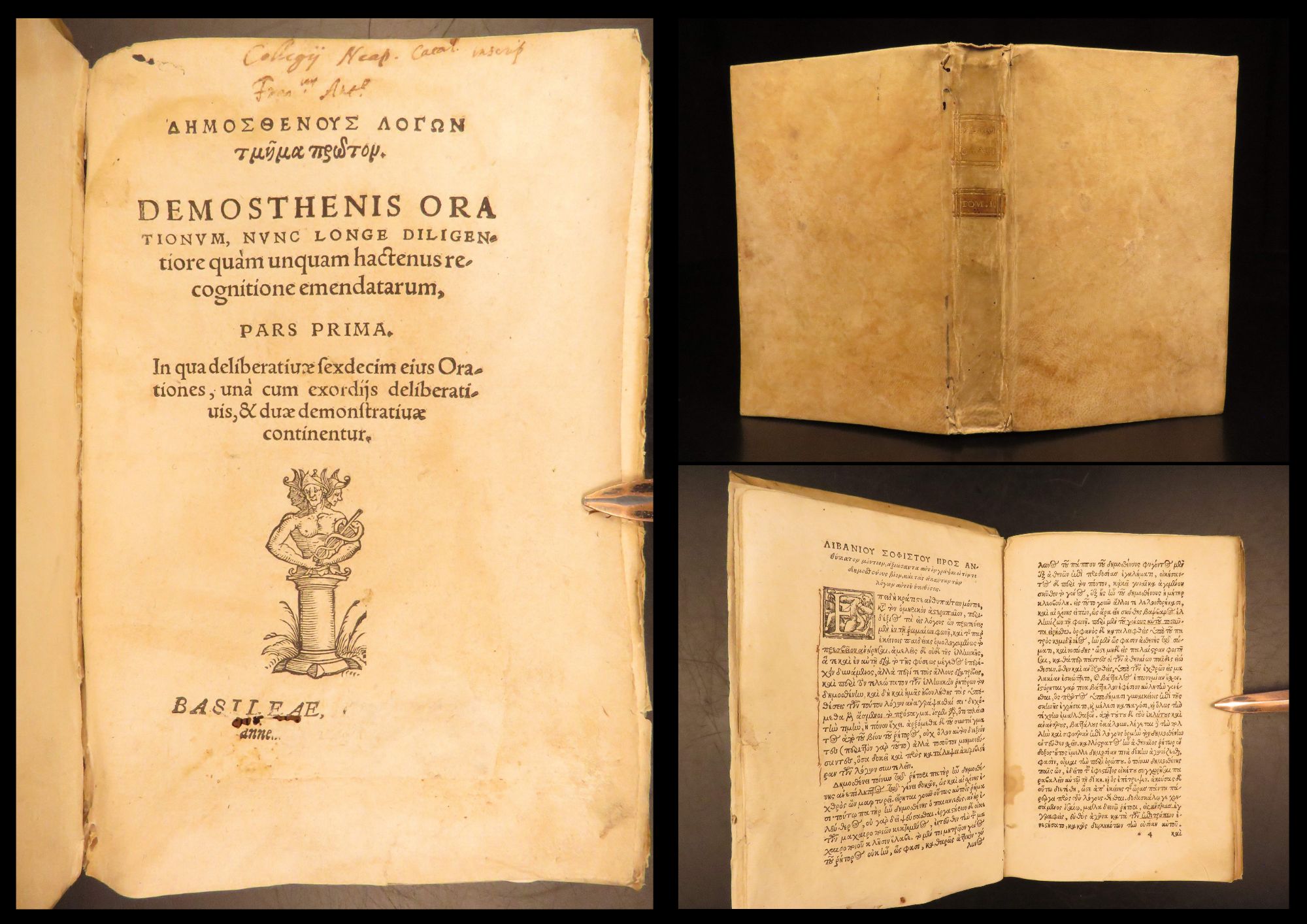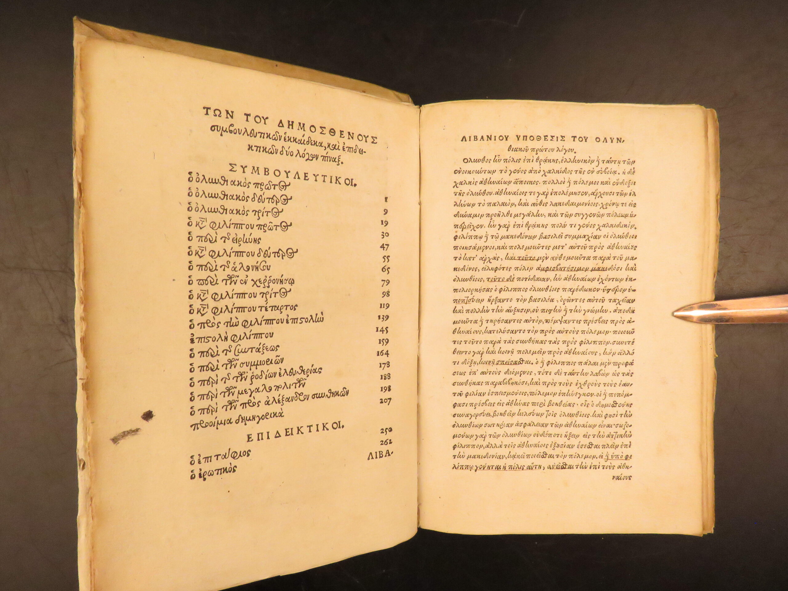 This 1547 Basel edition was published entirely in Greek and includes arguments of Libanius, a 4th-century Sophist rhetorician frequently published alongside Demosthenes in Renaissance printings.