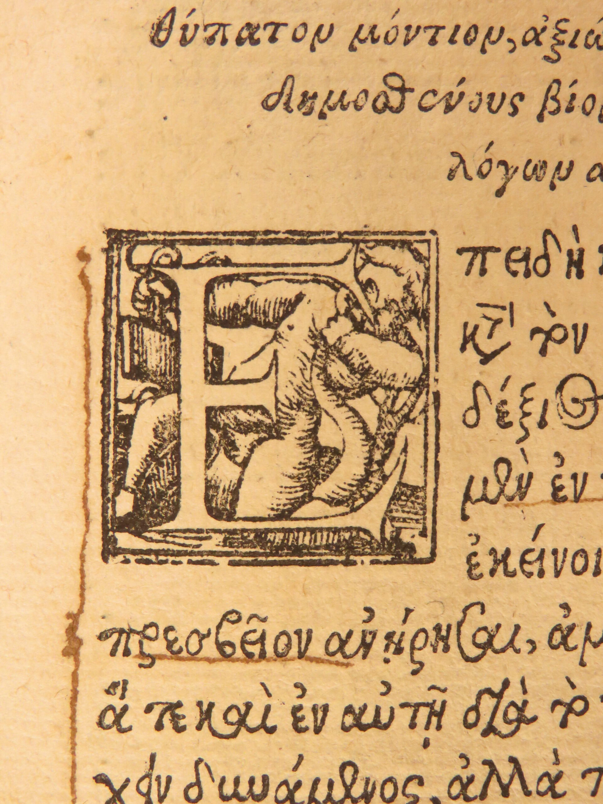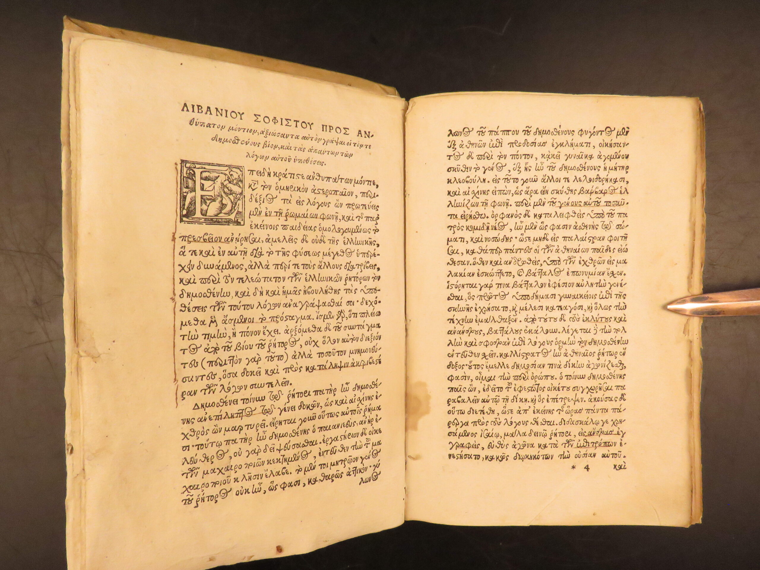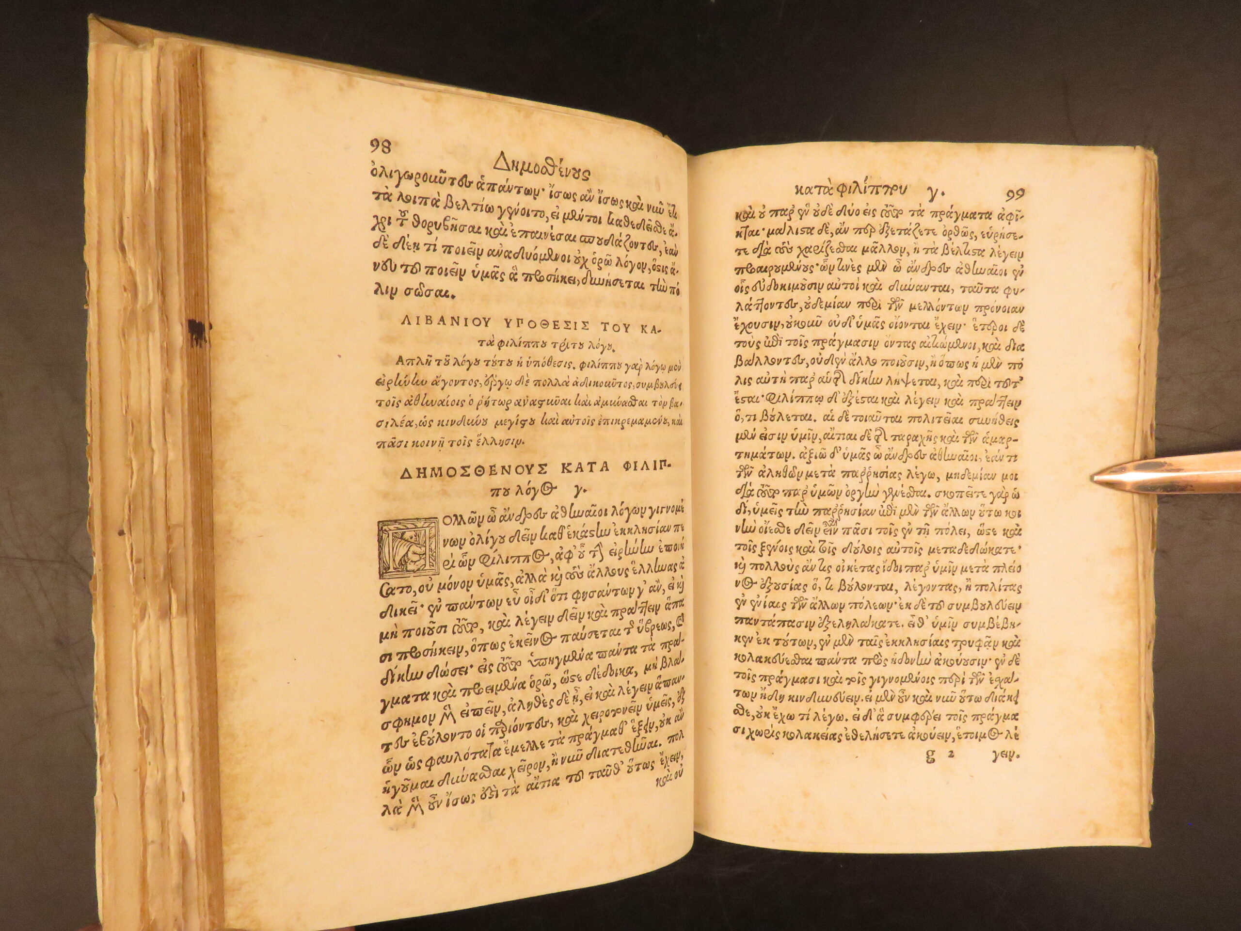 This 1547 Basel edition was published entirely in Greek and includes arguments of Libanius, a 4th-century Sophist rhetorician frequently published alongside Demosthenes in Renaissance printings.