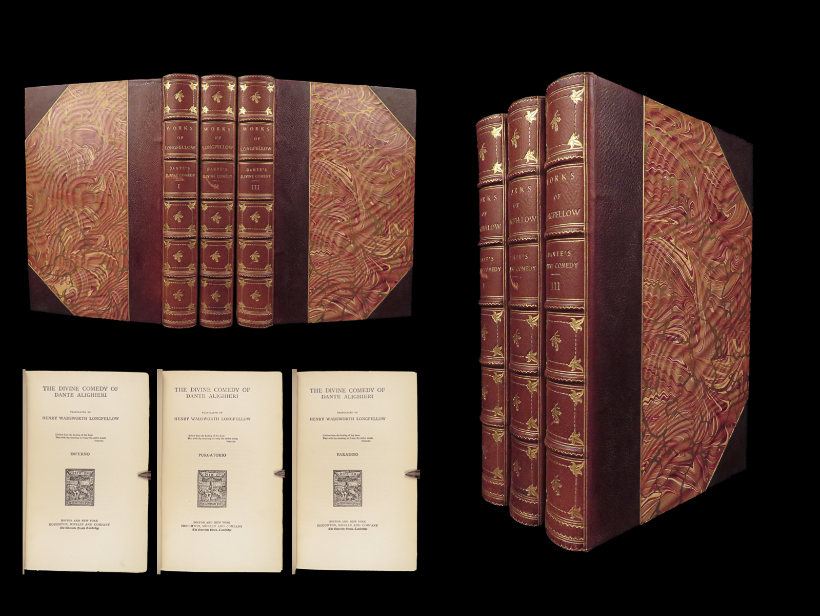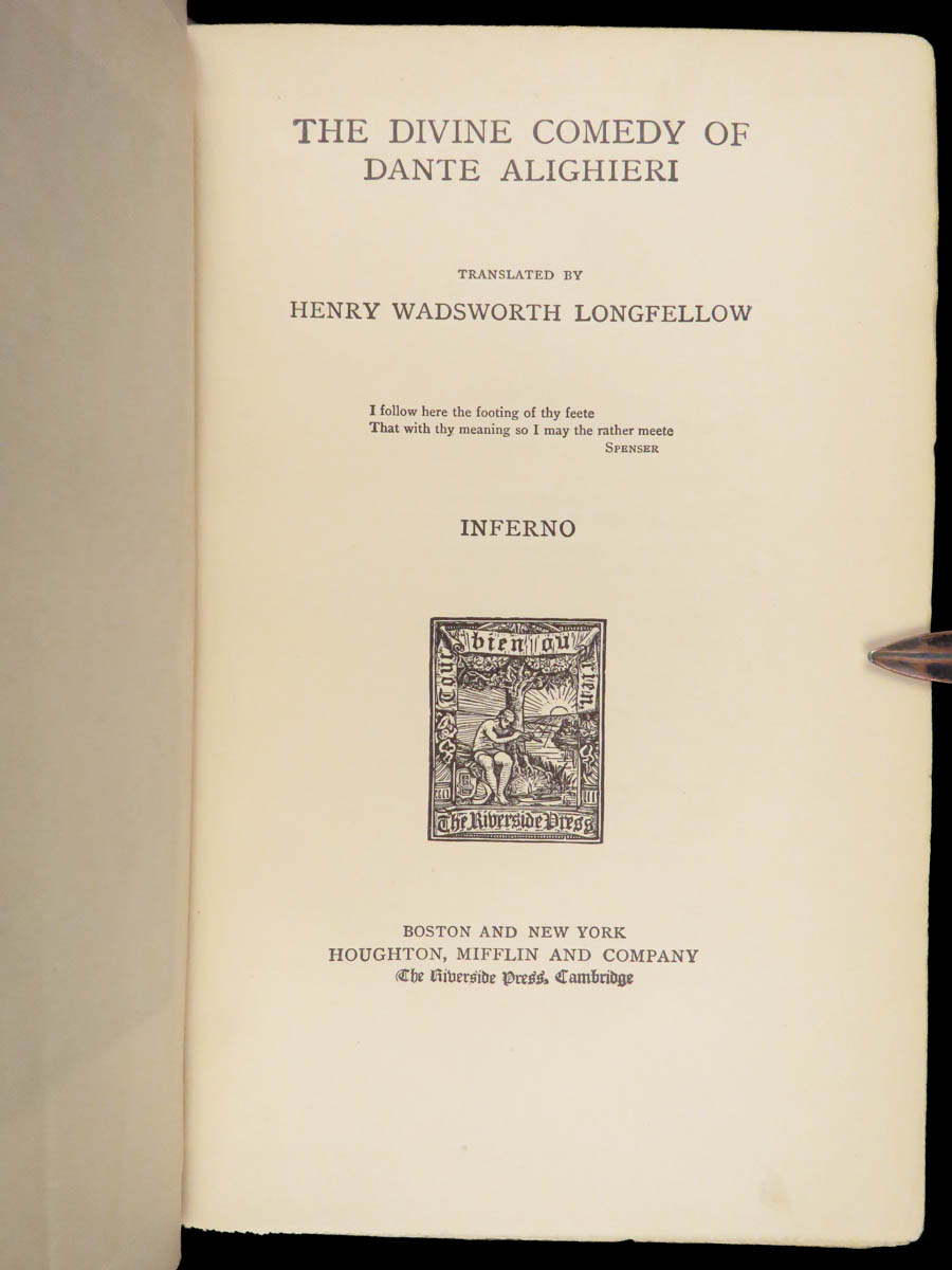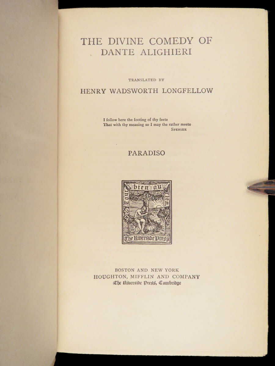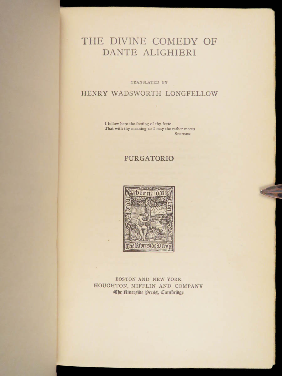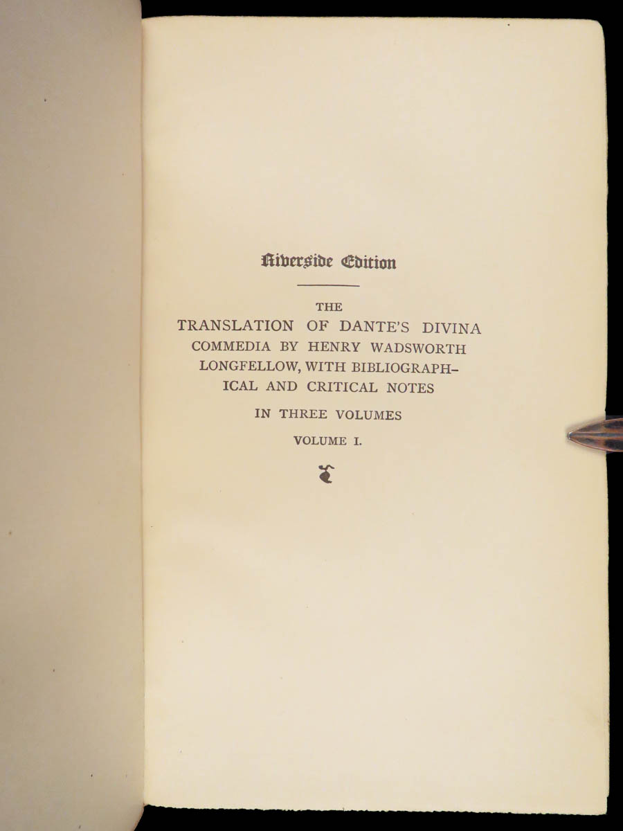 The divine comedy – dante alighieri – 1895 | longfellow english in stunning binding | henry wadsworth longfellow’s meticulous translation of dante’s <em>divine comedy</em> popularized the religious allegory among victorian readers. This cambridge riverside edition includes scholarly notes alongside all three parts in a fine leather binding.
