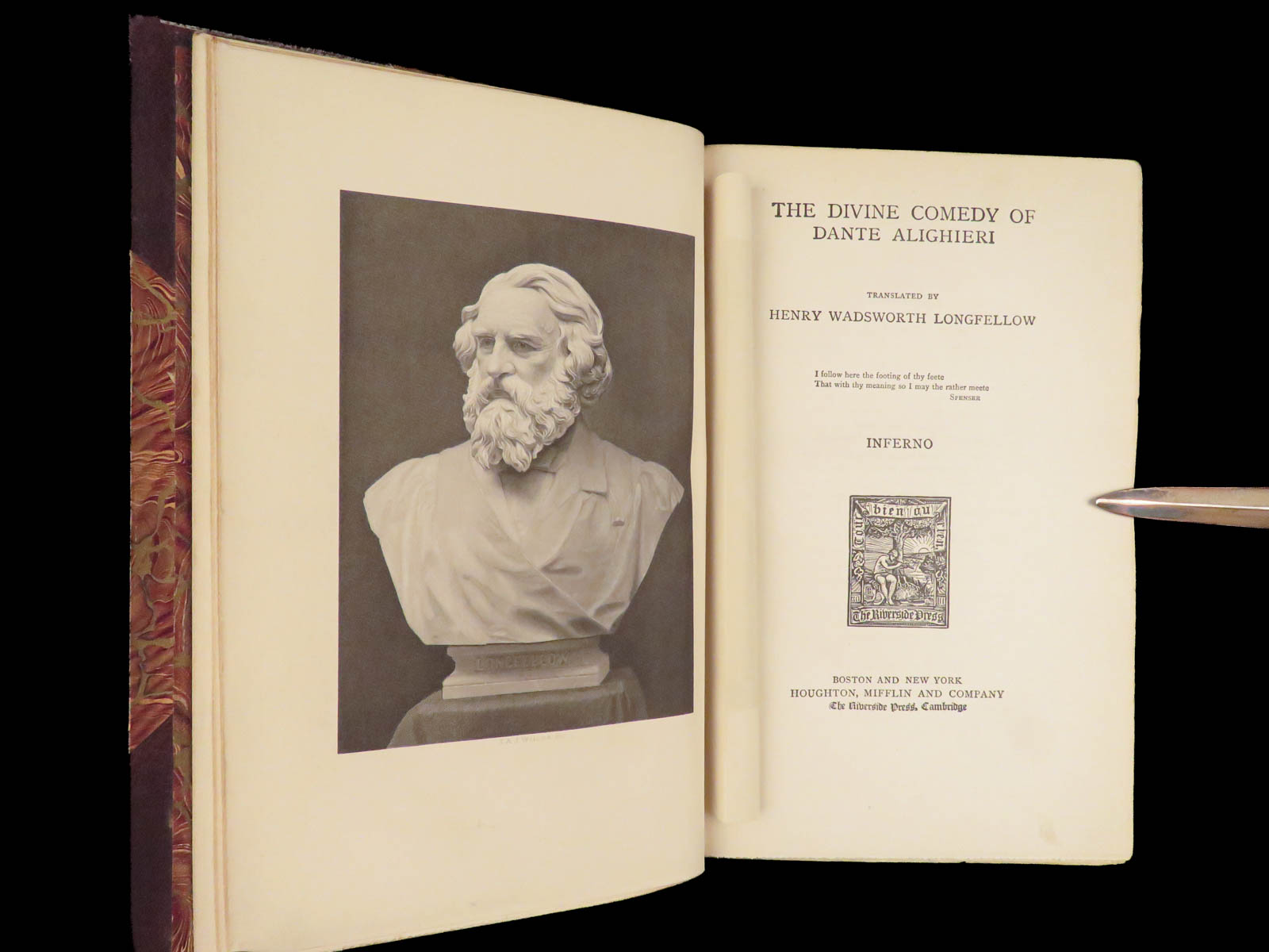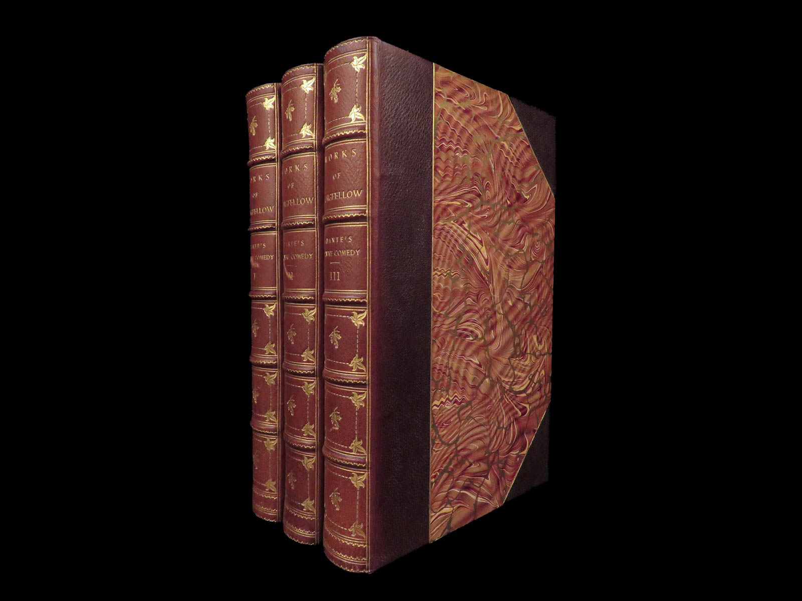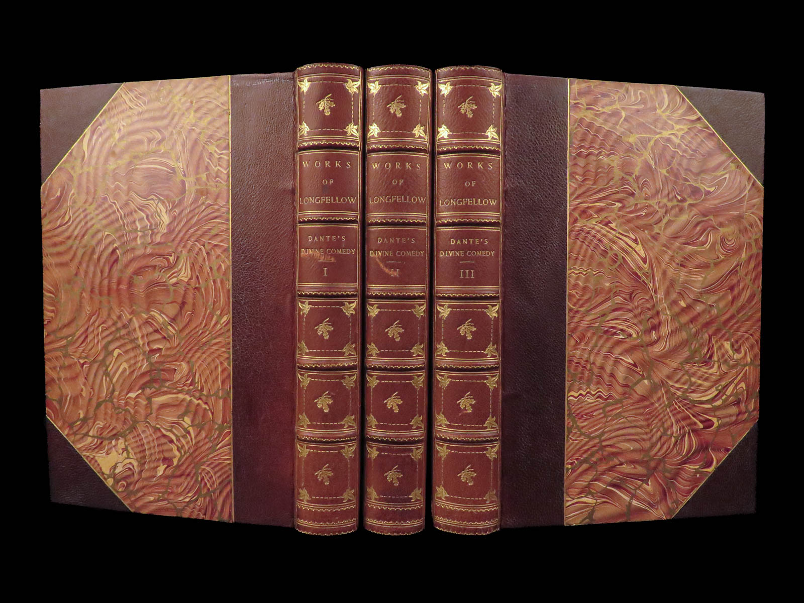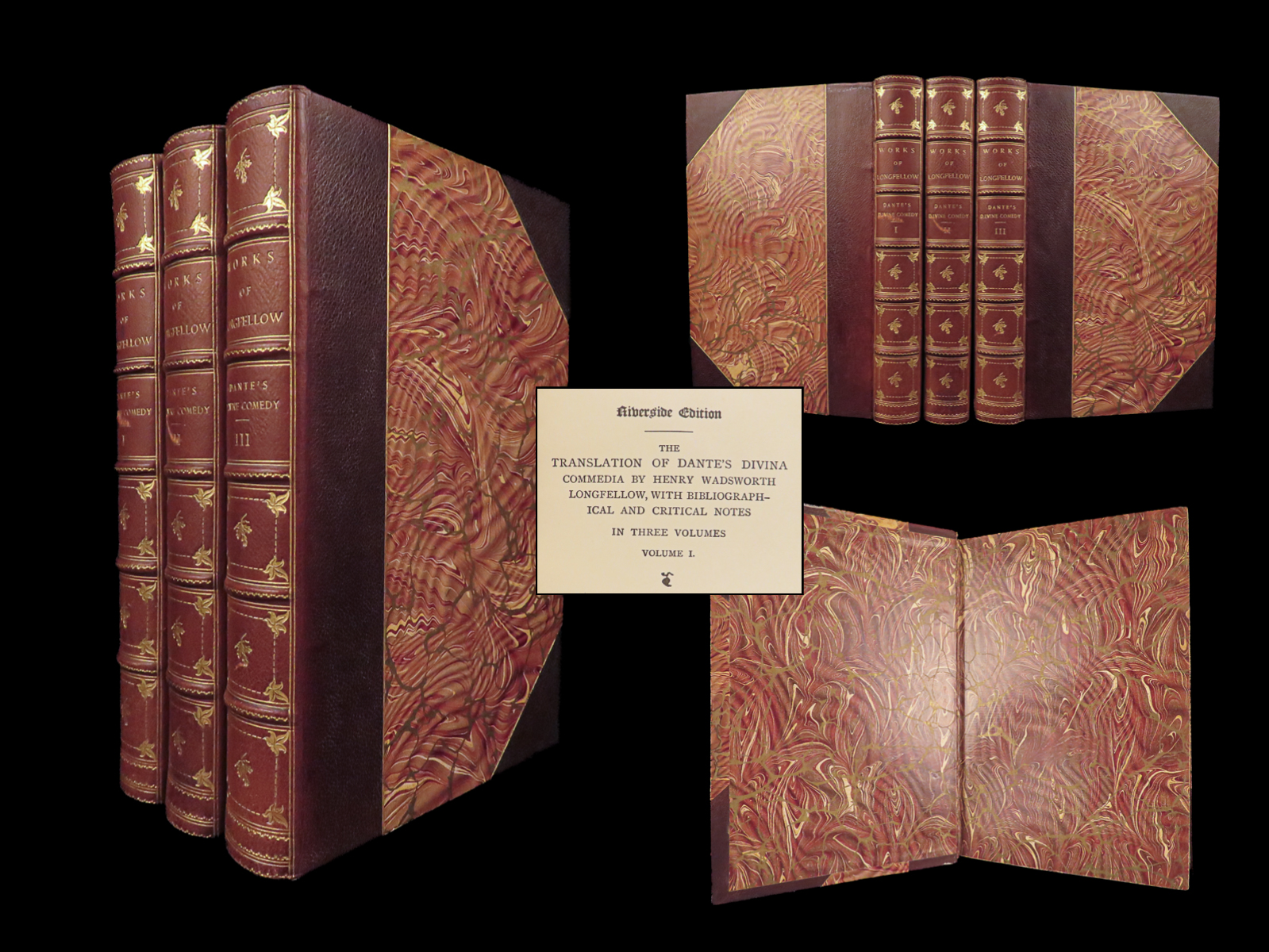The divine comedy – dante alighieri – 1895 | longfellow english in stunning binding | henry wadsworth longfellow’s meticulous translation of dante’s <em>divine comedy</em> popularized the religious allegory among victorian readers. This cambridge riverside edition includes scholarly notes alongside all three parts in a fine leather binding.