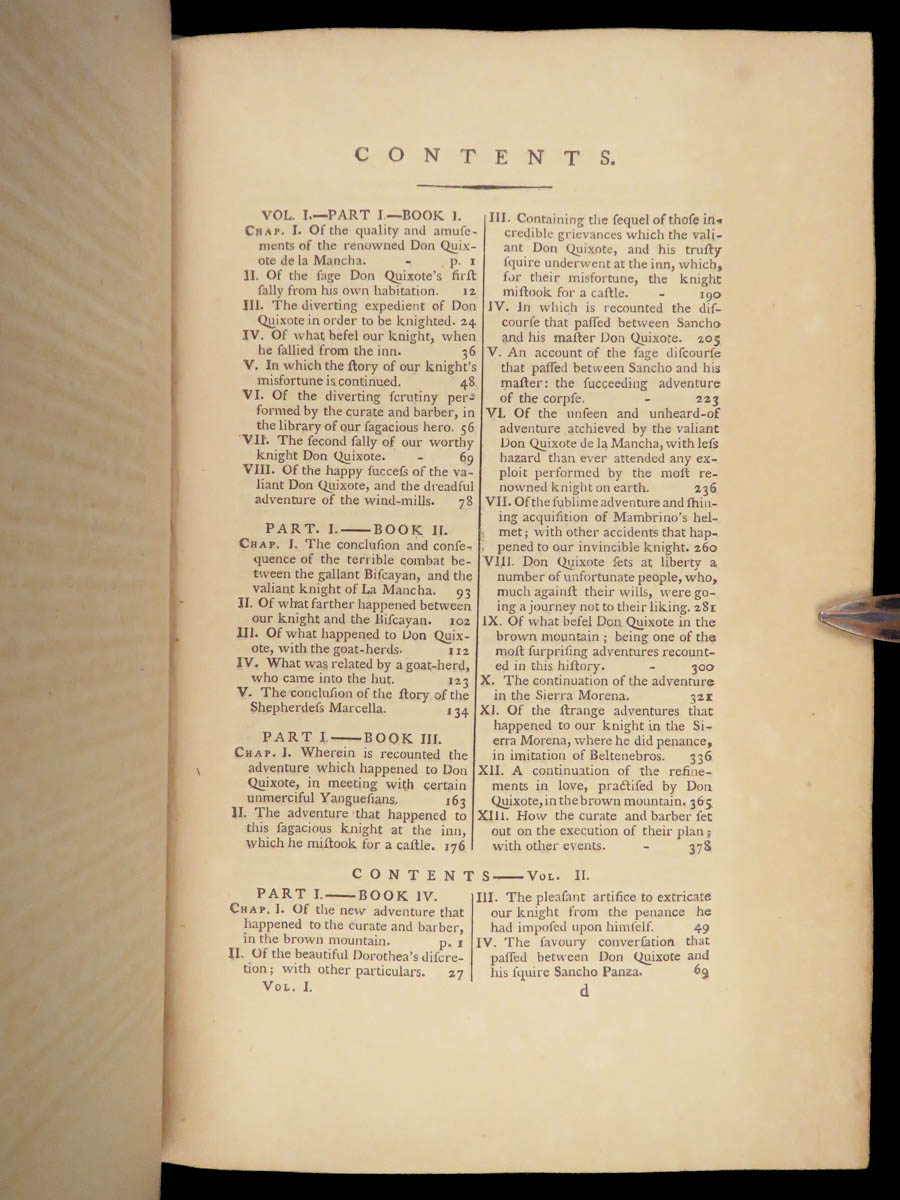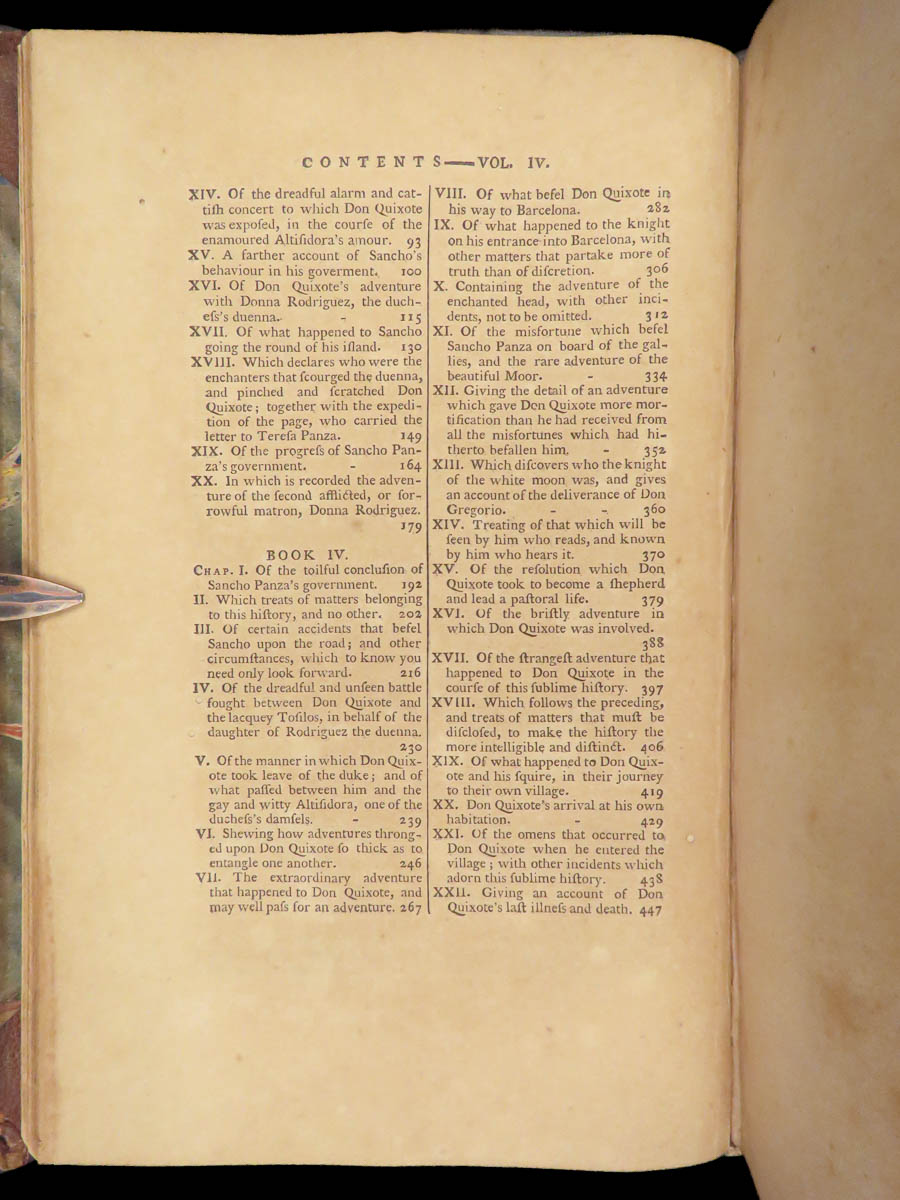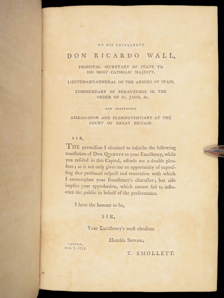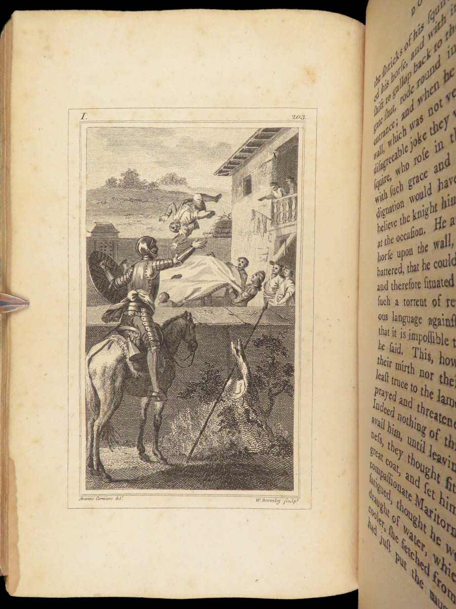 A rare, late 18th-century English translation of Cervantes’ masterpiece Don Quixote. This edition, translated by Tobias Smollett, is a first edition published in Dublin. Smollett translation, while not as popular as Jarvis printings, is still considered important. Smollett was the sixth translator to translate ‘Don Quixote’ into English. It is interesting though, many passages of this work parallel both the original Spanish and the Jarvis translation; however, some of the textual errors that Jarvis made, Smollett kept instead of changing. Because of this, the Smollett editions are also considered inaccurate or incomplete. While Smollett translations are not considered the most accurate, they are considered highly readable. Smollett was a popular author in his own right and much of the popularity of this translation was due to his previous fame, rather than quality of his translation. There is also some scholarly speculation on whether or not Smollett actually knew Spanish! (Linsalata, 115). This fine printing includes 22 incredible engravings.