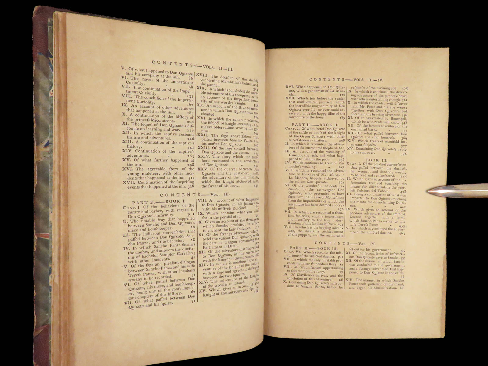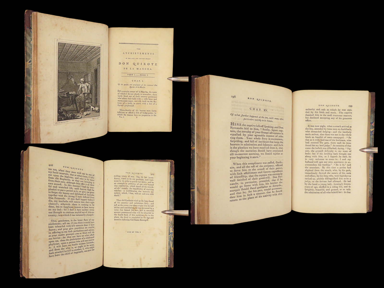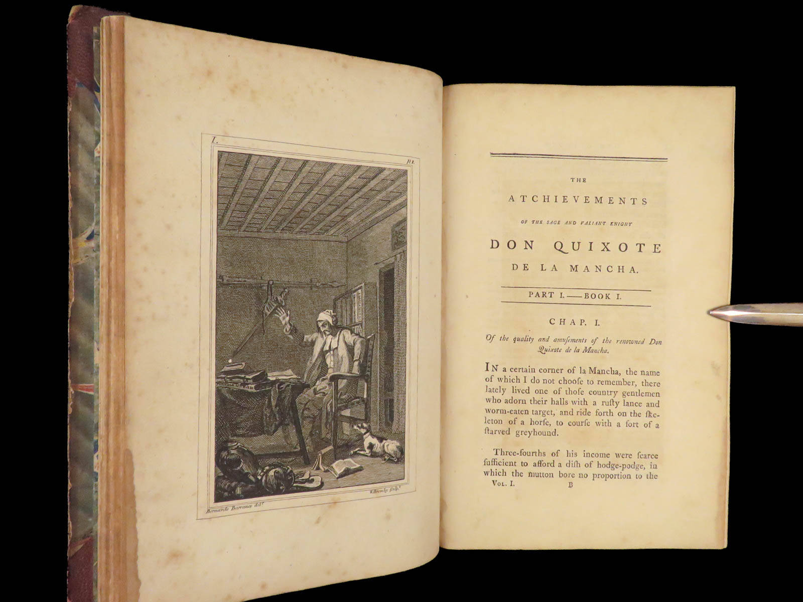 A rare, late 18th-century English translation of Cervantes’ masterpiece Don Quixote. This edition, translated by Tobias Smollett, is a first edition published in Dublin. Smollett translation, while not as popular as Jarvis printings, is still considered important. Smollett was the sixth translator to translate ‘Don Quixote’ into English. It is interesting though, many passages of this work parallel both the original Spanish and the Jarvis translation; however, some of the textual errors that Jarvis made, Smollett kept instead of changing. Because of this, the Smollett editions are also considered inaccurate or incomplete. While Smollett translations are not considered the most accurate, they are considered highly readable. Smollett was a popular author in his own right and much of the popularity of this translation was due to his previous fame, rather than quality of his translation. There is also some scholarly speculation on whether or not Smollett actually knew Spanish! (Linsalata, 115). This fine printing includes 22 incredible engravings.