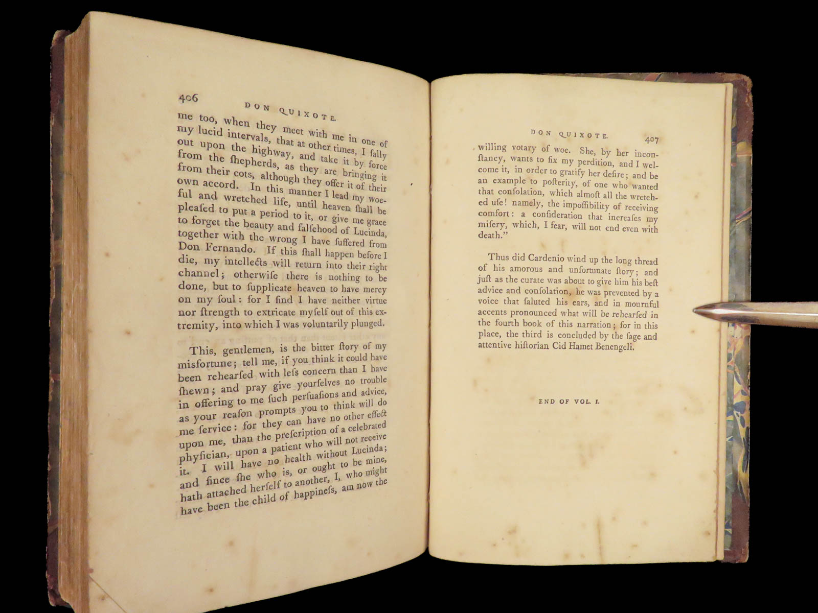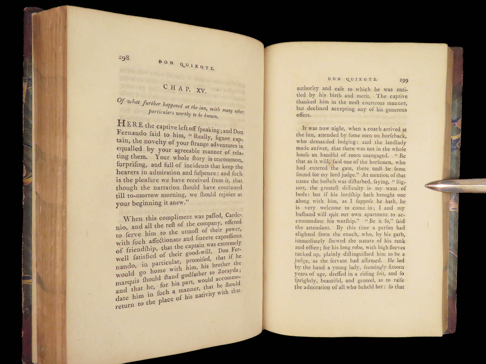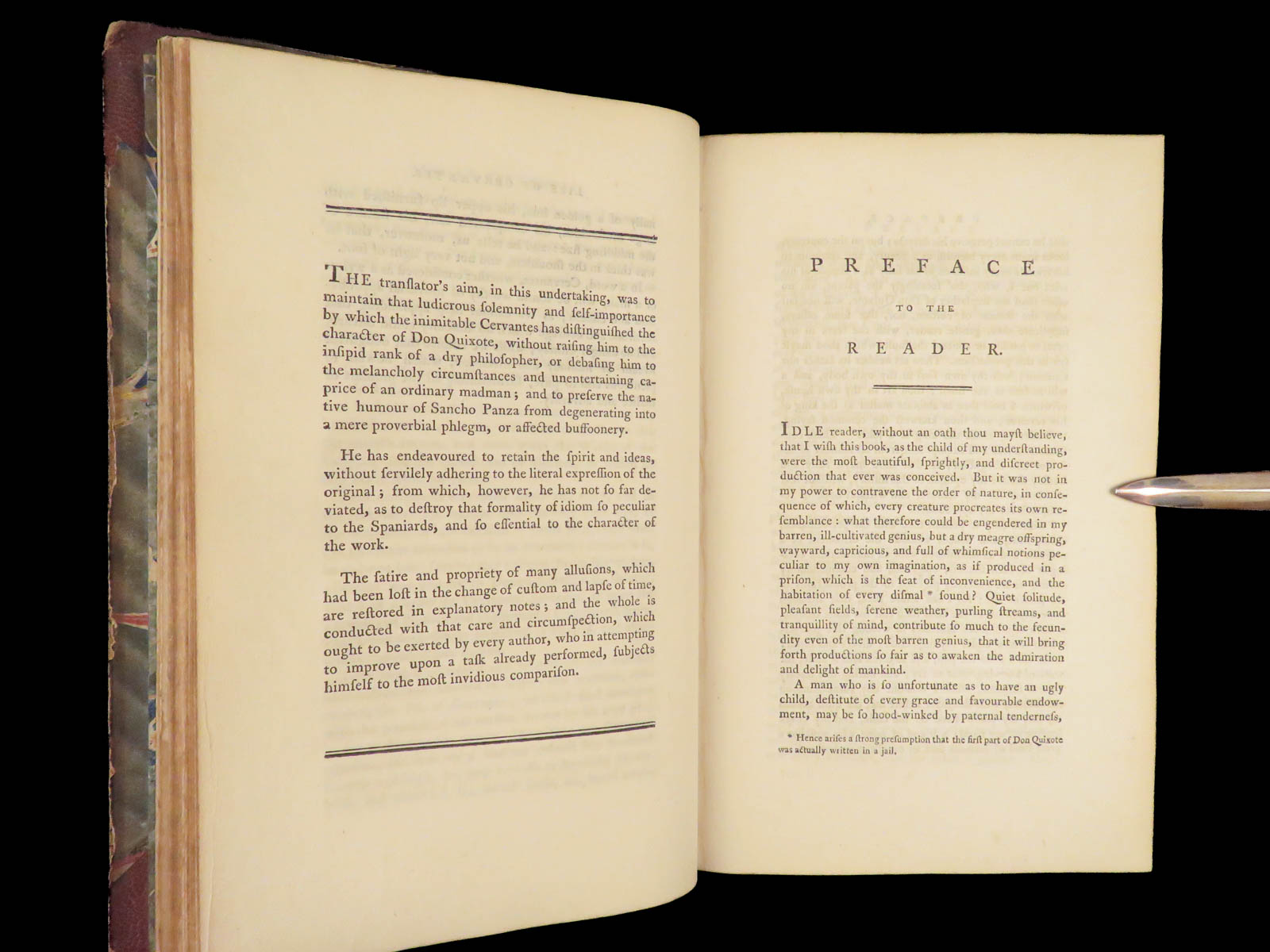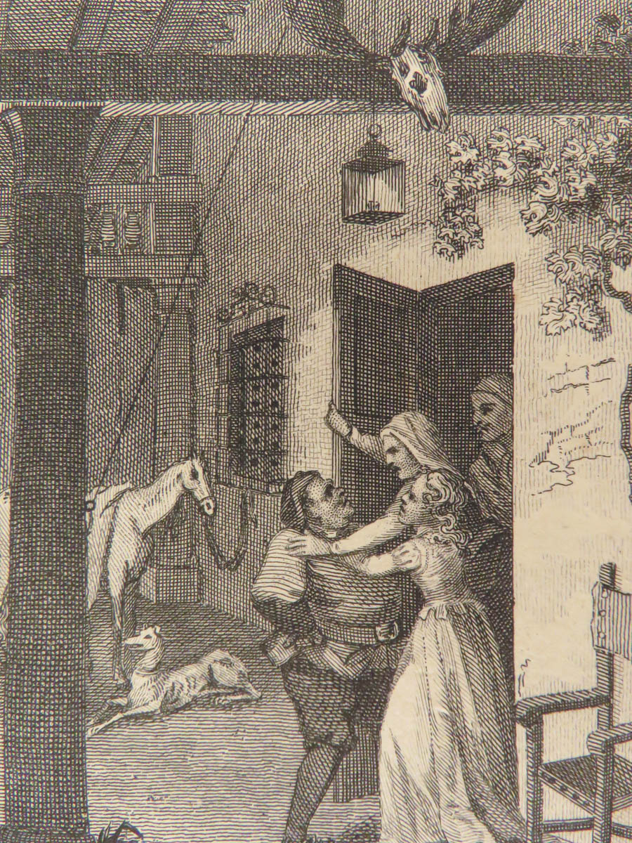 A rare, late 18th-century English translation of Cervantes’ masterpiece Don Quixote. This edition, translated by Tobias Smollett, is a first edition published in Dublin. Smollett translation, while not as popular as Jarvis printings, is still considered important. Smollett was the sixth translator to translate ‘Don Quixote’ into English. It is interesting though, many passages of this work parallel both the original Spanish and the Jarvis translation; however, some of the textual errors that Jarvis made, Smollett kept instead of changing. Because of this, the Smollett editions are also considered inaccurate or incomplete. While Smollett translations are not considered the most accurate, they are considered highly readable. Smollett was a popular author in his own right and much of the popularity of this translation was due to his previous fame, rather than quality of his translation. There is also some scholarly speculation on whether or not Smollett actually knew Spanish! (Linsalata, 115). This fine printing includes 22 incredible engravings.