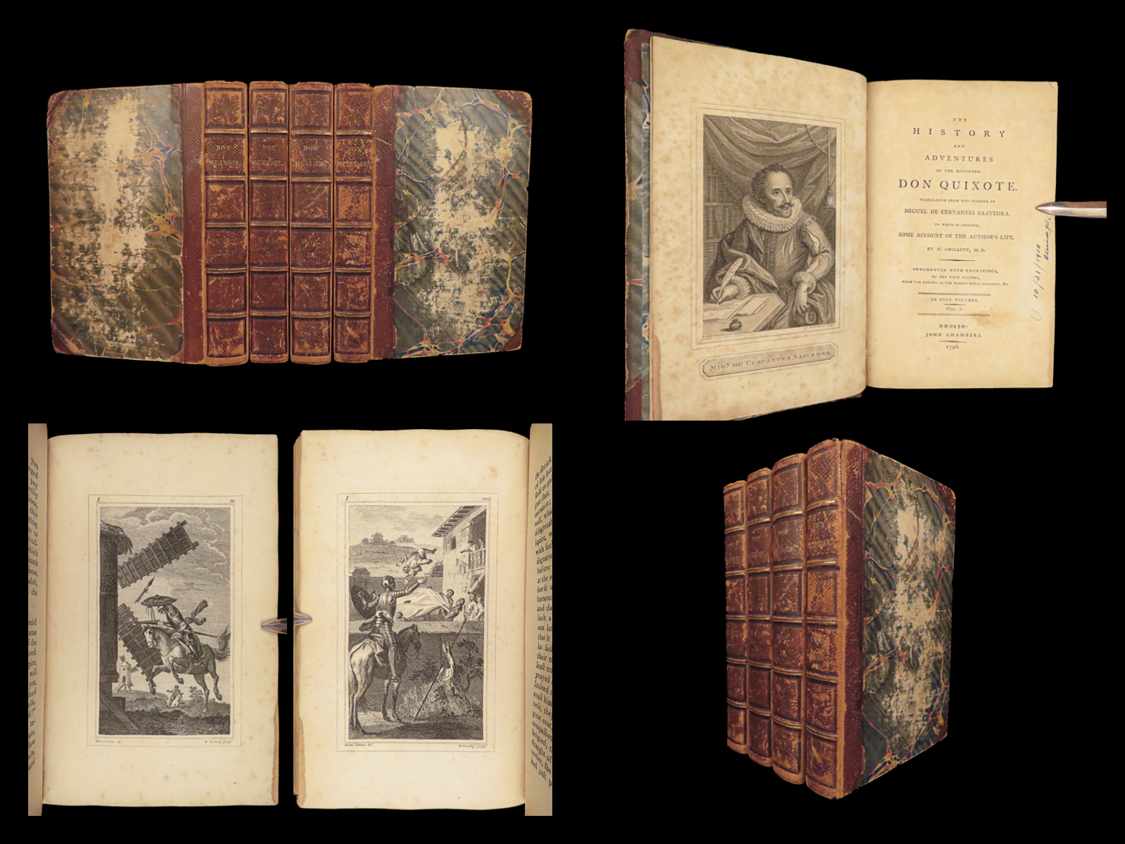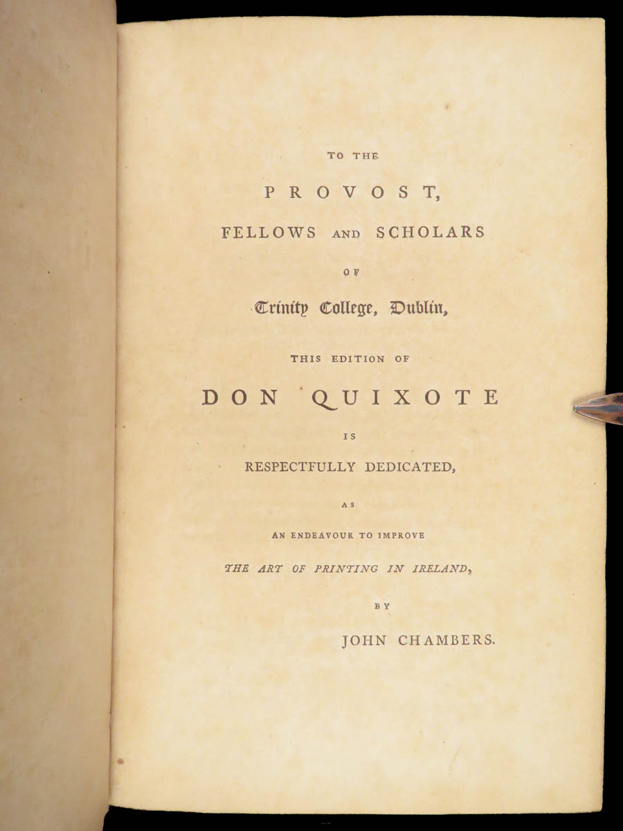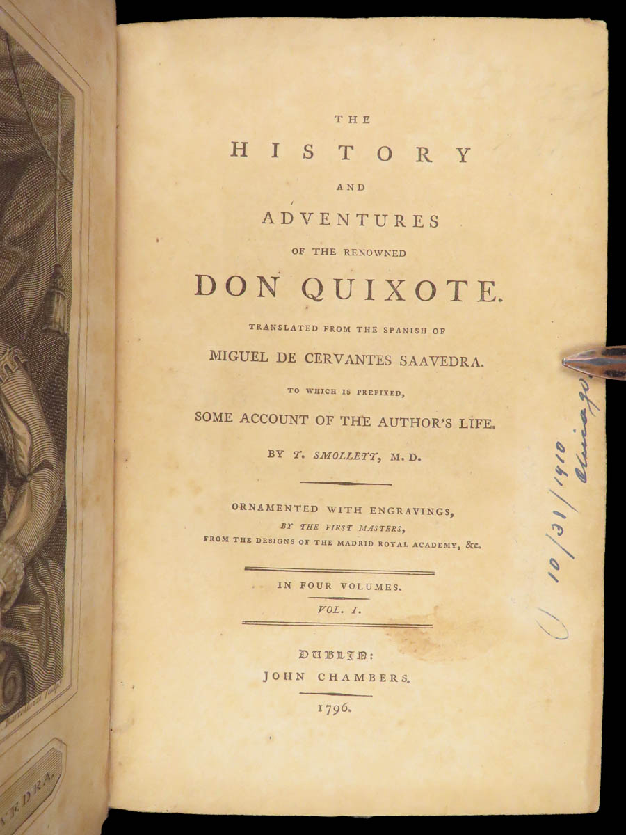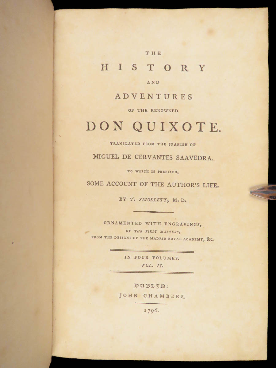 First Dublin edition of Cervantes’ Don Quixote translated by Tobias Smollett, published in 1796 in four volumes with 22 engraved plates, notable for its literary significance and eighteenth-century Irish imprint.